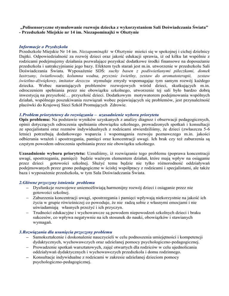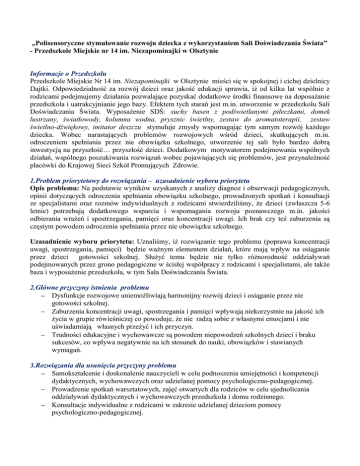 „Polisensoryczne stymulowanie rozwoju dziecka z wykorzystaniem Sali Doświadczania Świata” - Przedszkole Miejskie nr 14 im. Niezapominajki w Olsztynie Informacje o Przedszkolu Przedszkole Miejskie Nr 14 im. Niezapominajki w Olsztynie mieści się w spokojnej i cichej dzielnicy Dajtki. Odpowiedzialność za rozwój dzieci oraz jakość edukacji sprawia, iż od kilku lat wspólnie z rodzicami podejmujemy działania pozwalające pozyskać dodatkowe środki finansowe na doposażanie przedszkola i uatrakcyjnianie jego bazy. Efektem tych starań jest m.in. utworzenie w przedszkolu Sali Doświadczania Świata. Wyposażenie SDŚ: suchy basen z podświetlanymi piłeczkami, domek lustrzany, światłowody, kolumna wodna, prysznic świetlny, zestaw do aromatoterapii, zestaw świetlno-dźwiękowy, imitator deszczu stymuluje zmysły wspomagając tym samym rozwój każdego dziecka. Wobec narastających problemów rozwojowych wśród dzieci, skutkujących m.in. odroczeniem spełniania przez nie obowiązku szkolnego, utworzenie tej sali było bardzo dobrą inwestycją na przyszłość… przyszłość dzieci. Dodatkowym motywatorem podejmowania wspólnych działań, wspólnego poszukiwania rozwiązań wobec pojawiających się problemów, jest przynależność placówki do Krajowej Sieci Szkół Promujących Zdrowie. 1.Problem priorytetowy do rozwiązania – uzasadnienie wyboru priorytetu Opis problemu: Na podstawie wyników uzyskanych z analizy diagnoz i obserwacji pedagogicznych, opinii dotyczących odroczenia spełniania obowiązku szkolnego, prowadzonych spotkań i konsultacji ze specjalistami oraz rozmów indywidualnych z rodzicami stwierdziliśmy, że dzieci (zwłaszcza 5-6 letnie) potrzebują dodatkowego wsparcia i wspomagania rozwoju poznawczego m.in. jakości odbierania wrażeń i spostrzegania, pamięci oraz koncentracji uwagi. Ich brak czy też zaburzenia są częstym powodem odroczenia spełniania przez nie obowiązku szkolnego. Uzasadnienie wyboru priorytetu: Uznaliśmy, iż rozwiązanie tego problemu (poprawa koncentracji uwagi, spostrzegania, pamięci) będzie ważnym elementem działań, które mają wpływ na osiąganie przez dzieci gotowości szkolnej. Służyć temu będzie nie tylko różnorodność oddziaływań podejmowanych przez grono pedagogiczne w ścisłej współpracy z rodzicami i specjalistami, ale także baza i wyposażenie przedszkola, w tym Sala Doświadczania Świata. 2.Główne przyczyny istnienia problemu Dysfunkcje rozwojowe uniemożliwiają harmonijny rozwój dzieci i osiąganie przez nie gotowości szkolnej. Zaburzenia koncentracji uwagi, spostrzegania i pamięci wpływają niekorzystnie na jakość ich życia w grupie rówieśniczej co powoduje, że nie radzą sobie z własnymi emocjami i nie uświadamiają własnych przeżyć i ich przyczyn. Trudności edukacyjne i wychowawcze są powodem niepowodzeń szkolnych dzieci i braku sukcesów, co wpływa negatywnie na ich stosunek do nauki, obowiązków i stawianych wymagań. 3.Rozwiązania dla usunięcia przyczyny problemu Samokształcenie i doskonalenie nauczycieli w celu podnoszenia umiejętności i kompetencji dydaktycznych, wychowawczych oraz udzielanej pomocy psychologiczno-pedagogicznej. Prowadzenie spotkań warsztatowych, zajęć otwartych dla rodziców w celu ujednolicania oddziaływań dydaktycznych i wychowawczych przedszkola i domu rodzinnego. Konsultacje indywidualne z rodzicami w zakresie udzielanej dzieciom pomocy psychologiczno-pedagogicznej. Organizowanie warsztatów, szkoleń i spotkań zarówno dla nauczycieli jak i rodziców ze specjalistami z Poradni Psychologiczno-Pedagogicznej na temat wspomagania rozwoju dziecka, gotowości szkolnej dziecka 6-letniego. Wzbogacanie biblioteki, gabinetu metodycznego, gabinetu logopedycznego, Sali Doświadczania Świata o publikacje, pomoce metodyczne i wyposażenie związane z wspomaganiem rozwoju dzieci. 4.Tytuł: Polisensoryczne stymulowanie rozwoju dziecka z wykorzystaniem Sali Doświadczania Świata 5.Cel działania: Wspomaganie rozwoju dzieci zagrożonych odroczeniem, poprzez polisensoryczne poznawanie i doświadczanie świata. Wzbudzanie zaufania do osób mających wpływ na harmonijny rozwój dziecka, stabilność emocjonalną, wyrównywanie szans edukacyjnych m.in. poprzez poprawę koncentracji uwagi, spostrzegania i pamięci. 6.Realizatorzy i adresaci przedsięwzięcia Zajęcia w sali doświadczania świata prowadzone są z dziećmi w wieku 5-6 lat, których rozwój przebiega nieharmonijnie i są zagrożone odroczeniem realizacji obowiązku szkolnego. Zajęcia prowadzą nauczycielki przedszkola, które posiadają dodatkowe kwalifikacje z zakresu oligofrenopedagogiki, socjoterapii i integracji sensorycznej. 7.Krótki opis działań W przyjaznym otoczeniu jakim stanowi wyposażenie sali, zmysły pobudzane są muzyką, efektami świetlnymi i zapachami. Pozytywne efekty daje również wykorzystywanie bajek i muzyki relaksacyjnej. Danego dnia mogą być organizowane zabawy rozwijające zmysły i procesy poznawcze. Jednak to dziecko wybiera aktywność, rodzaj stymulacji, która mu najbardziej odpowiada. Dziecko jest tylko motywowane i zachęcane do podejmowania aktywności i wchodzenia w relacje odpowiednio dobranymi elementami otoczenia, stanowiącymi wyposażenie sali. 8.Efekty Zauważa się, iż systematyczna stymulacja poszczególnych zmysłów w Sali Doświadczania Świata jest ważnym źródłem rozwoju poznawczego dziecka. Zabawy z wykorzystaniem domku lustrzanego czy też zestawu świetlno-dźwiękowego poprawiają koncentrację uwagi, spostrzeganie i pamięć, doskonalą pracę wszystkich analizatorów, uwrażliwiają zmysły. U dzieci obserwuje się znaczny wzrost ich aktywności i motywacji do poznawania, co dobrze rokuje na osiągniecie gotowości szkolnej i realizację obowiązku szkolnego. 9.Napotkane trudności - sposoby ich przezwyciężania Obawy nauczycieli przed prowadzeniem zajęć w tej Sali, nieumiejętność wykorzystania jej wyposa