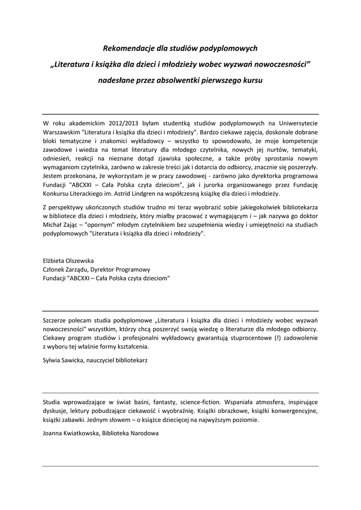 Rekomendacje dla studiów podyplomowych „Literatura i książka dla dzieci i młodzieży wobec wyzwań nowoczesności” nadesłane przez absolwentki pierwszego kursu W roku akademickim 2012/2013 byłam studentką studiów podyplomowych na Uniwersytecie Warszawskim "Literatura i książka dla dzieci i młodzieży". Bardzo ciekawe zajęcia, doskonale dobrane bloki tematyczne i znakomici wykładowcy – wszystko to spowodowało, że moje kompetencje zawodowe i wiedza na temat literatury dla młodego czytelnika, nowych jej nurtów, tematyki, odniesień, reakcji na nieznane dotąd zjawiska społeczne, a także próby sprostania nowym wymaganiom czytelnika, zarówno w zakresie treści jak i dotarcia do odbiorcy, znacznie się poszerzyły. Jestem przekonana, że wykorzystam je w pracy zawodowej - zarówno jako dyrektorka programowa Fundacji "ABCXXI – Cała Polska czyta dzieciom", jak i jurorka organizowanego przez Fundację Konkursu Literackiego im. Astrid Lindgren na współczesną książkę dla dzieci i młodzieży. Z perspektywy ukończonych studiów trudno mi teraz wyobrazić sobie jakiegokolwiek bibliotekarza w bibliotece dla dzieci i młodzieży, który miałby pracować z wymagającym i – jak nazywa go doktor Michał Zając – "opornym" młodym czytelnikiem bez uzupełnienia wiedzy i umiejętności na studiach podyplomowych "Literatura i książka dla dzieci i młodzieży". Elżbieta Olszewska Członek Zarządu, Dyrektor Programowy Fundacji "ABCXXI – Cała Polska czyta dzieciom" Szczerze polecam studia podyplomowe „Literatura i książka dla dzieci i młodzieży wobec wyzwań nowoczesności” wszystkim, którzy chcą poszerzyć swoją wiedzę o literaturze dla młodego odbiorcy. Ciekawy program studiów i profesjonalni wykładowcy gwarantują stuprocentowe (!) zadowolenie z wyboru tej właśnie formy kształcenia. Sylwia Sawicka, nauczyciel bibliotekarz Studia wprowadzające w świat baśni, fantasty, science-fiction. Wspaniała atmosfera, inspirujące dyskusje, lektury pobudzające ciekawość i wyobraźnię. Książki obrazkowe, książki konwergencyjne, książki zabawki. Jednym słowem – o książce dziecięcej na najwyższym poziomie. Joanna Kwiatkowska, Biblioteka Narodowa Zjazdy odbywały się co dwa tygodnie. Ze Szczecina do Warszawy jedzie się pociągiem ok. 7 godzin. Każdy zna warunki panujące w PKP, więc nie trudno sobie wyobrazić, że te podróże nie były ani łatwe, ani przyjemne. Nie były też tanie, bo studentom podyplomowym nie przysługują niestety jakiekolwiek zniżki. Nie żałuję jednak ani czasu, ani pieniędzy poświęconych na te podróże. Bez tego nie miałabym możliwości uczestnictwa w fantastycznych zajęciach na UW. Fascynujący się literaturą dla dzieci i młodzieży wykładowcy i słuchacze prowadzili pasjonujące dyskusje nierzadko wykraczające poza limit czasowy zaplanowanych zajęć. Nie mogliśmy nasycić się rozmową bazującą na wiedzy i wymianie doświadczeń związanych z książkami. Zawarliśmy przyjaźnie i cały czas odczuwamy ich pozytywne efekty. Z własnej i nieprzymuszonej woli planujemy dalsze spotkania w gronie miłośników literatury dla dzieci i młodzieży. Tematów do dyskusji na pewno nam nie zabraknie, to fascynująca dziedzina naukowa, warto zgłębiać jej arkana. W Polsce jest to tylko możliwe na Uniwersytecie Warszawskim, pozostałe uczelnie nie traktują tej dziedziny jako odrębnej gałęzi literaturoznawstwa i nie organizują podobnych kursów czy szkoleń. Warto więc łapać okazję i podjąć naukę na studiach podyplomowych „LITERATURA I KSIĄŻKA DLA DZIECI I MŁODZIEŻY WOBEC WYZWAŃ NOWOCZESNOŚCI”. Polecam z całego serca. Wioleta Słoka, właścicielka kolekcji książek dla dzieci i młodzieży "Wioletowe Kruczki" Polecam te studia wszystkim, którzy pragną uzupełnić swoją wiedzę na temat literatury dla dzieci i młodzieży, przekazywaną przez najznamienitszych znawców tematu. Gwarantuję wspaniałą zabawę intelektualną połączoną z niezwykle interesującą wiedzą o bajce, baśni i najnowszych trendach literackich literatury dla najmłodszych i tych starszych. Gorąco polecam! Hanna Sieradzka, nauczycielka Gimnazjum nr 5 na Mokotowie