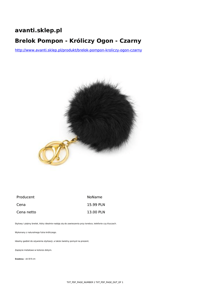 avanti.sklep.pl Brelok Pompon - Króliczy Ogon - Czarny http://www.avanti.sklep.pl/produkt/brelok-pompon-kroliczy-ogon-czarny Producent NoName Cena 15.99 PLN Cena netto 13.00 PLN Stylowy i piękny brelok, który idealnie nadaję się do zawieszenia przy torebce, telefonie czy kluczach. Wykonany z naturalnego futra króliczego. Idealny gadżet do ożywienia stylizacji, a także świetny pomysł na prezent. Zapięcie metalowe w kolorze złotym. Średnica - ok 8-9 cm TXT_PDF_PAGE_NUMBER 1 TXT_PDF_PAGE_OUT_OF 1
