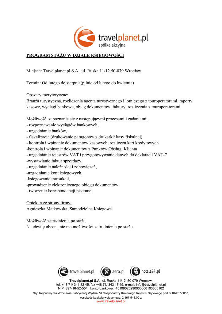 PROGRAM STAŻU W DZIALE KSIĘGOWOŚCI Miejsce: Travelplanet