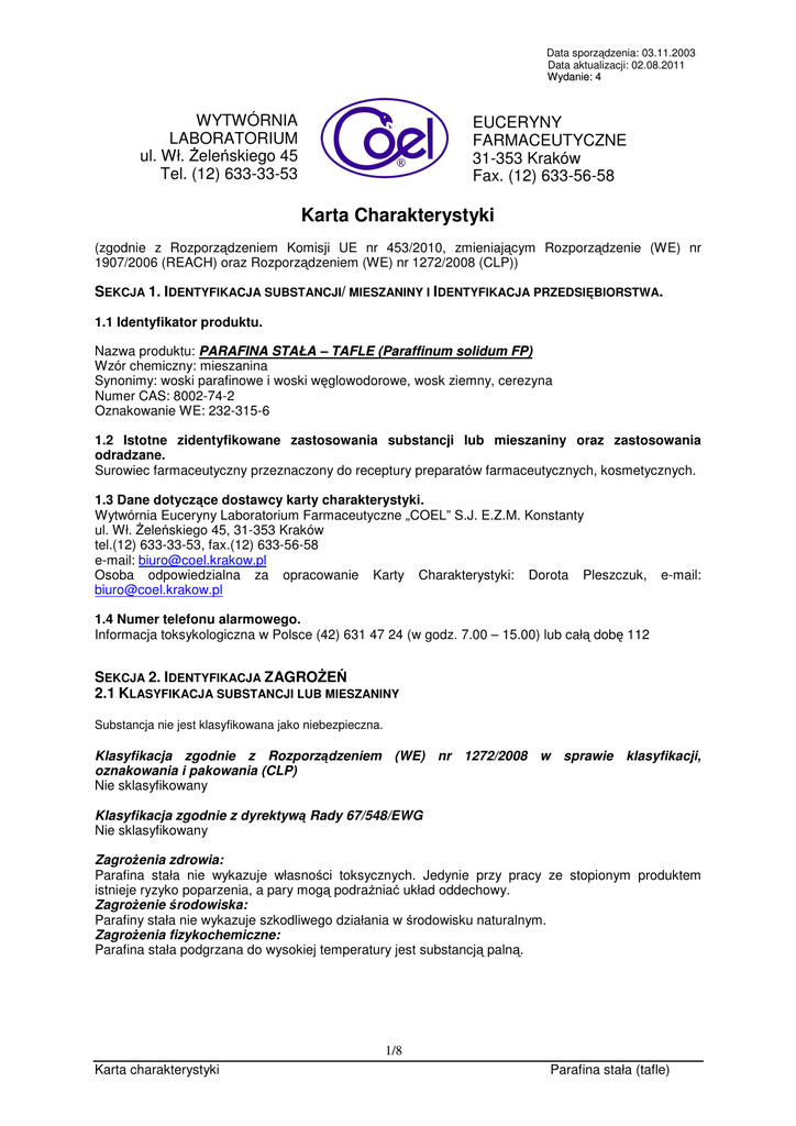 Data sporządzenia: 03.11.2003 Data aktualizacji: 02.08.2011 Wydanie: 4 WYTWÓRNIA LABORATORIUM ul. Wł. Żeleńskiego 45 Tel. (12) 633-33-53 EUCERYNY FARMACEUTYCZNE 31-353 Kraków Fax. (12) 633-56-58 Karta Charakterystyki (zgodnie z Rozporządzeniem Komisji UE nr 453/2010, zmieniającym Rozporządzenie (WE) nr 1907/2006 (REACH) oraz Rozporządzeniem (WE) nr 1272/2008 (CLP)) SEKCJA 1. IDENTYFIKACJA SUBSTANCJI/ MIESZANINY I IDENTYFIKACJA PRZEDSIĘBIORSTWA. 1.1 Identyfikator produktu. Nazwa produktu: PARAFINA STAŁA – TAFLE (Paraffinum solidum FP) Wzór chemiczny: mieszanina Synonimy: woski parafinowe i woski węglowodorowe, wosk ziemny, cerezyna Numer CAS: 8002-74-2 Oznakowanie WE: 232-315-6 1.2 Istotne zidentyfikowane zastosowania substancji lub mieszaniny oraz zastosowania odradzane. Surowiec farmaceutyczny przeznaczony do receptury preparatów farmaceutycznych, kosmetycznych. 1.3 Dane dotyczące dostawcy karty charakterystyki. Wytwórnia Euceryny Laboratorium Farmaceutyczne „COEL” S.J. E.Z.M. Konstanty ul. Wł. Żeleńskiego 45, 31-353 Kraków tel.(12) 633-33-53, fax.(12) 633-56-58 e-mail: [email protected] Osoba odpowiedzialna za opracowanie Karty Charakterystyki: Dorota Pleszczuk, [email protected] e-mail: 1.4 Numer telefonu alarmowego. Informacja toksykologiczna w Polsce (42) 631 47 24 (w godz. 7.00 – 15.00) lub całą dobę 112 SEKCJA 2. IDENTYFIKACJA ZAGROŻEŃ 2.1 KLASYFIKACJA SUBSTANCJI LUB MIESZANINY Substancja nie jest klasyfikowana jako niebezpieczna. Klasyfikacja zgodnie z Rozporządzeniem (WE) nr 1272/2008 w sprawie klasyfikacji, oznakowania i pakowania (CLP) Nie sklasyfikowany Klasyfikacja zgodnie z dyrektywą Rady 67/548/EWG Nie sklasyfikowany Zagrożenia zdrowia: Parafina stała nie wykazuje własności toksycznych. Jedynie przy pracy ze stopionym produktem istnieje ryzyko poparzenia, a pary mogą podrażniać układ oddechowy. Zagrożenie środowiska: Parafiny stała nie wykazuje szkodliwego działania w środowisku naturalnym. Zagrożenia fizykochemiczne: Parafina stała podgrzana do wysokiej temperatury jest substancją palną. 1 1/8 Karta charakterystyki Parafina stała (tafle) Data sporządzenia: 03.11.2003 Data aktualizacji: 02.08.2011 Wydanie: 4 2.2 ELEMENTY OZNAKOWANIA Piktogramy określające rodzaj zagrożenia: brak Hasło ostrzegawcze: brak hasła ostrzegawczego Zwroty wskazujące rodzaj zagrożenia: Brak doniesień o niepożądanych skutkach lub krytycznych zagrożeniach. Zwroty określające warunki bezpiecznego stosowania: Przed użyciem zapoznać się ze specjalnymi środkami ostrożności. Chronić przed dziećmi. W razie konieczności zasięgnięcia porady lekarza należy pokazać pojemnik lub etykietę. Nie używać przed zapoznaniem się i zrozumieniem wszystkich środków bezpieczeństwa. Przechowywać w zamkniętym opakowaniu. 2.3 INNE ZAGROŻENIA Wynik oceny właściwości PTB i vPvB zgodnie z załącznikiem XIII PTB: Nienadający się do zastosowania vPvB: Nienadający się do zastosowania SEKCJA 3. SKŁAD/INFORMACJA O SKŁADNIKACH Klasyfikacja Nazwa substancji Identyfikatory Parafina stała Oznakowanie WE: 232-315-6 Numer CAS: 8002-74-2 % 100,0 67/548/EWG Rozporządzenie WE Nr 1272/2008 (CLP) - - SEKCJA 4. ŚRODKI PIERWSZEJ POMOCY 4.1 OPIS ŚRODKÓW PIERWSZEJ POMOCY Wdychanie W razie narażenia inhalacyjnego wyprowadzić poszkodowaną osobę na świeże powietrze. Zapewnić pomoc lekarską. Kontakt ze skórą Zdjąć zanieczyszczoną odzież. Oczyścić mechanicznie skażoną skórę i przemyć wodą z mydłem. W razie oblania gorącym produktem natychmiast schłodzić zimną wodą, nałożyć sterylny opatrunek, nie zrywać zakrzepniętego produktu ze skóry, zapewnić pomoc lekarską. Kontakt z oczami Płukać oczy dużą ilością wody przez co najmniej 10-15 minut, przy szeroko odchylonej powiece, aby zapewnić wypłukanie całej powierzchni między okiem a powieką. W razie konieczności skonsultować się z okulistą. W przypadku kontaktu ze stopionym produktem natychmiast schłodzić zimną woda i zapewnić pomoc lekarską. Spożycie W razie połknięcia nie wywoływać wymiotów, zapewnić pomoc lekarską. 4.2 NAJWAŻNIEJSZE OSTRE I OPÓŹNIONE OBJAWY ORAZ SKUTKI NARAŻENIA. Wdychanie oparów wytworzonych w wysokiej temperaturze może spowodować podrażnienie dróg oddechowych. Kontakt ze skórą: suchość skóry, podrażnienie w razie długotrwałego lub wielokrotnego kontaktu. Kontakt z gorącym produktem może powodować oparzenia. Kontakt z oczami: gorący produkt może powodować oparzenia. 4.3 WSKAZANIA DOTYCZĄCE WSZELKIEJ NATYCHMIASTOWEJ SZCZEGÓLNEGO POSTĘPOWANIA Z POSZKODOWANYM. POMOCY LEKARSKIEJ I Leczyć objawowo. W przypadku połknięcia lub wdychania dużej ilości, natychmiast skontaktować się z lekarzem specjalizującym się w leczeniu zatruć truciznami. 2 2/8 Karta charakterystyki Parafina stała (tafle) Data sporządzenia: 03.11.2003 Data aktualizacji: 02.08.2011 Wydanie: 4 SEKCJA 5. POSTĘPOWANIE W PRZYPADKU POŻARU 5.1 ŚRODKI GAŚNICZE Piana, proszki gaśnicze, piasek, CO2. Nie stosować wody w pełnym strumieniu! Dwutlenek węgla, proszki i piany gaśnicze, rozpylona woda, piasek lub ziemia. Nie stosować wody w zwartym strumieniu. Należy unikać jednoczesnego stosowania piany i wody na tą samą powierzchnię. 5.2 SZCZEGÓLNE ZAGROŻENIA ZWIĄZANE Z SUBSTANCJĄ LUB MIESZANINĄ. Substancja palna. Produkty spalania zawierają tlenki azotu, tlenki węgla, tlenki siarki. 5.3 INFORMACJE DLA STRAŻY POŻARNEJ Stosować niezależny aparat oddechowy oraz odzież ochronną. Pojemniki narażone na działanie wysokiej temperatury chłodzić rozpyloną wodą. SEKCJA 6. POSTĘPOWANIE W PRZYPADKU NIEZAMIERZONEGO UWOLNIENIA DO ŚRODOWISKA 6.1 INDYWIDUALNE ŚRODKI OSTROŻNOŚCI, WYPOSAŻENIE OCHRONNE I PROCEDURY W SYTUACJACH AWARYJNYCH. Stosować odzież ochronną, rękawice i gogle ochronne. Unikać tworzenia i wdychania oparów. 6.2 ŚRODKI OSTROŻNOŚCI W ZAKRESIE OCHRONY ŚRODOWISKA. Zabezpieczyć preparat przed w