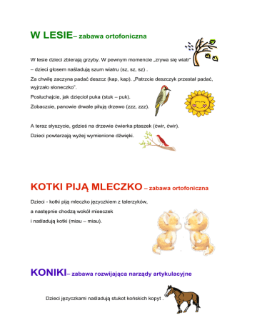 W LESIE– zabawa ortofoniczna W lesie dzieci zbierają grzyby. W pewnym momencie „zrywa się wiatr” – dzieci głosem naśladują szum wiatru (sz, sz, sz) . Za chwilę zaczyna padać deszcz (kap, kap). „Patrzcie deszczyk przestał padać, wyjrzało słoneczko”. Posłuchajcie, jak dzięcioł puka (stuk – puk). Zobaczcie, panowie drwale piłują drzewo (zzz, zzz). A teraz słyszycie, gdzieś na drzewie ćwierka ptaszek (ćwir, ćwir). Dzieci powtarzają wyżej wymienione dźwięki. KOTKI PIJĄ MLECZKO – zabawa ortofoniczna Dzieci - kotki piją mleczko języczkiem z talerzyków, a następnie chodzą wokół miseczek i naśladują kotki (miau – miau). KONIKI– zabawa rozwijająca narządy artykulacyjne Dzieci języczkami naśladują stukot końskich kopyt . DOKTOR– zabawa rozwijająca narządy artykulacyjne Pan doktor zaleca: płukanie gardła, połykanie pastylek, picie syropu... (Dzieci próbują naśladować te czynności). MAMA – zabawa artykulacyjna Mama wyszła do sklepu i zostawiła w domu swoją córeczkę. Córeczka się obudziła i wołała: ma – ma, ma – ma to ciszej, to głośniej (dzieci naśladują). SEN ANI– zabawa ortofoniczna Dzieci słuchają opowiadania Mała Ania poszła spać. Śnił jej się kotek (miau) i piesek (hau), które spotkała na podwórku. Potem przyszedł mały chłopiec i bardzo płakał, ponieważ zgubił swoją ulubioną piłeczkę. Piesek (hau) i kotek (miau) obiecali chłopcu swoją pomoc w odnalezieniu piłeczki. W czasie poszukiwań cała trójka (chłopiec, piesek i kotek) znalazła, zasmuconą Anię i płaczącą (uuu) lalę. Lala była bardzo śpiąca. Chciała iść do swojego łóżeczka w domu. Chłopiec wraz z kotkiem i pieskiem zanieśli lalę do domu, a Ania, która żałowała, że zostawiła lalę na podwórku, uśpiła ją teraz (aaa). (Po zapoznaniu się z tą historią dzieci, przy powtórnej inscenizacji naśladują odgłosy). Materiał zebrała M.Radziejewska
