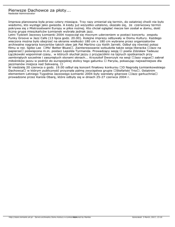 Pierwsze Dachowce za płoty... Nadesłał Administrator Impreza planowana była przez cztery miesiące. Trzy razy zmieniał się termin, do ostatniej chwili nie było wiadomo, kto wystąpi jako gwiazda. A kiedy już wszystko ustalono, okazało się, że czerwcowy termin pokrywa się z Mistrzostwami Europy w piłce nożnej. Kto chciał oglądać mecze ten został w domu, dość liczna grupa mieszkańców Łomianek wybrała jednak jazz. Letni Tydzień Jazzowy Łomianki 2004 rozpoczął się mocnym uderzeniem w postaci koncertu zespołu Funky Groove w Jazz Cafe (13 lipca godz. 20.00). Kolejne imprezy odbywały w Domu Kultury. Każdego wieczora można było obejrzeć na ekranie wielkości 180 cm x 180 cm wybrane przez organizatorów archiwalne nagrania koncertów takich sław jak Pat Martino czy Keith Jarrett. Odbył się również pokaz filmu w reż. Spike Lee Mo' Better Blues. Zainteresowanie wzbudziła także sesja literacka Jazz na papierze poświęcona m.in. postaci Lepolda Tyrmanda. Prowadzący sesję poeta Zdzisław Tadeusz Łączkowski wspominał czasy, w których słuchał jazzu z przyjaciółmi na tajnych spotkaniach przy zamkniętych szczelnie i zasuniętych storami oknach... Krzysztof Dworczyk na sesji Jazz vogue zabrał miłośników jazzu w podróż do europejskiej stolicy tego gatunku Paryża, pokazując najważniejsze dla jazzmanów miejsca nad Sekwaną. W niedzielę 20 czerwca o godz. 19.00 odbył się koncert finałowy konkursu O Nagrodę Łomiankowskiego Dachowca w którym publiczność przyznała palmę zwycięstwa grupie Stefański Trio. Ostatnim elementem Letniego Tygodnia Jazzowego Łomianki 2004 były warstaty gitarowe Jazz garkuchnia prowadzone przez Karola Obarę, które odbyły się w dniach 25-27 czerwca 2004 r. http://stare.lomianki.art.pl - Serwis archiwalny Domu Kultury w Łomiankach Powered by Mambo Generated: 3 March, 2017, 13:16