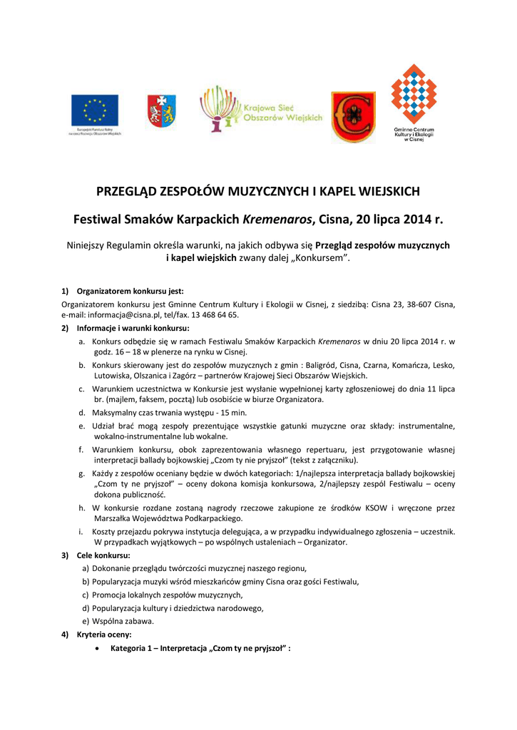 PRZEGLĄD ZESPOŁÓW MUZYCZNYCH I KAPEL WIEJSKICH Festiwal Smaków Karpackich Kremenaros, Cisna, 20 lipca 2014 r. Niniejszy Regulamin określa warunki, na jakich odbywa się Przegląd zespołów muzycznych i kapel wiejskich zwany dalej „Konkursem”. 1) Organizatorem konkursu jest: Organizatorem konkursu jest Gminne Centrum Kultury i Ekologii w Cisnej, z siedzibą: Cisna 23, 38-607 Cisna, e-mail: [email protected], tel/fax. 13 468 64 65. 2) Informacje i warunki konkursu: a. Konkurs odbędzie się w ramach Festiwalu Smaków Karpackich Kremenaros w dniu 20 lipca 2014 r. w godz. 16 – 18 w plenerze na rynku w Cisnej. b. Konkurs skierowany jest do zespołów muzycznych z gmin : Baligród, Cisna, Czarna, Komańcza, Lesko, Lutowiska, Olszanica i Zagórz – partnerów Krajowej Sieci Obszarów Wiejskich. c. Warunkiem uczestnictwa w Konkursie jest wysłanie wypełnionej karty zgłoszeniowej do dnia 11 lipca br. (majlem, faksem, pocztą) lub osobiście w biurze Organizatora. d. Maksymalny czas trwania występu - 15 min. e. Udział brać mogą zespoły prezentujące wszystkie gatunki muzyczne oraz składy: instrumentalne, wokalno-instrumentalne lub wokalne. f. Warunkiem konkursu, obok zaprezentowania własnego repertuaru, jest przygotowanie własnej interpretacji ballady bojkowskiej „Czom ty nie pryjszoł” (tekst z załączniku). g. Każdy z zespołów oceniany będzie w dwóch kategoriach: 1/najlepsza interpretacja ballady bojkowskiej „Czom ty ne pryjszoł” – oceny dokona komisja konkursowa, 2/najlepszy zespól Festiwalu – oceny dokona publiczność. h. W konkursie rozdane zostaną nagrody rzeczowe zakupione ze środków KSOW i wręczone przez Marszałka Województwa Podkarpackiego. i. Koszty przejazdu pokrywa instytucja delegująca, a w przypadku indywidualnego zgłoszenia – uczestnik. W przypadkach wyjątkowych – po wspólnych ustaleniach – Organizator. 3) Cele konkursu: a) Dokonanie przeglądu twórczości muzycznej naszego regionu, b) Popularyzacja muzyki wśród mieszkańców gminy Cisna oraz gości Festiwalu, c) Promocja lokalnych zespołów muzycznych, d) Popularyzacja kultury i dziedzictwa narodowego, e) Wspólna zabawa. 4) Kryteria oceny: Kategoria 1 – Interpretacja „Czom ty ne pryjszoł” : Oceny dokona komisja konkursowa powołana przez Organizatora imprezy i ogłoszona w trakcie Festiwalu. Komisja przyzna nagrodę I, II oraz III. Wykonanie ballady Bojkowskiej „Czom ty ne pryjszoł” Komisja oceni według poniższych kryteriów: a. Poziom warsztatu muzycznego, b. Oryginalność interpretacji, c. Emocjonalność wykonania. Od decyzji komisji konkursowej nie ma odwołań. Kryteria oceny kategorii 2 – najlepszy zespół Festiwalu: Oceny dokona publiczność festiwalu i przyzna Nagrodę Publiczności. Kryterium wyboru zwycięzcy będzie czas otrzymanych braw mierzona przez Organizatora. 5) Uwagi: a. Udział w konkursie jest równoznaczny z wyrażeniem zgody na przetwarzanie danych osobowych jego uczestników na potrzeby konkursu (ustawa o ochronie danych osobowych z dnia 29.08.1997r. Dz.U. Nr 133, poz. 833 z późn. zm. ). b. Organizator zastrzega sobie możliwość zmian postanowień zawartych w Regulaminie Konkursu lub odwołania konkursu bez podania przyczyn. Ostateczna interpretacja niniejszego regulaminu należy do Organizatora. Informacje o konkursie: GCKiE w Cisnej, Julia Kubica – Dyrektor, e-mail: [email protected], tel 13 468 64 65. PRZEGLĄD ZESPOŁÓW MUZYCZNYCH I KAPEL WIEJSKICH Festiwal Smaków Karpackich Kremenaros, Cisna, 20 lipca 2014 r. FORMULARZ ZGŁOSZENIOWY Uczestnik Konkursu: Zespół ..……………………………………………………………………………….………........................................... Adres do korespondencji …………………………………………………........................................................ Telefon i e-mail ........................………………………………………………………………………………………………. Repertuar (tytuł, autor) 1. Czem ty nie pryjszoł (pozycja obowiązkowa) 2. ………………………………………………………………………………………………………………………………. 3. ……………………………………………………………………………………………………………………………….. Krótka informacja o zespole: ……………………………………………………………………………………………………………………………………………… ……………………………………………………………………………………………………………………………………………… ……………………………………………………………………………………………………………………………………………… ………………………………………………………………………………………………………………………………………………. Informacja o potrzebach w zakresie nagłośnienia występu: ………………………………………………………………………………………………………………………………………………. ………………………………………………………………………………………………………………………………………………. ………………………………………………………………………………………………………………………………………………. Oświadczam, iż zapoznałem/łam się z Regulaminem Konkursu, przyjmuję go do wiadomości oraz akceptuję jego warunki. ...................................................................................... data i podpis reprezentanta zespołu Ballada bojkowska „Czom ty nie prijszoł”– tekst piosenki Czom ty ne pryjszoł Jak misiac zijszoł, Ja 