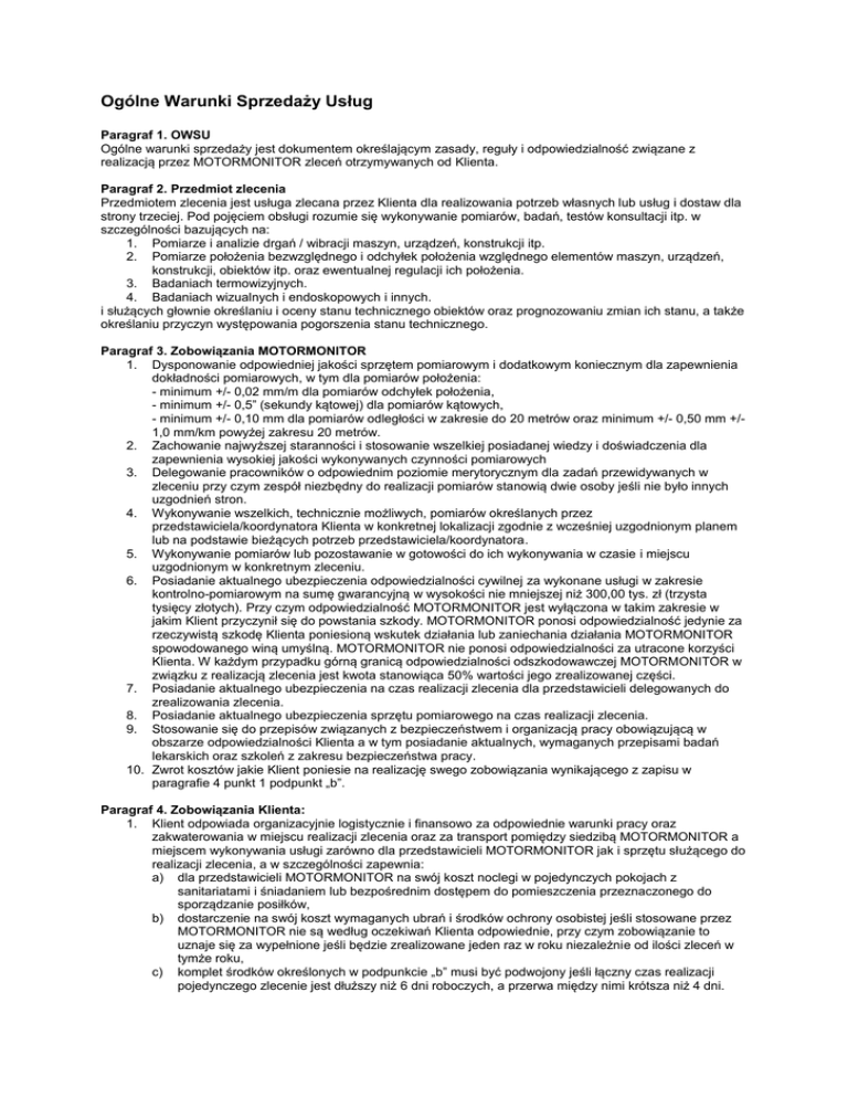 Ogólne Warunki Sprzedaży Usług Paragraf 1. OWSU Ogólne warunki sprzedaży jest dokumentem określającym zasady, reguły i odpowiedzialność związane z realizacją przez MOTORMONITOR zleceń otrzymywanych od Klienta. Paragraf 2. Przedmiot zlecenia Przedmiotem zlecenia jest usługa zlecana przez Klienta dla realizowania potrzeb własnych lub usług i dostaw dla strony trzeciej. Pod pojęciem obsługi rozumie się wykonywanie pomiarów, badań, testów konsultacji itp. w szczególności bazujących na: 1. Pomiarze i analizie drgań / wibracji maszyn, urządzeń, konstrukcji itp. 2. Pomiarze położenia bezwzględnego i odchyłek położenia względnego elementów maszyn, urządzeń, konstrukcji, obiektów itp. oraz ewentualnej regulacji ich położenia. 3. Badaniach termowizyjnych. 4. Badaniach wizualnych i endoskopowych i innych. i służących głownie określaniu i oceny stanu technicznego obiektów oraz prognozowaniu zmian ich stanu, a także określaniu przyczyn występowania pogorszenia stanu technicznego. Paragraf 3. Zobowiązania MOTORMONITOR 1. Dysponowanie odpowiedniej jakości sprzętem pomiarowym i dodatkowym koniecznym dla zapewnienia dokładności pomiarowych, w tym dla pomiarów położenia: - minimum +/- 0,02 mm/m dla pomiarów odchyłek położenia, - minimum +/- 0,5” (sekundy kątowej) dla pomiarów kątowych, - minimum +/- 0,10 mm dla pomiarów odległości w zakresie do 20 metrów oraz minimum +/- 0,50 mm +/1,0 mm/km powyżej zakresu 20 metrów. 2. Zachowanie najwyższej staranności i stosowanie wszelkiej posiadanej wiedzy i doświadczenia dla zapewnienia wysokiej jakości wykonywanych czynności pomiarowych 3. Delegowanie pracowników o odpowiednim poziomie merytorycznym dla zadań przewidywanych w zleceniu przy czym zespół niezbędny do realizacji pomiarów stanowią dwie osoby jeśli nie było innych uzgodnień stron. 4. Wykonywanie wszelkich, technicznie możliwych, pomiarów określanych przez przedstawiciela/koordynatora Klienta w konkretnej lokalizacji zgodnie z wcześniej uzgodnionym planem lub na podstawie bieżących potrzeb przedstawiciela/koordynatora. 5. Wykonywanie pomiarów lub pozostawanie w gotowości do ich wykonywania w czasie i miejscu uzgodnionym w konkretnym zleceniu. 6. Posiadanie aktualnego ubezpieczenia odpowiedzialności cywilnej za wykonane usługi w zakresie kontrolno-pomiarowym na sumę gwarancyjną w wysokości nie mniejszej niż 300,00 tys. zł (trzysta tysięcy złotych). Przy czym odpowiedzialność MOTORMONITOR jest wyłączona w takim zakresie w jakim Klient przyczynił się do powstania szkody. MOTORMONITOR ponosi odpowiedzialność jedynie za rzeczywistą szkodę Klienta poniesioną wskutek działania lub zaniechania działania MOTORMONITOR spowodowanego winą umyślną. MOTORMONITOR nie ponosi odpowiedzialności za utracone korzyści Klienta. W każdym przypadku górną granicą odpowiedzialności odszkodowawczej MOTORMONITOR w związku z realizacją zlecenia jest kwota stanowiąca 50% wartości jego zrealizowanej części. 7. Posiadanie aktualnego ubezpieczenia na czas realizacji zlecenia dla przedstawicieli delegowanych do zrealizowania zlecenia. 8. Posiadanie aktualnego ubezpieczenia sprzętu pomiarowego na czas realizacji zlecenia. 9. Stosowanie się do przepisów związanych z bezpieczeństwem i organizacją pracy obowiązującą w obszarze odpowiedzialności Klienta a w tym posiadanie aktualnych, wymaganych przepisami badań lekarskich oraz szkoleń z zakresu bezpieczeństwa pracy. 10. Zwrot kosztów jakie Klient poniesie na realizację swego zobowiązania wynikającego z zapisu w paragrafie 4 punkt 1 podpunkt „b”. Paragraf 4. Zobowiązania Klienta: 1. Klient odpowiada organizacyjnie logistycznie i finansowo za odpowiednie warunki pracy oraz zakwaterowania w miejscu realizacji zlecenia oraz za transport pomiędzy siedzibą MOTORMONITOR a miejscem wykonywania usługi zarówno dla przedstawicieli MOTORMONITOR jak i sprzętu służącego do realizacji zlecenia, a w szczególności zapewnia: a) dla przedstawicieli MOTORMONITOR na swój koszt noclegi w pojedynczych pokojach z sanitariatami i śniadaniem lub bezpośrednim dostępem do pomieszczenia przeznaczonego do sporządzanie posiłków, b) dostarczenie na swój koszt wymaganych ubrań i środków ochrony osobistej jeśli stosowane przez MOTORMONITOR nie są według oczekiwań Klienta odpowiednie, przy czym zobowiązanie to uznaje się za wypełnione jeśli będzie zrealizowane jeden raz w roku niezależnie od ilości zleceń w tymże roku, c) komplet środków określonych w podpunkcie „b” musi być podwojony jeśli łączny czas realizacji pojedynczego zlecenie jest dłuższy niż 6 dni roboczych, a przerwa między nimi krótsza niż 4 dni. odpowiednie miejsce do przebrania się, przechowania rzeczy osobistych i dostęp do urządzeń sanitarnych w miejscu wykonywania zlecenia. Jeśli strony ustaliły transport własny MOTORMONITOR dla swoich przedstawicieli i sprzętu wówczas: a) w przypadku uzgodnionego transportu samochodem wynagrodzenie dla MOTORMONITOR zależne jest do odległości obliczanych na podstawie map drogowych lub faktycznie przejechanych kilometrów drogi, b) w przypadku transportu innego niż samochodowy obowiązuje zwrot kosztów poniesionych na bilety i inne wydatki bezpośrednio związanych z dojazdem przy czym kryterium wyboru przewoźnika jest najkrótszy łączny czas dojazdu. Jeśli strony ustaliły zakwaterowanie i dojazdy lokalne jako własne MOTORMONITOR wówczas Klient zobowiązuje się do zwrotu wszystkich bezpośrednio z tym związanych kosztów na podstawie faktur, rachunków itp. przy czym MOTORMONITOR ma prawo do: a) zakwaterowania w hotelu/kwaterze itp. o standardzie trzech gwiazdek (przyjmuje się, że lokalny standard dla trzech gwiazdek oznacza pokój hotelowy z sanitariatem i oferowanym śniadaniem w tym samym budynku), a jeśli w odległości mniejszej niż 10 kilometrów nie można znaleźć takiej oferty ma prawo do s