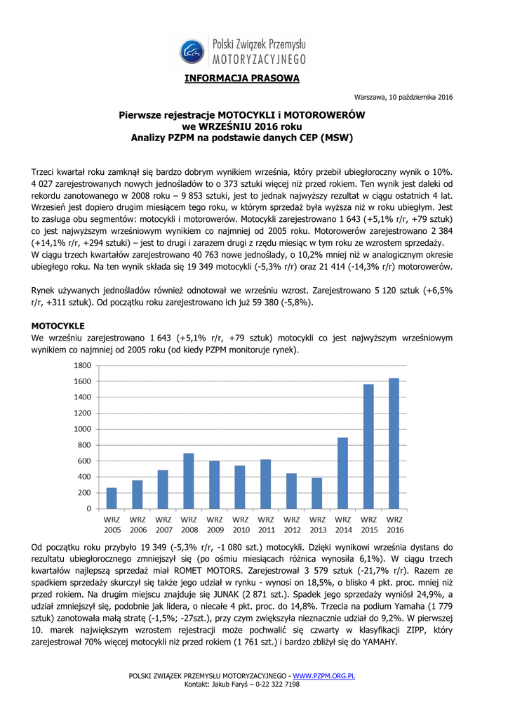 INFORMACJA PRASOWA Warszawa, 10 października 2016 Pierwsze rejestracje MOTOCYKLI i MOTOROWERÓW we WRZEŚNIU 2016 roku Analizy PZPM na podstawie danych CEP (MSW) Trzeci kwartał roku zamknął się bardzo dobrym wynikiem września, który przebił ubiegłoroczny wynik o 10%. 4 027 zarejestrowanych nowych jednośladów to o 373 sztuki więcej niż przed rokiem. Ten wynik jest daleki od rekordu zanotowanego w 2008 roku – 9 853 sztuki, jest to jednak najwyższy rezultat w ciągu ostatnich 4 lat. Wrzesień jest dopiero drugim miesiącem tego roku, w którym sprzedaż była wyższa niż w roku ubiegłym. Jest to zasługa obu segmentów: motocykli i motorowerów. Motocykli zarejestrowano 1 643 (+5,1% r/r, +79 sztuk) co jest najwyższym wrześniowym wynikiem co najmniej od 2005 roku. Motorowerów zarejestrowano 2 384 (+14,1% r/r, +294 sztuki) – jest to drugi i zarazem drugi z rzędu miesiąc w tym roku ze wzrostem sprzedaży. W ciągu trzech kwartałów zarejestrowano 40 763 nowe jednoślady, o 10,2% mniej niż w analogicznym okresie ubiegłego roku. Na ten wynik składa się 19 349 motocykli (-5,3% r/r) oraz 21 414 (-14,3% r/r) motorowerów. Rynek używanych jednośladów również odnotował we wrześniu wzrost. Zarejestrowano 5 120 sztuk (+6,5% r/r, +311 sztuk). Od początku roku zarejestrowano ich już 59 380 (-5,8%). MOTOCYKLE We wrześniu zarejestrowano 1 643 (+5,1% r/r, +79 sztuk) motocykli co jest najwyższym wrześniowym wynikiem co najmniej od 2005 roku (od kiedy PZPM monitoruje rynek). Od początku roku przybyło 19 349 (-5,3% r/r, -1 080 szt.) motocykli. Dzięki wynikowi września dystans do rezultatu ubiegłorocznego zmniejszył się (po ośmiu miesiącach różnica wynosiła 6,1%). W ciągu trzech kwartałów najlepszą sprzedaż miał ROMET MOTORS. Zarejestrował 3 579 sztuk (-21,7% r/r). Razem ze spadkiem sprzedaży skurczył się także jego udział w rynku - wynosi on 18,5%, o blisko 4 pkt. proc. mniej niż przed rokiem. Na drugim miejscu znajduje się JUNAK (2 871 szt.). Spadek jego sprzedaży wyniósł 24,9%, a udział zmniejszył się, podobnie jak lidera, o niecałe 4 pkt. proc. do 14,8%. Trzecia na podium Yamaha (1 779 sztuk) zanotowała małą stratę (-1,5%; -27szt.), przy czym zwiększyła nieznacznie udział do 9,2%. W pierwszej 10. marek największym wzrostem rejestracji może pochwalić się czwarty w klasyfikacji ZIPP, który zarejestrował 70% więcej motocykli niż przed rokiem (1 761 szt.) i bardzo zbliżył się do YAMAHY. POLSKI ZWIĄZEK PRZEMYSŁU MOTORYZACYJNEGO - WWW.PZPM.ORG.PL Kontakt: Jakub Faryś – 0-22 322 7198 INFORMACJA PRASOWA Warszawa, 10 października 2016 Pojemności silnika: Udział w rynku 125-tek jest stabilny i po trzech kwartałach wynosi podobnie jak przed miesiącem 70,3%. Jest to 3,8 pkt. proc. mniej niż przed rokiem. Zarejestrowano ich 13 608, czyli mniej o 10% r/r. Prym w tej klasie wiodą ROMET MOTORS z 24,8% udziałem i JUNAK z 21% udziałem, nieco dalej za nimi ZIPP (12,6% udział). Następne pod względem popularności w tym roku są maszyny o pojemności silnika pow. 750cc. Zajęły 16,5% i przybyło ich 3 188 szt., czyli o 11,9% więcej niż rok temu. Ich udział wzrósł o 2,5 pkt. proc. Kolejność marek w tym segmencie: BMW (31,7% udz. w segmencie) z dużą przewagą nad HARLEY-DAVIDSON (15,8% udz.) oraz zmniejszającą dystans do niego YAMAHĄ (14,6% udz.). Motocykle z silnikami od 500 do 750cc, które zajęły 6,3% rynku, osiągnęły 1 221 nowych rejestracji i wzrost o 8,3%. Dominującą pozycję i 33% udziału ma tu YAMAHA. Następne maszyny od 250cc do 500cc z udziałem 4,2% w całym rynku, urosły o 9,7%. Przybyło ich 806 szt. Wśród nich wyróżnia się KTM z 30% udziałem. Najmniej liczne są motocykle z silnikami od powyżej 125 do 250cc. Zarejestrowano ich w tym okresie 516 sztuk (-9,3%). Segmenty funkcjonalne: Pojazdy typu STREET zdecydowanie przewodzą sprzedaży nowych motocykli. W okresie do stycznia do września stanowiły 46,3% rynku. Było to 4,0 pkt. proc. mniej niż przed rokiem. Zarejestrowano ich 8 959 (12,8% r/r). Na pierwszym miejscu znajduje się ROMET MOTORS (2 199), który sprzedał w tym segmencie 33 motocykle więcej niż JUNAK. Obie marki zanotowały duże spadki w tym segmencie, odpowiednio -17,5% i 33,9%. Trzecia Yamaha zwiększyła sprzedaż o 13,8% do 951 szt. Drugim najpopularniejszym segmentem i zarazem drugim, który odnotował spadek rejestracji (-10,4% r/r) są BIG SCOOTERY. Zarejestrowano ich 4 305 z czego największa część przypada na markę ZIPP (768 szt.), który dzięki wysokiemu wzrostowi sprzedaży (+60%) odskoczył konkurencji. KYMCO wydał 593, a HONDA 583 dużych skuterów. Kymco odnotowało duży spadek sprzedaży (-35,6%) w tym segmencie. Największy wzrost sprzedaży (+41% r/r) i zwiększenie udziału w rynku (+3,4pp) zanotowano w kategorii ON/OFF. Motocykli tego typu sprzedano 1 971. POLSKI ZWIĄZEK PRZEMYSŁU MOTORYZACYJNEGO - WWW.PZPM.ORG.PL Kontakt: Jakub Faryś – 0-22 322 7198 INFORMACJA PRASOWA Warszawa, 10 października 2016 Rejestracje motocykli używanych. W ciągu pierwszych trzech kwartałów br. zarejestrowano 50 461 używanych motocykli. Dystans do wyniku ubiegłorocznego stopniowo się zmniejsza i teraz wynosi tylko 2,7%. Trójka najpopularniejszych marek w tej części rynku to niezmiennie: HONDA (12 969 szt.; -4,6% r/r), YAMAHA (10 961; -2,9% r/r) oraz SUZUKI (7 557; -7,6% r/r). Używanych motocykli sprowadzono w ciągu trzech pierwszych kwartałów 2,6 razy więcej niż w tym czasie sprzedano nowych. MOTOROWERY We wrześniu nowych motorowerów zarejestrowano 2 384 (+14,1% r/r, +294 sztuki) – jest to drugi i zarazem drugi z rzędu miesiąc w tym roku ze wzrostem sprzedaży. Dynamika rejestracji była nawet znacznie wyższa niż w sierpniu, kiedy wzrost wyniósł 4,4% (+130 sztuk). Od momentu kiedy w 2008 roku sprzedaż motorowerów osiągnęła swój szczyt obserwujemy systematyczne kurczenie się tego rynku i sytuacje takie, jak w sierpniu i wr