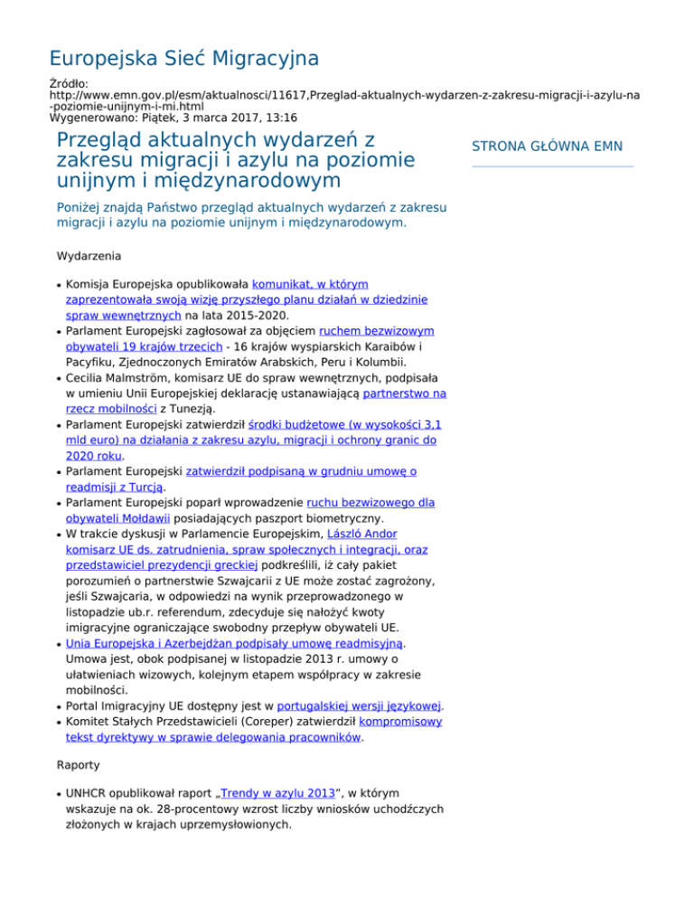 Europejska Sieć Migracyjna Źródło: http://www.emn.gov.pl/esm/aktualnosci/11617,Przeglad-aktualnych-wydarzen-z-zakresu-migracji-i-azylu-na -poziomie-unijnym-i-mi.html Wygenerowano: Piątek, 3 marca 2017, 13:16 Przegląd aktualnych wydarzeń z zakresu migracji i azylu na poziomie unijnym i międzynarodowym Poniżej znajdą Państwo przegląd aktualnych wydarzeń z zakresu migracji i azylu na poziomie unijnym i międzynarodowym. Wydarzenia ● ● ● ● ● ● ● ● ● ● Komisja Europejska opublikowała komunikat, w którym zaprezentowała swoją wizję przyszłego planu działań w dziedzinie spraw wewnętrznych na lata 2015-2020. Parlament Europejski zagłosował za objęciem ruchem bezwizowym obywateli 19 krajów trzecich - 16 krajów wyspiarskich Karaibów i Pacyfiku, Zjednoczonych Emiratów Arabskich, Peru i Kolumbii. Cecilia Malmström, komisarz UE do spraw wewnętrznych, podpisała w umieniu Unii Europejskiej deklarację ustanawiającą partnerstwo na rzecz mobilności z Tunezją. Parlament Europejski zatwierdził środki budżetowe (w wysokości 3,1 mld euro) na działania z zakresu azylu, migracji i ochrony granic do 2020 roku. Parlament Europejski zatwierdził podpisaną w grudniu umowę o readmisji z Turcją. Parlament Europejski poparł wprowadzenie ruchu bezwizowego dla obywateli Mołdawii posiadających paszport biometryczny. W trakcie dyskusji w Parlamencie Europejskim, László Andor komisarz UE ds. zatrudnienia, spraw społecznych i integracji, oraz przedstawiciel prezydencji greckiej podkreślili, iż cały pakiet porozumień o partnerstwie Szwajcarii z UE może zostać zagrożony, jeśli Szwajcaria, w odpowiedzi na wynik przeprowadzonego w listopadzie ub.r. referendum, zdecyduje się nałożyć kwoty imigracyjne ograniczające swobodny przepływ obywateli UE. Unia Europejska i Azerbejdżan podpisały umowę readmisyjną. Umowa jest, obok podpisanej w listopadzie 2013 r. umowy o ułatwieniach wizowych, kolejnym etapem współpracy w zakresie mobilności. Portal Imigracyjny UE dostępny jest w portugalskiej wersji językowej. Komitet Stałych Przedstawicieli (Coreper) zatwierdził kompromisowy tekst dyrektywy w sprawie delegowania pracowników. Raporty ● UNHCR opublikował raport „Trendy w azylu 2013”, w którym wskazuje na ok. 28-procentowy wzrost liczby wniosków uchodźczych złożonych w krajach uprzemysłowionych. STRONA GŁÓWNA EMN Newslettery ● ● ● ● ● ● Tygodniowe biuletyny ECRE – marzec 2014. Newsletter Agencji Praw Podstawowych Unii Europejskiej (FRA) – marzec 2014. Newsletter Europejskiego Urzędu Wsparcia w dziedzinie Azylu (EASO) – luty 2014. Newsletter Międzynarodowej Organizacji ds. Migracji (IOM) – marzec 2014. Newsletter Ośrodka do Spraw Polityki Migracyjnej (MPC) – luty 2014. Newsletter interaktywnej mapy MTM – luty 2014. Spotkania ● ● 27. Posiedzenie Wspólnego Zgromadzenia Parlamentarnego UE oraz państw Afryki, Karaibów i Pacyfiku (AKP) na temat praw ekonomicznych i społecznych migrantów w Afryce, Karaibach i Pacyfiku oraz Unii Europejskiej. Konferencja "The Common European Asylum System: challenges and perspectives" z udziałem komisarz spraw wewnętrznych UE Cecilii Malmström, w związku z sytuacją uchodźców w Bułgarii (Sofia 24-25 marca 2014 r.). Statystyki ● ● Statystyki dotyczące liczby wniosków uchodźczych złożonych w krajach UE i wydanych decyzji w 2013 r., opublikowane przez Eurostat. Trendy w dziedzinie azylu w lutym 2014 roku, opublikowane przez Europejski Urząd Wsparcia w dziedzinie Azylu (EASO).