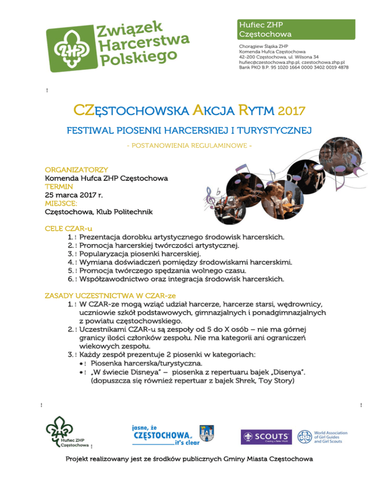 Hufiec ZHP Częstochowa Chorągiew Śląska ZHP Komenda Hufca Częstochowa 42-200 Częstochowa, ul. Wilsona 34 [email protected], czestochowa.zhp.pl Bank PKO B.P. 95 1020 1664 0000 3402 0019 4878 ! C ZĘSTO C H O W SKA A KCJA RYTM 2017 FESTIWAL PIOSENKI HARCERSKIEJ I TURYSTYCZNEJ - POSTANOWIENIA REGULAMINOWE - ORGANIZATORZY Komenda Hufca ZHP Częstochowa TERMIN 25 marca 2017 r. MIEJSCE: Częstochowa, Klub Politechnik CELE CZAR-u 1.! Prezentacja dorobku artystycznego środowisk harcerskich. 2.! Promocja harcerskiej twórczości artystycznej. 3.! Popularyzacja piosenki harcerskiej. 4.! Wymiana doświadczeń pomiędzy środowiskami harcerskimi. 5.! Promocja twórczego spędzania wolnego czasu. 6.! Współzawodnictwo oraz integracja środowisk harcerskich. ZASADY UCZESTNICTWA W CZAR-ze 1.! W CZAR-ze mogą wziąć udział harcerze, harcerze starsi, wędrownicy, uczniowie szkół podstawowych, gimnazjalnych i ponadgimnazjalnych z powiatu częstochowskiego. 2.! Uczestnikami CZAR-u są zespoły od 5 do X osób – nie ma górnej granicy ilości członków zespołu. Nie ma kategorii ani ograniczeń wiekowych zespołu. 3.! Każdy zespół prezentuje 2 piosenki w kategoriach: •! Piosenka harcerska/turystyczna. •! „W świecie Disneya” – piosenka z repertuaru bajek „Disenya”. (dopuszcza się również repertuar z bajek Shrek, Toy Story) ! ! ! P r o je k t r e a liz o w a n y je s t z e ś r o d k ó w p u b lic z n y c h G m in y M ia s t a C z ę s t o c h o w a Hufiec ZHP Częstochowa Chorągiew Śląska ZHP Komenda Hufca Częstochowa 42-200 Częstochowa, ul. Wilsona 34 [email protected], czestochowa.zhp.pl Bank PKO B.P. 95 1020 1664 0000 3402 0019 4878 ! 4.! W przypadku podkładu muzycznego nie dopuszcza się playbacku i półplaybacku. 5.! Aby wziąć udział w CZAR-ze należy wypełnić internetowy formularz zgłoszeniowy najpóźniej do dnia 28 lutego 2017r. Formularz będzie dostępny na naszej stronie internetowej. 6.! Uczestnictwo w festiwalu jest bezpłatne. Jeżeli zespół chce skorzystać z obiadu zamawianego przez organizatorów, pokrywa koszt zakupu obiadu w cenie 10 zł od osoby. Szczegóły w formularzu zgłoszeniowym. 7.! Aby wziąć bezpłatnie udział w festiwalu jako gość, należy wypełnić formularz zgłoszeniowy dostępny od 5 marca 2017r. – ilość miejsc ograniczona. KRYTERIA OCENY 1.! Umiejętności wokalne. 2.! Dobór repertuaru. 3.! Akompaniament, aranżacja utworów. 4.! Znajomość tekstów piosenek. 5.! Regulaminowe umundurowanie uczestników. 6.! Ogólny wizerunek artystyczny. 7.! Dodatkowe pomysły uczestników (np. choreografia, scenka). Jury wyłoni zwycięzców w dwóch kategoriach: piosenki harcerskiej i piosenki „Disney’a” Podczas trwania CZAR-u wyłoniona zostanie nagroda publiczności. Werdykt jury jest ostateczny i niepodważalny. Ogłoszenie wyników nastąpi w dniu CZAR-u. NAGRODY I miejsce – nagrody rzeczowe, dyplom II miejsce – nagrody rzeczowe, dyplom III miejsce – nagrody rzeczowe, dyplom Nagroda publiczności- nagroda rzeczowa, dyplom ! ! ! P r o je k t r e a liz o w a n y je s t z e ś r o d k ó w p u b lic z n y c h G m in y M ia s t a C z ę s t o c h o w a Hufiec ZHP Częstochowa Chorągiew Śląska ZHP Komenda Hufca Częstochowa 42-200 Częstochowa, ul. Wilsona 34 [email protected], czestochowa.zhp.pl Bank PKO B.P. 95 1020 1664 0000 3402 0019 4878 ! ORGANIZATORZY ZAPEWNIAJĄ •! Plakietka typu buton •! Dyplomy •! Nagrody rzeczowe dla zwycięzców INNE Podczas trwania festiwalu będzie funkcjonować kawiarenka „Zolka”, czyli wszystko za 1zł. O R IE N T A C Y J N Y P R O G R A M F E S T IW A L U S o b o ta 2 5 m a rc a 2 0 1 7 8 .3 0 – R e je stra c ja u c z e stn ik ó w fe stiw a lu 9 . 0 0 – R o z p o c z ę c i e f e s t i w a l u , w y s t ę p y u c z e s t n i k ó w k a te g o r ia p io s n k a h a rc e rsk a /tu ry sty c z n a 1 2 .3 0 – P r z e r w a o b i a d o w a 1 3 .3 0 – K o n c e r t h a r c e r s k o – t u r y s t y c z n y R o b e r t a K a s p r z y c k i e g o 1 4 .3 0 – W y s tę p y u c z e s tn ik ó w k a te g o ria p io s e n k a „D is n e y ’a ” 1 7 .4 5 – K o l a c j a w e w ł a s n y m z a k r e s i e , o b r a d y j u r y 18.30 – Koncert finałowy Studia „Accantus”, 1 9 .3 0 - O g ł o s z e n i e w y n i k ó w k o n k u r s u i w r ę c z e n i e n a g r ó d 2 0 .3 0 - Z a k o ń c z e n ie im p re z y . P O S T A N O W IE N IA K O Ń C O W E C Z A R o d b ę d zie się b e z w zg lę d u n a p o g o d ę . P o d c z a s trw a n ia C Z A R - u z e sp o ły h a rc e rsk ie p a m ię ta ją o r e g u l a m i n o w y m u m u n d u ro w a n iu . U c z e s t n i c y p o n o s z ą o d p o w i e d z i a ln o ś ć f i n a n s o w ą z a w y r z ą d z o n e s z k o d y . S p ra w y s p o rn e i n ie u ję te w R e g u la m in ie ro z s trz y g a K o m e n d a C Z A R - u . S z c z e g ó ło w e in fo rm a c je d o s tę p n e n a s tro n i e i n t e rn e t o w e j w w w .c z e s to c h o w a .z h p .p l ! ! ! P r o je k t r e a liz o w a n y je s t z e ś r o d k ó w p u b lic z n y c h G m in y M ia s t a C z ę s t o c h o w a