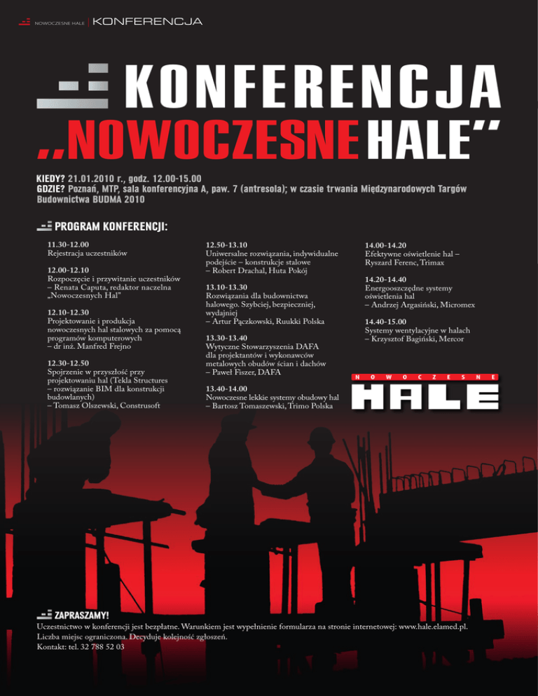 nowoczesne hale | konferencja KonferencjA „nowoczesne Hale” Kiedy? 21.01.2010 r., godz. 12.00-15.00 Gdzie? Poznań, MTP, sala konferencyjna A, paw. 7 (antresola); w czasie trwania Międzynarodowych Targów Budownictwa BUDMA 2010 Program konferencji: 11.30-12.00 Rejestracja uczestników 12.00-12.10 Rozpoczęcie i przywitanie uczestników – Renata Caputa, redaktor naczelna „Nowoczesnych Hal” 12.10-12.30 Projektowanie i produkcja nowoczesnych hal stalowych za pomocą programów komputerowych – dr inż. Manfred Frejno 12.30-12.50 Spojrzenie w przyszłość przy projektowaniu hal (Tekla Structures – rozwiązanie BIM dla konstrukcji budowlanych) – Tomasz Olszewski, Construsoft ZAPRASZAMY! 12.50-13.10 Uniwersalne rozwiązania, indywidualne podejście – konstrukcje stalowe – Robert Drachal, Huta Pokój 14.00-14.20 Efektywne oświetlenie hal – Ryszard Ferenc, Trimax 13.10-13.30 Rozwiązania dla budownictwa halowego. Szybciej, bezpieczniej, wydajniej – Artur Pączkowski, Ruukki Polska 14.20-14.40 Energooszczędne systemy oświetlenia hal – Andrzej Argasiński, Micromex 14.40-15.00 Systemy wentylacyjne w halach – Krzysztof Bagiński, Mercor 13.30-13.40 Wytyczne Stowarzyszenia DAFA dla projektantów i wykonawców metalowych obudów ścian i dachów – Paweł Fiszer, DAFA 13.40-14.00 Nowoczesne lekkie systemy obudowy hal – Bartosz Tomaszewski, Trimo Polska N o w o c z e s Uczestnictwo w konferencji jest bezpłatne. Warunkiem jest wypełnienie formularza na stronie internetowej: www.hale.elamed.pl. Liczba miejsc ograniczona. Decyduje kolejność zgłoszeń. Kontakt: tel. 32 788 52 03 n e