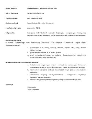 Nazwa projektu AKADEMIA GIER I ROZWOJU OSOBISTEGO Zakres /kategoria Rehabilitacja Społeczna Termin realizacji Maj - Grudzień 2013 Miejsce realizacji Rudzki Zakład Aktywności Zawodowej Beneficjenci projektu pracownicy RZAZ Cel projektu Rozwijanie indywidualnych zdolności logicznych, pamięciowych, kreatywnego myślenia, pobudzania wyobraźni, kształcenia umiejętności manualnych i twórczych. Harmonogram działań W ramach Tygodniowego Planu Rehabilitacji pracownicy będą korzystali z możliwości wzięcia udziału w popularnych grach: a. planszowych, m.in. szachy, warcaby, chińczyk, młynek, lotto, bingo, domino, kółko / krzyżyk, b. grach zręcznościowych, m.in. bierki, puzzle c. grach wymagających kreatywnego myślenia i ćwiczenia pamięci własnej m.in. biznes po polsku, mózg elektroniczny, Oczekiwania / skutki realizowanego projektu a. kształtowanie pozytywnych postaw i umiejętności społecznych, takich jak: poprawna komunikacja, porozumiewanie się z innymi, współdziałanie w grupie, b. nabywanie i rozwijanie zdolności koncentracji uwagi, pamięci oraz myślenia twórczego, c. wzmacnianie integracji wewnątrzzakładowej i nawiązywanie wzajemnych kontaktów interpersonalnych, d. nabycie umiejętności pożytecznego i aktywnego spędzania wolnego czasu. Ewaluacja Obserwacja. Tablica wyników.