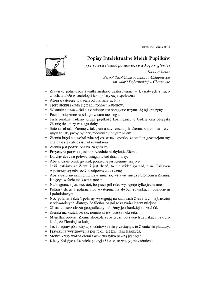 78 FOTON 103, Zima 2008 Popisy Intelektualne Moich Pupilków (ze zbioru Poznać po słowie, co u kogo w głowie) Danuta Latos Zespół Szkół Gastronomiczno-Usługowych im. Marii Dąbrowskiej w Chorzowie ∗ Zjawisko polaryzacji światła znalazło zastosowanie w lekarstwach i truciznach, a także w socjologii jako polaryzacja społeczna. ∗ Atom występuje w trzech odmianach: α, β i γ. ∗ Jądro atomu składa się z neutronów i kationów. ∗ W stanie nieważkości ciało wiszące na sprężynie trzyma się tej sprężyny. ∗ Poza orbitę ziemską siła grawitacji nie sięga. ∗ Jeśli sondzie nadamy drugą prędkość kosmiczną, to będzie ona obiegała Ziemię dwa razy w ciągu doby. ∗ Satelita okrąża Ziemię z taką samą szybkością jak Ziemia się obraca i wygląda to tak, jakby był przymocowany długim kijem. ∗ Ziemia kręci się wokół własnej osi w taki sposób, że satelita geostacjonarny znajduje się cały czas nad równikiem. ∗ Ziemia jest podzielona na 24 godziny. ∗ Przyczyną pór roku jest odpowiednie nachylenie Ziemi. ∗ Dzieląc dobę na połowy osiągamy cel dnia i nocy. ∗ Aby widzieć blask gwiazd, potrzebne jest ciemne miejsce. ∗ Jeśli jesteśmy na Ziemi i jest dzień, to nie widać gwiazd, a na Księżycu wystarczy się odwrócić w odpowiednią stronę. ∗ Aby zaszło zaćmienie. Księżyc musi się wstawić między Słońcem a Ziemią. Księżyc w fazie ma kształt stożka. ∗ Na biegunach jest przestój, bo przez pół roku występuje tylko jedna noc. ∗ Polarny dzień i polarna noc występują na dwóch równikach: północnym i południowym. ∗ Noc polarna i dzień polarny występują na czubkach Ziemi tych najbardziej zlodowaciałych, dlatego, że Słońce co pół roku zmienia tam miejsce. ∗ 21 marca nasz obszar geograficzny położony jest bardziej na wschód. ∗ Ziemia ma kształt owalu, ponieważ jest płaska i okrągła. ∗ Magellan opłynął Ziemię dookoła i stwierdził po swoich zapiskach i rysunkach, że Ziemia jest kulą. ∗ Jeśli bieguny północny z południowym się przyciągają, to Ziemia się płaszczy. ∗ Przyczyną występowania pór roku jest tzw. faza Księżyca. ∗ Słońce krąży wokół Ziemi i oświetla tylko pewną jej część. ∗ Kiedy Księżyc całkowicie pokryje Słońce, to wtedy jest zaćmienie.