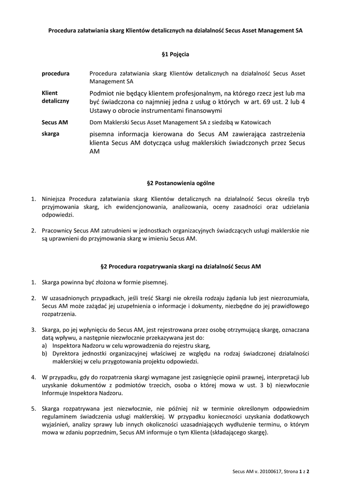 Procedura załatwiania skarg Klientów detalicznych na działalność Secus Asset Management SA §1 Pojęcia procedura Procedura załatwiania skarg Klientów detalicznych na działalność Secus Asset Management SA Klient detaliczny Podmiot nie będący klientem profesjonalnym, na którego rzecz jest lub ma być świadczona co najmniej jedna z usług o których w art. 69 ust. 2 lub 4 Ustawy o obrocie instrumentami finansowymi Secus AM Dom Maklerski Secus Asset Management SA z siedzibą w Katowicach skarga pisemna informacja kierowana do Secus AM zawierająca zastrzeżenia klienta Secus AM dotycząca usług maklerskich świadczonych przez Secus AM §2 Postanowienia ogólne 1. Niniejsza Procedura załatwiania skarg Klientów detalicznych na działalność Secus określa tryb przyjmowania skarg, ich ewidencjonowania, analizowania, oceny zasadności oraz udzielania odpowiedzi. 2. Pracownicy Secus AM zatrudnieni w jednostkach organizacyjnych świadczących usługi maklerskie nie są uprawnieni do przyjmowania skarg w imieniu Secus AM. §2 Procedura rozpatrywania skargi na działalność Secus AM 1. Skarga powinna być złożona w formie pisemnej. 2. W uzasadnionych przypadkach, jeśli treść Skargi nie określa rodzaju żądania lub jest niezrozumiała, Secus AM może zażądać jej uzupełnienia o informacje i dokumenty, niezbędne do jej prawidłowego rozpatrzenia. 3. Skarga, po jej wpłynięciu do Secus AM, jest rejestrowana przez osobę otrzymującą skargę, oznaczana datą wpływu, a następnie niezwłocznie przekazywana jest do: a) Inspektora Nadzoru w celu wprowadzenia do rejestru skarg, b) Dyrektora jednostki organizacyjnej właściwej ze względu na rodzaj świadczonej działalności maklerskiej w celu przygotowania projektu odpowiedzi. 4. W przypadku, gdy do rozpatrzenia skargi wymagane jest zasięgnięcie opinii prawnej, interpretacji lub uzyskanie dokumentów z podmiotów trzecich, osoba o której mowa w ust. 3 b) niezwłocznie Informuje Inspektora Nadzoru. 5. Skarga rozpatrywana jest niezwłocznie, nie później niż w terminie określonym odpowiednim regulaminem świadczenia usługi maklerskiej. W przypadku konieczności uzyskania dodatkowych wyjaśnień, analizy sprawy lub innych okoliczności uzasadniających wydłużenie terminu, o którym mowa w zdaniu poprzednim, Secus AM informuje o tym Klienta (składającego skargę). Secus AM v. 20100617, Strona 1 z 2 6. Za przygotowanie dokumentacji, wyjaśnień oraz projektu odpowiedzi, odpowiedzialna jest osoba, o której mowa w ust. 3b. Realizacja czynności w tym zakresie powinna nastąpić nie później niż w terminie 14 dni, chyba że skomplikowany stan sprawy wymaga dłuższego terminu. Wydłużenie tego terminu wymaga zgody Inspektora Nadzoru. 7. Odpowiedź na Skargę podpisuje Zarząd lub inna osoba upoważniona przez Zarząd. 8. Odpowiedź na Skargę zawiera decyzję dotyczącą sposobu jej załatwienia oraz zwięzłe uzasadnienie Odpowiedź na skargę powinna być sformułowana w sposób rzeczowy, zawierać odniesienie się do żądania Klienta, w sposób dla niego zrozumiały. 9. Odpowiedź na Skargę przekazywana jest w formie pisemnej na adres wskazany przez Klienta. Odpowiedź na Skargę może być przekazana w innym trybie i formie, niż pisemna, o ile Klient wyrazi na to zgodę lub wynika to z treści skargi. §3 Rejestr Skarg 1. Secus AM prowadzi rejestr skarg dotyczących działalności Secus AM. Rejestr jest prowadzony przez Inspektora Nadzoru w formie pisemnej lub elektronicznej. 2. Rejestr Skarg zawiera: a) imię i nazwisko lub firmę (nazwę) podmiotu składającego skargę, b) datę złożenia skargi, c) przedmiot skargi, wraz z datą zawarcia (lub numerem) oraz rodzajem umowy dotyczącej świadczenia usługi maklerskiej, d) środki podjęte w celu rozpatrzenia skargi, e) sposób rozpatrzenia skargi. 3. Treść skargi, dokumenty służące jej rozpatrzeniu oraz odpowiedź na skargę jest archiwizowana przez Secus AM. §2 Postanowienia końcowe 1. Pracownicy Secus AM zobowiązani są do zapoznania się i stosowania zapisów Procedury. 2. Procedura wchodzi w życie z dniem 17 czerwca 2010 roku Secus AM v. 20100617, Strona 2 z 2