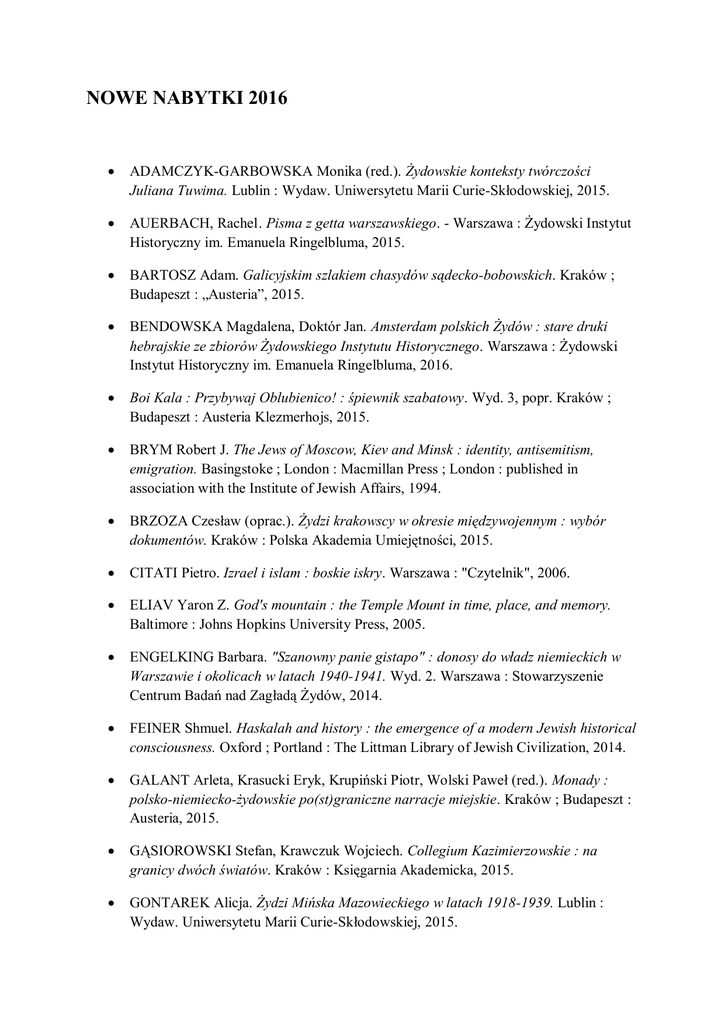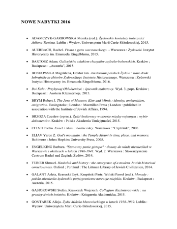 NOWE NABYTKI 2016 ADAMCZYK-GARBOWSKA Monika (red.). Żydowskie konteksty twórczości Juliana Tuwima. Lublin : Wydaw. Uniwersytetu Marii Curie-Skłodowskiej, 2015. AUERBACH, Rachel . Pisma z getta warszawskiego. - Warszawa : Żydowski Instytut Historyczny im. Emanuela Ringelbluma, 2015. BARTOSZ Adam. Galicyjskim szlakiem chasydów sądecko-bobowskich. Kraków ; Budapeszt : „Austeria”, 2015. BENDOWSKA Magdalena, Doktór Jan. Amsterdam polskich Żydów : stare druki hebrajskie ze zbiorów Żydowskiego Instytutu Historycznego. Warszawa : Żydowski Instytut Historyczny im. Emanuela Ringelbluma, 2016. Boi Kala : Przybywaj Oblubienico! : śpiewnik szabatowy. Wyd. 3, popr. Kraków ; Budapeszt : Austeria Klezmerhojs, 2015. BRYM Robert J. The Jews of Moscow, Kiev and Minsk : identity, antisemitism, emigration. Basingstoke ; London : Macmillan Press ; London : published in association with the Institute of Jewish Affairs, 1994. BRZOZA Czesław (oprac.). Żydzi krakowscy w okresie międzywojennym : wybór dokumentów. Kraków : Polska Akademia Umiejętności, 2015. CITATI Pietro. Izrael i islam : boskie iskry. Warszawa : "Czytelnik", 2006. ELIAV Yaron Z. God's mountain : the Temple Mount in time, place, and memory. Baltimore : Johns Hopkins University Press, 2005. ENGELKING Barbara. "Szanowny panie gistapo" : donosy do władz niemieckich w Warszawie i okolicach w latach 1940-1941. Wyd. 2. Warszawa : Stowarzyszenie Centrum Badań nad Zagładą Żydów, 2014. FEINER Shmuel. Haskalah and history : the emergence of a modern Jewish historical consciousness. Oxford ; Portland : The Littman Library of Jewish Civilization, 2014. GALANT Arleta, Krasucki Eryk, Krupiński Piotr, Wolski Paweł (red.). Monady : polsko-niemiecko-żydowskie po(st)graniczne narracje miejskie. Kraków ; Budapeszt : Austeria, 2015. GĄSIOROWSKI Stefan, Krawczuk Wojciech. Collegium Kazimierzowskie : na granicy dwóch światów. Kraków : Księgarnia Akademicka, 2015. GONTAREK Alicja. Żydzi Mińska Mazowieckiego w latach 1918-1939. Lublin : Wydaw. Uniwersytetu Marii Curie-Skłodowskiej, 2015. GÓRNIOK Łukasz. Swedish refugee policymaking in transition? : Czechoslovaks and Polish Jews in Sweden, 1968-1972. Umeå : Department of Historical, Philosophical and Religious Studies, Umeå University, 2016. GRABOWSKI Jan, LIBIONKA Dariusz (red.). Klucze i kasa : o mieniu żydowskim w Polsce pod okupacją niemiecką i we wczesnych latach powojennych 1939-1950. Warszawa : Stow. Centrum Badań nad Zagładą Żydów, 2014. GRABSKI, August. Centralny Komitet Żydów w Polsce (1944-1950) : historia polityczna. Warszawa : Żydowski Instytut Historyczny im. Emanuela Ringelbluma, 2015. HARSHAV, Benjamin. The polyphony of Jewish culture. Stanford : Stanford University Press, 2007. HESCHEL Abraham Joshua. Prorocy. Kraków : Wydaw. Esprit, cop. 2014. JAGODZIŃSKA Agnieszka, WODZIŃSKI Marcin (oprac.). "Izraelita" 1866-1915 : wybór źródeł. Kraków ; Budapeszt : Austeria, 2015. JAWORSKI Wojciech. Struktura i wpływy syjonistycznych organizacji politycznych w Polsce w latach 1918-1939. Warszawa : Rytm, 1996. JURANDOT Jerzy, GRODZIEŃSKA Stefania. Miasto skazanych : 2 lata w warszawskim getcie. Dzieci getta. Warszawa : Muzeum Historii Żydów Polskich, cop. 2014. KAHN Lily, RUBIN Aaron D. (ed..) Handbook of Jewish languages. Leiden ; Boston : Brill, cop. 2016. KASDAN Barney. Zwyczaje i obyczaje Żydów mesjańskich. Warszawa : Vocatio, cop. 2012. KOPCIOWSKI Adam. Wos hert zich in der prowinc? : prasa żydowska na Lubelszczyźnie i jej największy dziennik "Lubliner Tugblat". Lublin : Wydaw. Uniwersytetu Marii Curie-Skłodowskiej, 2015. KOSSEWSKA Elżbieta (red.). Brzemię pamięci : współczesne stosunki polskoizraelskie. Warszawa : Neriton, 2009. KOZUB-CIEMBRONIEWICZ Wiesław (red.). Uczeni żydowskiego pochodzenia we współczesnych dziejach Uniwersytetu Jagiellońskiego. Kraków : Wydaw. Uniwersytetu Jagiellońskiego, 2014. KRAUZE Joanna, Zieliński Konrad (red.). Medinat Israel : państwo i tożsamość. Lublin : Wydaw. Uniwersytetu Marii Curie-Skłodowskiej, 2013. LEWALSKI Krzysztof. Kościoły chrześcijańskie w Królestwie Polskim wobec Żydów w latach 1855-1915. Wyd. 2. Toruń : Wydaw. Nauk. Uniwersytetu Mikołaja Kopernika, 2013. MAKÓWKA-KWAPISIEWICZ Anna (red.). Antysemityzm nie jest poglądem : podręcznik dla edukatorów i edukatorek. Kraków : Żydowskie Stowarzyszenie Czulent, 2016. MAKÓWKA-KWAPISIEWICZ Anna (red.). Antysemityzm nie jest poglądem : podręcznik dla edukatorów i edukatorek wychowania przedszkolnego i wczesnoszkolnego. Kraków : Żydowskie Stowarzyszenie Czulent, 2016. MAŃKO Sławomir. Polski ruch ludowy wobec Żydów (1895-1939). Warszawa : Muzeum Historii Polskiego Ruchu Ludowego ; Rzeszów : Instytut Pamięci Narodowej. Komisja Ścigania Zbrodni przeciwko Narodowi Polskiemu. Oddział, 2010. Miszna. [2], Moed = (Święto). Warszawa : Wydaw. DiG, 2014. Miszna. [3], Naszim = (Kobiety). Warszawa : Wydaw. DiG ; Bellerive-sur-Allier : Edition La Rama, 2016. NOVIKOV Anna. Shades of a nation : the dynamics of belonging among the Silesian and Jewish populations in eastern Upper Silesia (1922 - 1934). Osnabrück : Fibre, cop. 2015. OGONOWSKI Jerzy. Sytuacja prawna Żydów w Rzeczypospolitej Polskiej 1918-1939 : prawa cywilne i polityczne. Warszawa : Żydowski Instytut Historyczny im. Emanuela Ringelbluma, 2012. PĘZIŃSKI Piotr. Na rozdrożu : młodzież żydowska w PRL 1956-1968. Warszawa : Żydowski Instytut Historyczny im. Emanuela Ringelbluma, 2014. POSŁUSZNY Łukasz. Przestrzenne formy upamiętniania Zagłady. Kraków : „Aureus”, 2014. POTEL Jean-Yves. Koniec niewinności : Polska wobec swojej żydowskiej przeszłości. Kraków : Znak, 2010. PREIZNER Joanna (red.). Współczesne kino izraelskie. Kraków ; Budapeszt : "Austeria", 2015. REDLICH Shimon. Na rozdrożu : Żydzi w powojennej Łodzi 1945-1950. Łódź : Instytut Pamięci Narodowej - Komisja Ścigania Zbrodni przeciwko Narodowi Polskiemu. Oddział, 2012