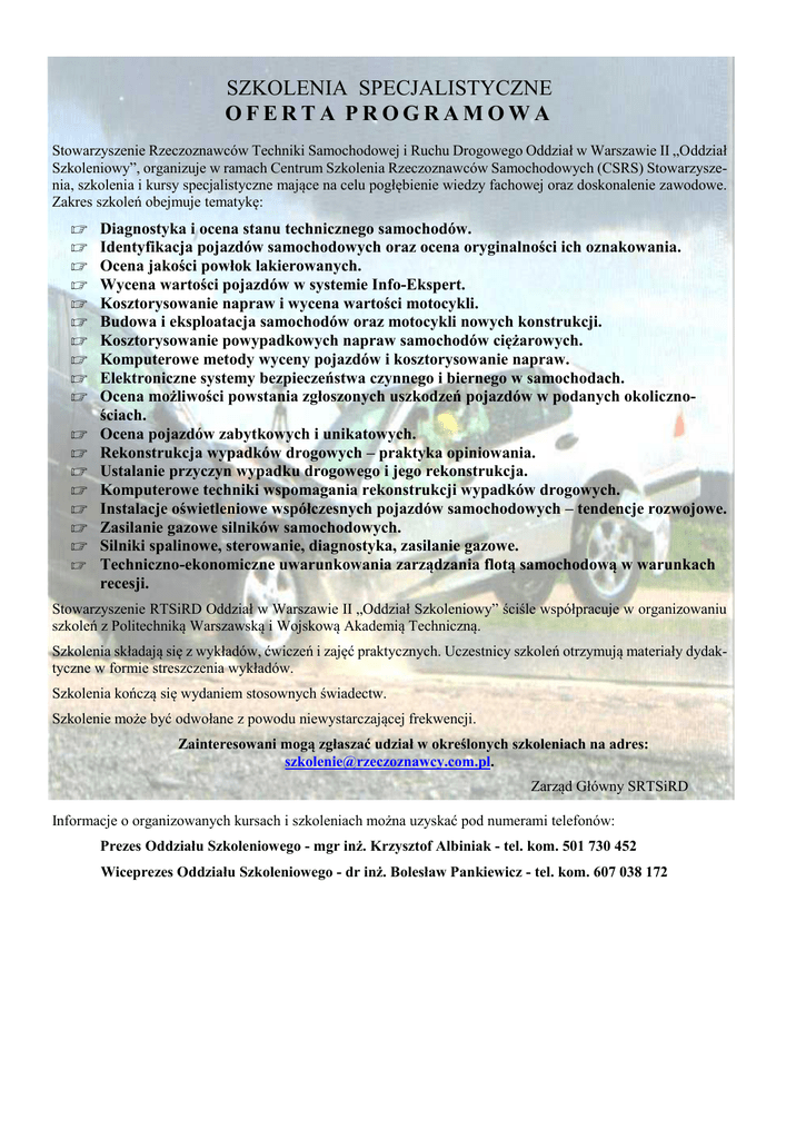 SZKOLENIA SPECJALISTYCZNE OFERTA PROGRAMOWA Stowarzyszenie Rzeczoznawców Techniki Samochodowej i Ruchu Drogowego Oddział w Warszawie II „Oddział Szkoleniowy”, organizuje w ramach Centrum Szkolenia Rzeczoznawców Samochodowych (CSRS) Stowarzyszenia, szkolenia i kursy specjalistyczne mające na celu pogłębienie wiedzy fachowej oraz doskonalenie zawodowe. Zakres szkoleń obejmuje tematykę: Diagnostyka i ocena stanu technicznego samochodów. Identyfikacja pojazdów samochodowych oraz ocena oryginalności ich oznakowania. Ocena jakości powłok lakierowanych. Wycena wartości pojazdów w systemie Info-Ekspert. Kosztorysowanie napraw i wycena wartości motocykli. Budowa i eksploatacja samochodów oraz motocykli nowych konstrukcji. Kosztorysowanie powypadkowych napraw samochodów ciężarowych. Komputerowe metody wyceny pojazdów i kosztorysowanie napraw. Elektroniczne systemy bezpieczeństwa czynnego i biernego w samochodach. Ocena możliwości powstania zgłoszonych uszkodzeń pojazdów w podanych okolicznościach. Ocena pojazdów zabytkowych i unikatowych. Rekonstrukcja wypadków drogowych – praktyka opiniowania. Ustalanie przyczyn wypadku drogowego i jego rekonstrukcja. Komputerowe techniki wspomagania rekonstrukcji wypadków drogowych. Instalacje oświetleniowe współczesnych pojazdów samochodowych – tendencje rozwojowe. Zasilanie gazowe silników samochodowych. Silniki spalinowe, sterowanie, diagnostyka, zasilanie gazowe. Techniczno-ekonomiczne uwarunkowania zarządzania flotą samochodową w warunkach recesji. Stowarzyszenie RTSiRD Oddział w Warszawie II „Oddział Szkoleniowy” ściśle współpracuje w organizowaniu szkoleń z Politechniką Warszawską i Wojskową Akademią Techniczną. Szkolenia składają się z wykładów, ćwiczeń i zajęć praktycznych. Uczestnicy szkoleń otrzymują materiały dydaktyczne w formie streszczenia wykładów. Szkolenia kończą się wydaniem stosownych świadectw. Szkolenie może być odwołane z powodu niewystarczającej frekwencji. Zainteresowani mogą zgłaszać udział w określonych szkoleniach na adres: [email protected]. Zarząd Główny SRTSiRD Informacje o organizowanych kursach i szkoleniach można uzyskać pod numerami telefonów: Prezes Oddziału Szkoleniowego - mgr inż. Krzysztof Albiniak - tel. kom. 501 730 452 Wiceprezes Oddziału Szkoleniowego - dr inż. Bolesław Pankiewicz - tel. kom. 607 038 172