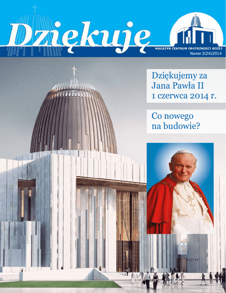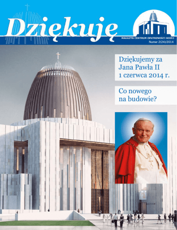 Numer 2(24)/2014 Dziękujemy za Jana Pawła II 1 czerwca 2014 r. Co nowego na budowie? 1 W Wilanowie Serdecznie zapraszam wszystkich, którym bliska jest idea wdzięczności Bożej Opatrzności, na ogólnonarodowe Święto Dziękczynienia, które tradycyjnie rozpocznie się uroczystą procesją z relikwiami Jana Pawła II. Pragniemy wspólnie wyrazić wdzięczność za dar życia, pontyfikatu i kanonizacji Wielkiego Polaka modląc się i bawiąc. Tegoroczne Święto Dziękczynienia odbywa się pod hasłem „Dziękujemy za Świętego Jana Pawła II”. Tak, jak Papież Jan Paweł II jednoczył Polaków w czasie swoich pielgrzymek do Polski, tak teraz i my mamy szansę, by zjednoczyć się 1 czerwca we wspólnym dziękczynieniu Bogu za otrzymane od Niego dary. Gorąco zachęcam do wzięcia udziału w procesji, uroczystej Mszy św. oraz w przygotowanych przez Centrum Opatrzności Bożej wydarzeniach o charakterze rozrywkowym i rodzinnym. Kazimierz Kardynał Nycz Arcybiskup Metropolita Warszawski Co nowego na budowie? W Świątyni Opatrzności Bożej rozpoczęto montaż granitowych stopni, które prowadzić będą do głównego wejścia. Do Muzeum będzie można wjechać windą P rzed Świątynią praca niemal nie ustaje. Od strony północnej powstają właśnie frontowe schody. Granitowe bloki spoczną na żelbetowej podbudowie, a ich trwałość ma zapewnić granit ze złóż kopalni 2 ,,Zimnik”, położonej w okolicach Strzegomia. Ten sam, który widać już niemal na całej elewacji muzeum. Pielgrzymi, którzy nawiedzą Świątynię Opatrzności Bożej już w najbliższe Święto Dziękczynienia, będą mieli do pokonania dziesięć stopni, każdy o szerokości 35 centymetrów. Całość rozciągać się będzie łukiem na długości aż 42 metrów. Schody mają wytrzymać kilkaset lat, więc budowane są z pełnych granitowych bloków, ważących w sumie około 60 ton. Żeby je ułożyć, wykonawcy muszą stworzyć specjalną podbudowę, złożoną z podwójnej warstwy izolacji przeciwwodnej, termicznej i tłucznia granitowego. Dopiero na nich spocznie żelbetowa konstrukcja i podsypka piaskowa, na których układane będą półtorametrowe bloki polskiego granitu. Schody poprowadzą do głównego wejścia, na poziom świątyni. Już 1 czerwca będzie można zobaczyć także pierwsze okna rotundy świątyni. – Rozpoczynamy prace nad rotundą. W pierwszym etapie planowany jest montaż okien o wysokości ok. 14 m oraz kamiennej elewacji rotundy od strony północnej. Wkrótce rozpoczną się także prace nad zamknięciem wewnętrznej płaszczyzny kopuły Świątyni – mówi inżynier budowy Centrum Opatrzności Bożej, Konrad Kulita. Równocześnie rozpocznie się realizacja elewacji strony północnej w postaci podwieszonego sufitu, czyli elewacji poziomej Muzeum. Utworzą ją panele z blachy miedzianej, zawieszone na stalowej konstrukcji. – To etap znacząco zbliżający nas do zamknięcia przedsięwzięcia elewacji Muzeum Jana Pawła II i Prymasa Wyszyńskiego – wyjaśnia Piotr Gaweł, prezes zarządu Centrum Opatrzności Bożej. W 2015 r. rozpoczną się także prace nad montażem czterech wind osobowych, które prowadzić będą zwiedzających i pielgrzymów do przestrzeni muzealnej oraz tarasu z niezwykłym widokiem na panoramę Warszawy. Powstanie też winda towarowo-osobowa. Specjalna winda połączy również zakrystię Świątyni z Sepultorium. – Oprócz zakupu wind, w 2015 r. planujemy wykończenie klatek schodowych. Przygotowujemy się także do realizacji docelowych instalacji elektrycznych w kopule, czyli oświetlenia Świątyni oraz jej iluminacji – dodaje Piotr Gaweł. 3 VII Święto Dziękczynienia Dziękujemy za Jana Pawła II Już od siedmiu lat przy Świątyni Opatrzności Bożej obchodzimy Święto Dziękczynienia. Motywem przewodnim tegorocznego święta, 1 czerwca, będzie wdzięczność za świętego Jana Pawła II U roczystość na Polach Wilanowskich zostanie poprzedzona procesją dziękczynną z relikwiami świętego Jana Pawła II. Dwunastokilometrową trasę, w towarzystwie dziecięcej orkiestry góralskiej oraz orkiestry górniczej, przejdą przedstawiciele różnych stanów, m.in. górnicy, górale, Kaszubi. Procesja wyruszy z Placu Piłsudskiego o godz. 8, by w południe dotrzeć do Świątyni Opatrzności Bożej, gdzie pielgrzymi będą uczestniczyli w dziękczynnej Mszy św. z uroczystym Aktem Zawierzenia i Dziękczynienia. Święto Dziękczynienia od wielu lat ma charakter rodzinny i radosny. Od godz. 13:30 do 19:00, najmłodsi wraz z rodzicami będą mogli odwiedzić Miasteczko dla Dzieci, gdzie będzie na nich czekała gra rodzinna „Jan Paweł II – święty dookoła świata”. W jej trakcie dzieci wyruszą wraz z Papieżem 4 - Polakiem w pielgrzymkę po sanktuariach maryjnych całego świata, m.in. do Fatimy, Guadalupe, Popenguine i Nagasaki. Będzie to świetna okazja do zapoznania się z życiem naszego Świętego, ale też z kulturą i zwyczajami chrześcijan z całego świata. Oprócz tego, dzieci znajdą w miasteczku teatrzyk oraz animacje w Namiocie Wdzięczności. Przez cały dzień Darczyńcy będą mieli możliwość wejścia na teren Świątyni i zobaczenia postępów przy pracach nad Muzeum Jana Pawła II i Prymasa Wyszyńskiego i Światyni Opatrzności Bożej, natomiast wszyscy pielgrzymi i goście zostaną zaproszeni do uczestnictwa w koncercie wspaniałych artystów: Alicji Majewskiej, Stana Borysa, Wilków, Ryszarda Rynkowskiego i wielu innych. O godz. 15 rozpocznie się bezpośrednia transmisja w TVP1, podczas której aktorzy znani z popularnych seriali, wraz ze swoimi Kanonizacja w Wilanowie dziećmi będą dzielić się wdzięcznością Bogu za cudowne wydarzenia ze swojego życia. Nie zabraknie też tradycyjnego wypuszczenia do nieba baloników „Dziękuję”. Święto Dziękczynienia zakończy wspólny śpiew i modlitwa uwielbienia oraz nabożeństwo czerwcowe. O 21:37 na budynku świątyni rozbłyśnie specjal