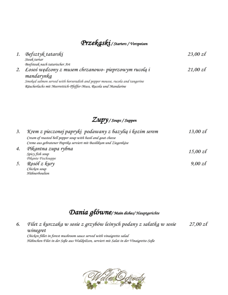 Przekąski / Starters / Vorspeisen 1. Befsztyk tatarski 23,00 zł Steak tartar Beefsteak nach tatarischer Art 2. Łosoś wędzony z musem chrzanowo- pieprzowym rucolą i mandarynką 21,00 zł Smoked salmon served with horseradish and pepper mousse, rucola and tangerine Räucherlachs mit Meerrettich-Pfeffer-Muss, Rucola und Mandarine Zupy / Soups / Suppen 3. Krem z pieczonej papryki podawany z bazylią i kozim serem 13,00 zł Cream of roasted bell pepper soup with basil and goat cheese Creme aus gebratener Paprika serviert mit Basilikum und Ziegenkäse 4. Pikantna zupa rybna Spicy fish soup Pikante Fischsuppe 5. Rosół z kury 15,00 zł 9,00 zł Chicken soup Hühnerboulion Dania główne/ Main dishes/ Hauptgerichte 6. Filet z kurczaka w sosie z grzybów leśnych podany z sałatką w sosie winegret Chicken fillet in forest mushroom sauce served with vinaigrette salad Hähnchen-Filet in der Soße aus Waldpilzen, serviert mit Salat in der Vinaigrette-Soße 27,00 zł 7. Polędwiczka wieprzowa nadziewana ćwikła, podawana na duszonych podgrzybkach z dodatkiem bukietu warzyw grillowanych 35,00 zł Pork tenderloin stuffed with ćwikła (Polish relish made with cooked and grated beetroot and horseradish), served on stewed bay bolete mushrooms and with a choice of grilled vegetables Schwein filet mit roter Rübe mit Meerrettich gefüllt, mit gedünsteten Maronenpilzen mit gegrillter Gemüseplatte 8. Medaliony z polędwicy wieprzowej podawane na sosie serowym z sałatką w sosie winegret 33,00 zł Pork sirloin medallions in cheese sauce served with vinaigrette salad Schweinelende-Medaillons in der Käse – Soße, serviert mit Salat in der Vinaigrette-Soße 9. Żeberka jagnięce na konfiturze z czerwonej cebuli podane z warzywami z grilla 57,00 zł Lamb ribs on red onion jam, served with grilled vegetables Lammrippchen in der Konfitüre aus rotem Zwiebel, serviert mit gegrilltem Gemüse 10. Pierś z kaczki na sosie śliwkowo- korzennym podana z sałatką w sosie winegret 47,00 zł Duck breast in plum-spicy sauce served with salad in vinaigrette sauce Entenbrust auf Pflaumen-Würzsauce serviert mit Salat mit Vinaigrette 11. Polędwica wołowa z grilla z sałatką z sosem winegret, serwowana na trzy sposoby do wyboru: - z masełkiem pieprzowo – serowym, - z sosem z musztardy Dijon - z ostrym sosem pieprzowym Grilled beef tenderloin with a salad with vinaigrette dressing, served in three different ways: - with pepper and cheese butter with Dijon mustard dressing - with spicy pepper dressing Gegrillter Rindlendenbraten mit Salat in Vinaigrette-Soβe, serviert in drei Weisen zur Auswahl: - mitPfeffer-Quark-Butter, - mit Soβe aus Dijon-Senf - mitscharferPfeffersoβe 69,00 zł 12. Rostbef w ostrym sosie grzybowym podany z warzywami z grilla 37,00 zł Roast beef in hot mushroom sauce served with grilled vegetables Rindslende in der scharfen Pilz-Soße, serviert mit gegrilltem Gemüse 13. Polędwica z dorsza serwowana w duszonych porach podawana z sałatką w sosie winegret 36,00 zł Cod sirolin stewed in leek served with salad and vinaigrette dressing Dorschlendenbraten in gedünsteten Lauchen mit Salat mit Vinaigrettesoβe 14. Halibut podawany na czosnkowo-serowym szpinaku i sałatką w sosie winegret 34,00 zł Halibut on garlic and cheese sauce served with vinaigrette salad Heilbutt, serviert in dem Knoblauch-Käse-Spinat und Salat in der Vinaigrette-Soße Dania Wegetariańskie/ Vegetarian Dishes / VegetarischeGerichte 15. Tagliatelle z prawdziwkami w sosie truflowym Tagliatelle with boletus in truffle sauce Tagliatelle mit Steinpilzen in Trüffelsauce 16. Pierogi ruskie na szpinaku Ruthenian pierogi on spinach Russische Piroggen 28,00 zł 16,00zł Dania dla dzieci/ Dishes for children / Kinderspeisen 17. Chrupiące polędwiczki z kurczaka w panierce z płatków kukurydzianych, frytki, sałatka 15,00 zł Crispy chicken sirloins coated with cornflakes, chips, salad Knusprige Lenden aus Hähnchen in Paniermehl aus Cornflakes, Pommes frites, Salat 18. Kotlecik schabowy, frytki, warzywa na parze Mini breaded pork, chips, steamed vegetables Kleines Schweinskottelet, Pommes frites, gedämpftes Gemüse 15,00 zł Makarony / Pasta / Nudeln 19. Tagliatelle z Krewetkami Black Tiger, sezamem i pomidorkami koktajlowymi w pietruszkowym pesto 32,00 zł Tagliatelle with Black Tiger shrimps, sesame and cocktail tomatoes in parsley pesto Tagliatelle mit Shrimps Black Tiger, mit Sesam und Cocktailtomaten in Petersillenpesto 20 Tagliatelle ze świeżymi pomidorami i pietruszką 19,00 zł Tagliatelle with fresh tomatoes and parsley Tagliatelle mit frischen Tomaten und Petersilie 21. Tagliatelle z prawdziwkami w sosie truflowym 28,00 zł Tagliatelle with boletus in truffle sauce Tagliatelle mit Steinpilzen in Trüffelsauce Sałatki /Salads / salate 22. Sałatka z polędwicą wołową, rucolą, truskawkami i serem pleśniowym z sosem owocowy winegret Salad with beef tenderloin, rucola, strawberries, mould cheese and fruit vinaigrette dressing Salat mit Rindlendenbraten, Rucola, Erdbeeren und Schimmelkäse in Obst-Vinaigrette-Soβe 23. Sałatka z krewetkami, młodym szpinakiem i kozim serem Salad with prawns, baby spinach and goat cheese Salat mit Garnelen, jungem Spinat und Ziegenkäse 24. Sałatka z kurczakiem w panierce sezamowo - słonecznikowym Vinaigrette salad with chicken in sesame and sunflower seeds Salat mit Sesam – Sonnenblumen-Hähnchen in der Vinaigrette-Soße Mix bułeczek z masełkiem czosnkowym w cenie sałatek Mix of rolls with garlic butter served free of charge with every salad Brötchen-Mix mit Knoblauchbutter im Preis der Salate 29,00 zł 27,00 zł 21,00 zł Dodatki / Side Dishes / Beilagen 25. Ćwiartki ziemniaków z ziołami 6,00 zł Potatoquarters with herbs Kartoffelviertel mit Kräutern 26. Kasza pęczak / Barley groats/ Graupen 6,00 zł 27. Frytki / Chips / Pommes frites 28. Ryż/ Rice / Reis 29. Gnochii / Gnocchi / Gnocchi 6,00 zł 6,00 zł 7,00 zł 30. Mix bułeczek z masełkiem czosnkowym Mi