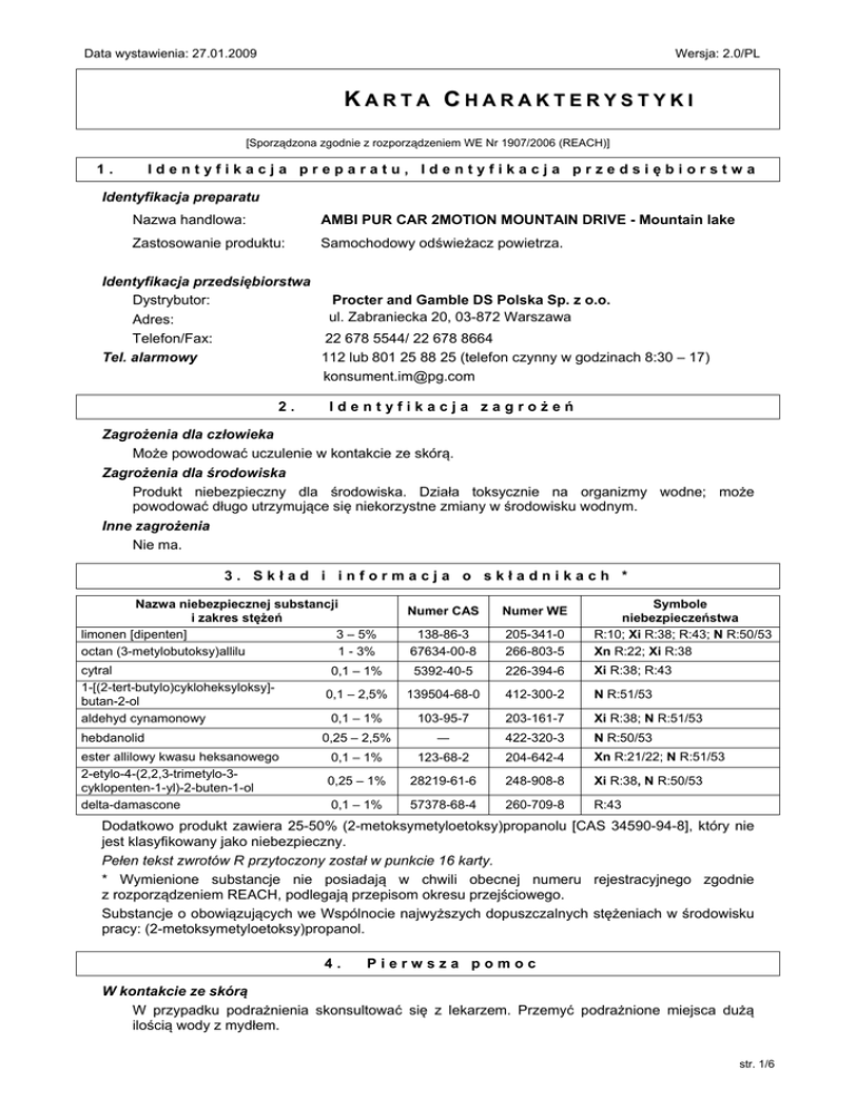 Wersja: 2.0/PL Data wystawienia: 27.01.2009 KARTA CHARAKTERYSTYKI [Sporządzona zgodnie z rozporządzeniem WE Nr 1907/2006 (REACH)] Identyfikacja preparatu, Identyfikacja przedsiębiorstwa 1. Identyfikacja preparatu Nazwa handlowa: AMBI PUR CAR 2MOTION MOUNTAIN DRIVE - Mountain lake Zastosowanie produktu: Samochodowy odświeżacz powietrza. Identyfikacja przedsiębiorstwa Dystrybutor: Procter and Gamble DS Polska Sp. z o.o. ul. Zabraniecka 20, 03-872 Warszawa Adres: 22 678 5544/ 22 678 8664 Telefon/Fax: Tel. alarmowy 112 lub 801 25 88 25 (telefon czynny w godzinach 8:30 – 17) [email protected] 2. Identyfikacja zagrożeń Zagrożenia dla człowieka Może powodować uczulenie w kontakcie ze skórą. Zagrożenia dla środowiska Produkt niebezpieczny dla środowiska. Działa toksycznie na organizmy wodne; może powodować długo utrzymujące się niekorzystne zmiany w środowisku wodnym. Inne zagrożenia Nie ma. 3. Skład i informacja o składnikach * Nazwa niebezpiecznej substancji i zakres stężeń limonen [dipenten] 3 – 5% octan (3-metylobutoksy)allilu 1 - 3% Numer CAS Numer WE 138-86-3 67634-00-8 205-341-0 266-803-5 Symbole niebezpieczeństwa R:10; Xi R:38; R:43; N R:50/53 Xn R:22; Xi R:38 cytral 1-[(2-tert-butylo)cykloheksyloksy]butan-2-ol aldehyd cynamonowy 0,1 – 1% 5392-40-5 226-394-6 Xi R:38; R:43 0,1 – 2,5% 139504-68-0 412-300-2 N R:51/53 0,1 – 1% 103-95-7 203-161-7 Xi R:38; N R:51/53 hebdanolid 0,25 – 2,5% ― 422-320-3 N R:50/53 0,1 – 1% 123-68-2 204-642-4 Xn R:21/22; N R:51/53 0,25 – 1% 28219-61-6 248-908-8 Xi R:38, N R:50/53 0,1 – 1% 57378-68-4 260-709-8 R:43 ester allilowy kwasu heksanowego 2-etylo-4-(2,2,3-trimetylo-3cyklopenten-1-yl)-2-buten-1-ol delta-damascone Dodatkowo produkt zawiera 25-50% (2-metoksymetyloetoksy)propanolu [CAS 34590-94-8], który nie jest klasyfikowany jako niebezpieczny. Pełen tekst zwrotów R przytoczony został w punkcie 16 karty. * Wymienione substancje nie posiadają w chwili obecnej numeru rejestracyjnego zgodnie z rozporządzeniem REACH, podlegają przepisom okresu przejściowego. Substancje o obowiązujących we Wspólnocie najwyższych dopuszczalnych stężeniach w środowisku pracy: (2-metoksymetyloetoksy)propanol. 4. Pierwsza pomoc W kontakcie ze skórą W przypadku podrażnienia skonsultować się z lekarzem. Przemyć podrażnione miejsca dużą ilością wody z mydłem. str. 1/6 K ARTA C HARAKTERYSTYKI W kontakcie z oczami Przemywać wodą przez przynajmniej 15 minut. Zdjąć szkła kontaktowe. Chronić niepodrażnione oko. Skonsultować się z lekarzem w przypadku jakichkolwiek dalszych dolegliwości. W przypadku spożycia Nie wywoływać wymiotów! W przypadku narażenia podać poszkodowanemu wodę do picia. Skontaktować się z lekarzem; pokazać opakowanie lub etykietę. Po narażeniu drogą oddechową Nie dotyczy w przypadku prawidłowego stosowania. W przypadkach wątpliwych wynieść poszkodowanego na świeże powietrze. 5. Postępowanie w przypadku pożaru Odpowiednie środki gaśnicze Piana gaśnicza odporna na działanie alkoholu, rozpylony strumień wody, suche środki gaśnicze. Nieodpowiednie środki gaśnicze Zwarty strumień wody – ryzyko rozprzestrzenienia pożaru. Szczególne wyposażenie podczas walki z ogniem Środki ochrony ogólnej typowe w przypadku pożaru. Nie należy przebywać w zagrożonej ogniem strefie bez odpowiedniego ubrania odpornego na chemikalia i aparatu do oddychania z niezależnym obiegiem powietrza. Niebezpieczne produkty rozkładu W przypadku całkowitego spalania nie ma szkodliwych produktów rozkładu. Uwagi dodatkowe Zagrożone ogniem pojemniki polewać z bezpiecznej odległości rozpylonym strumieniem wody. Nie dopuścić do przedostania się wody gaśniczej do wód powierzchniowych lub gruntowych. W przypadku całkowitego spalania nie ma szkodliwych produktów rozkładu. P o stę pow a n ie w prz yp a d ku n iez a m ierz on eg o uw oln i en i a do ś ro dow iska 6. Indywidualne środki ostrożności Istnieje niebezpieczeństwo poślizgnięcia się. Rozlany produkt należy natychmiast zetrzeć. Założyć buty z antypoślizgowymi podeszwami. Unikać kontaktu ze skórą i oczami. Patrz także pkt 8 Karty. Niezbędne środki w zakresie ochrony środowiska Nie należy dopuścić do przedostania się produktu do wód gruntowych, zbiorników i cieków wodnych ani do kanalizacji. Uwagi dodatkowe Zagrożone ogniem pojemniki polewać z bezpiecznej odległości rozpylonym strumieniem wody. Nie dopuścić do przedostania się wody gaśniczej do wód powierzchniowych lub gruntowych. 7. Postępowanie z preparatem i jego magazynowanie Postępowanie z preparatem Postępować zgodnie z zasadami bezpieczeństwa i higieny. Unikać kontaktu ze skórą i oczami. Magazynowanie Przechowywać tylko w suchych i dobrze wentylowanych pomieszczeniach. Trzymać z dala od żywności, napojów oraz pasz dla zwierząt. Specyficzne zastosowania Samochodowy odświeżacz powietrza. str. 2/6 K 8. ARTA C HARAKTERYSTYKI Kontrola narażania i środki ochrony indywidualnej Wartości graniczne narażania NDS Specyfikacja (2-metoksymetyloetoksy)propanol 240 mg/m NDSCh 3 NDSP 3 480 mg/m ⎯ TWA DSB 3 300 mg/m /8h ⎯ Kontrola narażenia w miejscu pracy Przestrzegać ogólnych zasad bezpieczeństwa i higieny. Po pracy z produktem należy dokładnie umyć ręce. Zapewnić odpowiednią wentylację. Ochrona oczu – nie jest wymagana. Ochrona dróg oddechowych – w przypadku większego wycieku nosić maskę z pochłaniaczem ochronnym typu A. Ochrona rąk – wymagane gumowe rękawice ochronne. Stosowane środki ochrony indywidualnej muszą spełniać wymagania zawarte w rozporządzeniu Ministra Gospodarki z dnia 28 grudnia 2005 r. (Dz. U. Nr 259, poz. 2173) oraz dyrektywy 89/686/WE (wraz z późn zm.). Pracodawca obowiązany jest zapewnić środki ochrony odpowiednie do wykonywanych czynności oraz spełniające wszystkie wymagania jakościowe, w tym również ich konserwację i oczyszczanie. Należy zastosować procedu