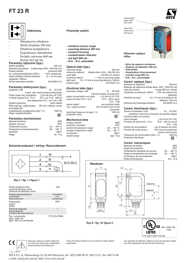 FT 23 R zielona LED / green LED / LED verte Odbiciowy - Miniaturowa obudowa Strefa działania 300 mm Obudowa kompaktowa Sygnalizacja zabrudzenia Światło czerwone 660 nm Wybór NO lub NC - Parametry optyczne (typ.) Strefa działania: 300 mm Materiał odniesienia: Kodak biały, 90%, 100x100 mm Rodzaj światła: czerwone 660 nm, pulsacyjneHistereza (90%): <10% ustawionej strefy działania Plamka świetlna: 12 x 12 mm przy odległości 160mm Norma warunków świetln.: EN 60947-5-2 Parametry elektryczne (typ.) Zasilanie +UB: 10 ... 30 VDC z wew. zab. przed zmianą polaryzacjiz Pobór prądu bez obciążenia: < 25 mA przy 24 V DC Funkcja wyjscia N.O. / N.C.: N.O.: pin 2 do -UB lub bez połączenia; N.C.: pin 2 do +UB Sygnał wyjściowy: patrz tabela Max prąd syg. wyjściowego: 100 mA z zabezp. przed przeciążeniem Częstotliwość przełączania (ti/tp 1:1): 1000 Hz 1) Klasa bezpieczeństwa:: Parametry mechaniczne Materiał obudowy: Stopień ochrony: Temperatura pracy: Temperatura przechowywania: Konektor: Waga: żółta LED / yellow LED / LED jaune Proximity switch ABS IP67 -20 ... +60 °C -20 ... +80 °C M8x1 ok. 10 g miniature sensor range scanning distance 300 mm compact housing contamination indicator red light 660 nm N.O. - N.C. selectable Détecteur optique réflex - Série de capteurs miniatures Optical data (typ.) scanning range: 300 mm reference material: Kodak white, 90%, 100x100 mm used light: red 660 nm, pulsed hysteresis (90%): < 10% of scanning range light spot: 12 x 12 mm at scanning distance 160mm ambient light: EN 60947-5-2 Electrical data (typ.) operating voltage +UB: 10 ... 30 VDC internal polarity reversal prot. power consumption (no load): < 25 mA at 24 V DC output function N.O. / N.C.: N.O.: -UB or open N.C.: +UB signal output: see selection table max. output current: 100 mA with short circuit protection switching frequency (at ppp 1:1): 1000 Hz 1) protection class: Mechanical data casing material: protection standard: ambient temperature range: storage temperature range: connection: weight (plug): ABS IP67 -20 ... +60 °C -20 ... +80 °C M8x1 app. 10 g - Distance de détéction 300 mm Petit boîtier Visualisation d'encrassement Lumière rouge 660 nm N.O. / N.C. commutable Caract. optique (typ.) Distance de détection: 300 mm Matériau de référence:Kodak blanc, 90%, 100x100 mm Type de lumière: rouge 660 nm, pulsée Hystérésis de distance: (90%) <10% de distance de détection Diamètre du spot: 12 x 12 mm à la distance de détection 160 mm Influence de l'éclairage ambient: EN 60947-5-2 Caract. électriques (typ.) Tension d'utilisation +UB: 10 ... 30 VDC protection contre les inversions de polarité intégré Consommation en courant (sans charge): < 25 mA à 24 V DC Fonction de sortie N.O. / N.C.: N.O.: -UB on ouvert N.C.: +UB Sorties de commutation: voir le tableau de choix Courant de sortie (max.): 100 mA avec protection contre court-circuits Fréquence de commutation (ti/tp 1:1): 1000 Hz 1) Protection électrique: Caract. mécaniques Schemat połączeń / wiring / Raccordement Matériau de boîtier: Degré de protection: Température ambiante de service: Plage de température de stockage: Connecteur de raccordement: Poids (Connecteur): ABS IP67 -20 ... +60 °C -20 ... +80 °C M8x1 env. 10 g Obudowa Rys.1 / fig. 1 / figure 1 Strefa działania (mm) scanning distance (mm) Distance de détéction (mm) Rodzaj wyprowadzenia connection Raccordement Polaryzacja output Sortie Schemat połączeń wiring diagram Schéma de branchement Typ / oznaczenie type / order ref. type / Réf. de commande 300 Konektorr con. connecteur PNP 1 FT 23 R-PSM4 Powyższy optyczny czujnik odbiciowy nie może być stosowany w aplikacjach bezpieczeństwa lub podobnych. 1) Uimp = 500 V Rys.2 / fig. 12/ figure 2 These Proximity Switches are not suited for safety related applications. SELS S.J. ul. Malawskiego 5a, 02-641Warszawa, tel.: (022) 848 08 42, 848 52 81, fax: 848 16 48 e-mail: [email protected], http://www.sels.com.pl Ces appareils de détection optique ne peuvent pas être utilisés pour des applications de sécurité des personnes.
