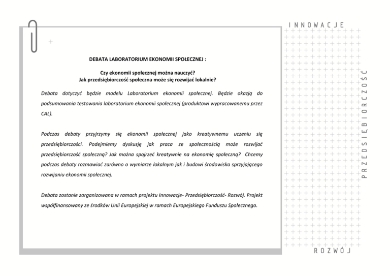 DEBATA LABORATORIUM EKONOMII SPOŁECZNEJ : Czy ekonomii społecznej można nauczyć? Jak przedsiębiorczość społeczna może się rozwijać lokalnie? Debata dotyczyć będzie modelu Laboratorium ekonomii społecznej. Będzie okazją do podsumowania testowania laboratorium ekonomii społecznej (produktowi wypracowanemu przez CAL). Podczas debaty przedsiębiorczości. przyjrzymy się ekonomii społecznej Podejmiemy dyskusję jak praca jako kreatywnemu uczeniu się ze społecznością może rozwijać przedsiębiorczość społeczną? Jak można spojrzeć kreatywnie na ekonomię społeczną? Chcemy podczas debaty rozmawiać zarówno o wymiarze lokalnym jak i budowi środowiska sprzyjającego rozwijaniu ekonomii społecznej. Debata zostanie zorganizowana w ramach projektu Innowacje- Przedsiębiorczość- Rozwój. Projekt współfinansowany ze środków Unii Europejskiej w ramach Europejskiego Funduszu Społecznego. PROGRAM DEBATY 25 czerwiec 2012 r., Warszawa 10.00-11.00 Rejestracja uczestników 11.00- 12.45 Wystąpienia ekspertów: Jak można spojrzeć kreatywnie na ekonomię społeczną? Jak budować lokalne środowisko sprzyjające rozwijaniu ekonomii społecznej? Kim jest przedsiębiorca społeczny? 12.45-13.00 Przerwa kawowa 13.00- 15.00 Debata ekspertów i uczestników: moderator dr Bohdan Skrzypczak 15.00 Obiad