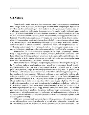 Od Autora Stopa jest niezwykle ważnym elementem statyczno-dynamicznym utrzymującym masę całego ciała, a ponadto jest swoistym mechanizmem napędowym. Sprawność i wydolność stóp uzależniona jest od ich budowy morfologicznej, a zwłaszcza od prawidłowego sklepienia podłużnego i poprzecznego, przedniej strefy podparcia oraz stępu. Sklepienie stopy pełni rolę amortyzatora wstrząsów, chroni narządy wewnętrzne oraz ośrodkowy układ nerwowy przed mikrourazami powstającymi w trakcie lokomocji. Warunki życia codziennego wymagają od człowieka dużej aktywności ruchowej i korzystania z powierzchni utwardzonych, które powodują przeciążenia stóp, a w konsekwencji – zanik sklepienia podłużnego i poprzecznego, koślawość palucha, szpotawość palca V, a także koślawość i szpotawość pięty. Stan taki prowadzi do niewydolności kończyn dolnych w warunkach statyki i dynamiki, a z czasem może powodować zmiany zwyrodnieniowe kręgosłupa oraz niestabilność stawów obwodowych. Stopa składa się z trzech odcinków: tylnego, środkowego i przedniego. Odcinek tylny to stęp, tworzy go siedem kości: piętowa, skokowa, łódkowata, sześcienna i trzy kości klinowate. Odcinek środkowy utworzony jest przez pięć kości śródstopia. Odcinek przedni to kości palców zbudowane z trzech paliczków, przy czym paluch ma tylko dwa – bliższy i dalszy [Bochenek, Reicher 1990]. Stopa tworzy mocne sprężyste sklepienie przystosowane do dźwigania masy ciała. Prawidłowa budowa morfologiczna stopy umożliwia przenoszenie dwóch składowych siły nacisku przez kość piszczelową na kość skokową. Jedna biegnie w kierunku guza kości piętowej, druga wzdłuż długiej osi kości skokowej do I i V głowy kości śródstopia. Układ kostny stopy ma swoistą architekturę utworzoną przez system łuków podłużnych i poprzecznych. Sklepienie podłużne tworzy pięć łuków podłużnych, zbiegających się z tyłu i paletowo rozłożonych z przodu stopy. Trzy łuki podłużne przyśrodkowe biegną od I, II, III głowy kości śródstopia przez trzy kości klinowe i kość łódkowatą do kości skokowej. Dwa łuki boczne biegną od głowy IV i V kości śródstopia, przechodząc przez kość sześcienną do kości piętowej. Paletowy układ kości śródstopia zawiera część nieruchomą, utworzoną przez II i III łuk podłużny, który stabilizuje sklepienie podłużne stopy podczas obciążenia masą ciała. Łuki boczne przystosowują stopę do podłoża. Sklepienie podłużne stopy wzmacniają: rozcięgno podeszwowe, więzadła podeszwowe, a zwłaszcza więzadło podeszwowe długie, więzadło piętowo-sześcienne oraz więzadło piętowo-łódkowe podtrzymujące głowę kości skokowej [Parcou 1981]. Sklepienie poprzeczne utworzone jest przez łuki poprzeczne, w tylnej części stopy są one niekompletne, natomiast całkowite w części tylnej śródstopia i przedniej stępu. Sklepienie poprzeczne rozpięte jest między głowami pięciu kości śródstopia, które 6 Paweł Lizis ▪ Sklepienie stóp oraz ich związki z wybranymi cechami morfologicznymi... ustawione są w jednej poziomej linii. Przednie punkty podparcia stopy to głowa I i V kości śródstopia. Widoczne w odciążeniu sklepienie poprzeczne utworzone jest przez podeszwowe uwypuklenie przedniego kłębu śródstopno-paliczkowego. Sklepienie poprzeczne wzmacniają poprzecznie przebiegające więzadła śródstopno-podeszwowe, głównie więzadła poprzeczne głębokie śródstopia, łączące głowy wszystkich kości śródstopia. Mięśnie napinają sklepienie podłużne i poprzeczne stopy. Należą do nich mięśnie długie, których przyczepy znajdują się na kościach podudzia: piszczelowy tylny, piszczelowy przedni, strzałkowy długi i krótki, zginacz palców długi, zginacz palucha długi, a także mięśnie krótkie podeszwowej powierzchni stopy: odwodziciel palucha, zginacz palucha krótki, przywodziciel palucha, odwodziciel palca małego, zginacz palca małego, przeciwstawiacz palca małego, zginacz palców krótki, czworoboczny podeszwy, glistowate, międzykostne [Bochenek, Reicher 1990; Parcou 1981]. Palce stopy mają również istotne znaczenie dla jej prawidłowego funkcjonowania. Ruchy palców stopy polegają na ich przyleganiu do podłoża, na chwytaniu opuszkami nierówności terenu podczas poruszania się. Ta czynność ma obecnie coraz mniejsze znaczenie, ponieważ opuszki palców przylegają w marszu do podeszwy buta, co powoduje ich unieruchomienie. Zaburzenia biomechaniki stopy prowadzą do zmian w jej architekturze kostnej. Deformacje stóp powstają najczęściej na skutek obniżenia się sklepienia podłużnego i poprzecznego, a przyczyny deformacji mogą być nabyte lub wrodzone. Przyczynami deformacji nabytych są: nieodpowiednie obuwie, twarde, bitumiczne podłoże, otyłość, niewydolność mięśniowa, wady budowy kończyn dolnych, krzywica, praca na stojąco, predyspozycje osobnicze, a wrodzonych: ubytki i niedorozwój kośćca, atonia mięśniowa, uszkodzenie centralnego i obwodowego układu nerwowego. Ocena związków budowy stopy z różnymi cechami morfofunkcjonalnymi od dawna była przedmiotem zainteresowania wielu specjalistów z dziedziny anatomii, antropologii, medycyny sportu oraz ergonomii, w której to gałęzi wiedzy szczególną rolę odgrywają badania stóp pod kątem potrzeb przemysłu obuwniczego. Stosowano metody subiektywne, w których ważną rolę odgrywa oglądanie stóp oraz metody obiektywne, polegające na wykonywaniu pomiarów antropometrycznych, zdjęć radiologicznych, plantogramów, badań tensometrycznych rozkładu sił nacisku na podeszwową powierzchnię stóp w warunkach statyki i dynamiki [Alanen i wsp. 1995; Arcan, Brüll 1976; Berkowitz i wsp. 1991; Bieniek 1977; Brodersen i wsp. 1993; Calvo i wsp. 2003; Cavanagh i wsp. 1992; Ciechomski, Kozłowski 1979a, 1979b; Cornwell, McPoil 1994; Dahle i wsp. 1991; Dall 1984; Demczuk 1994; 