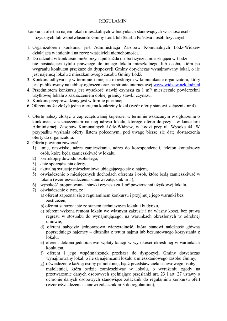 REGULAMIN konkursu ofert na najem lokali mieszkalnych w budynkach stanowiących własność osób fizycznych lub współwłasność Gminy Łódź lub Skarbu Państwa i osób fizycznych 1. Organizatorem konkursu jest Administracja Zasobów Komunalnych Łódź-Widzew działająca w imieniu i na rzecz właścicieli nieruchomości. 2. Do udziału w konkursie może przystąpić każda osoba fizyczna mieszkająca w Łodzi nie posiadająca tytułu prawnego do innego lokalu mieszkalnego lub osoba, która po wygraniu konkursu przekaże do dyspozycji Gminy dotychczas wynajmowany lokal, o ile jest najemcą lokalu z mieszkaniowego zasobu Gminy Łódź. 3. Konkurs odbywa się w terminie i miejscu określonym w komunikacie organizatora, który jest publikowany na tablicy ogłoszeń oraz na stronie internetowej www.widzew.azk.lodz.pl 4. Przedmiotem konkursu jest wysokość stawki czynszu za 1 m²/ miesięcznie powierzchni użytkowej lokalu z zaznaczeniem dolnej granicy stawki czynszu. 5. Konkurs przeprowadzany jest w formie pisemnej. 6. Oferent może złożyć jedną ofertę na konkretny lokal (wzór oferty stanowi załącznik nr 4). 7. Ofertę należy złożyć w zapieczętowanej kopercie, w terminie wskazanym w ogłoszeniu o konkursie, z zaznaczeniem na niej adresu lokalu, którego oferta dotyczy - w kancelarii Administracji Zasobów Komunalnych Łódź-Widzew, w Łodzi przy ul. Wysoka 44. W przypadku wysłania oferty listem poleconym, pod uwagę bierze się datę dostarczenia oferty do organizatora. 8. Oferta powinna zawierać: 1) imię, nazwisko, adres zamieszkania, adres do korespondencji, telefon kontaktowy osób, które będą zamieszkiwać w lokalu, 2) kserokopię dowodu osobistego, 3) datę sporządzenia oferty, 4) aktualną sytuację mieszkaniową ubiegającego się o najem, 5) oświadczenie o miesięcznych dochodach oferenta i osób, które będą zamieszkiwać w lokalu (wzór oświadczenia stanowi załącznik nr 5), 6) wysokość proponowanej stawki czynszu za 1 m² powierzchni użytkowej lokalu, 7) oświadczenie o tym, że : a) oferent zapoznał się z regulaminem konkursu i przyjmuje jego warunki bez zastrzeżeń, b) oferent zapoznał się ze stanem technicznym lokalu i budynku, c) oferent wykona remont lokalu we własnym zakresie i na własny koszt, bez prawa regresu w stosunku do wynajmującego, na warunkach określonych w odrębnej umowie, d) oferent nabędzie jednorazowo wierzytelność, która stanowi należność główną poprzedniego najemcy – dłużnika z tytułu najmu lub bezumownego korzystania z lokalu, e) oferent dokona jednorazowo wpłaty kaucji w wysokości określonej w warunkach konkursu, f) oferent i jego współmałżonek przekażą do dyspozycji Gminy dotychczas wynajmowany lokal, o ile są najemcami lokalu z mieszkaniowego zasobu Gminy, g) oświadczenie każdej osoby pełnoletniej, bądź przedstawiciela ustawowego osoby małoletniej, która będzie zamieszkiwać w lokalu, o wyrażeniu zgody na przetwarzanie danych osobowych spełniające przesłanki art. 23 i art. 27 ustawy o ochronie danych osobowych stanowiące załącznik do regulaminu konkursu ofert (wzór oświadczenia stanowi załącznik nr 3 do regulaminu), h) oświadczenie, że oferent nie posiada tytułu prawnego do innego lokalu (o którym mowa w pkt. 2), i) podpis oferenta/oferentów, w przypadku gdy oferentami są małżonkowie – podpisy małżonków. 9. Otwarcie oraz ocena ofert dokonywane są komisyjnie. 10. Komisja, powołana Zarządzeniem nr …..… Dyrektora AZK Łódź-Widzew z dnia …….... października 2013 r. w sprawie wprowadzenia regulaminów wynajmu lokali mieszkalnych i użytkowych w nieruchomościach stanowiących własność osób fizycznych lub współwłasność Gminy Łódź lub Skarbu Państwa i osób fizycznych, odpowiada za prawidłowy przebieg konkursu oraz: 1) ustala liczbę złożonych ofert, dokonuje sprawdzenia złożonych ofert w zakresie prawidłowości i kompletności ich przygotowania. Oferty nieprawidłowo przygotowane i niekompletne oraz złożone po terminie podlegają odrzuceniu, 2) nie rozpatruje ofert nieczytelnych lub zawierających nieautoryzowane przeróbki i skreślenia, 3) ocenia ważne oferty, odrzuca oferty, które nie zawierają danych określonych w pkt. 8 Regulaminu, 4) dokonując wyboru oferty ocenia wysokość proponowanej stawki czynszu, bierze pod uwagę sytuację mieszkaniową oferenta oraz oświadczenie o dochodach 5) wybiera ofertę w głosowaniu jawnym zwykłą większością głosów (w przypadku równej ilości głosów, decyduje głos przewodniczącego). 11. Komisja każdorazowo dokonuje wyboru warunkowego dwóch ofert, na wypadek rezygnacji osoby, która wygrała konkurs. Przy wyborze ofert warunkowych ustalana jest ich kolejność. 12. Z przebiegu konkursu ofert komisja sporządza protokół, który zawiera: 1) termin i miejsce przeprowadzenia konkursu, 2) skład komisji konkursowej, 3) oznaczenie lokali mieszkalnych, będących przedmiotem konkursu, 4) liczbę złożonych ofert, 5) liczbę ofert odrzuconych, 6) imiona, nazwiska i adresy oferentów, którzy wygrali konkurs. 13. Protokół podpisują członkowie komisji. Każda strona protokołu winna być podpisana przez członków komisji. 14. Ustalenia komisji akceptuje Dyrektor AZK Łódź-Widzew. 15. Wyniki prac komisji organizator wywiesza na tablicy ogłoszeń i stronie internetowej www.widzew.azk.lodz.pl 16. Organizator może odstąpić od przeprowadzenia konkursu ofert w całości lub na poszczególne lokale bez podania przyczyn. 17. W kwestiach spornych lub dotyczących interpretacji postanowień niniejszego regulaminu stanowisko rozstrzygające w imieniu komisji zajmuje przewodniczący. 18. Wygrywający konkurs jest zobowiązany do przystąpienia do zawarcia umowy najmu w ciągu 14 dni roboczych od dnia uzyskania zawiadomienia od organizatora konkursu o wygraniu konkursu pod rygorem odstąpienia przez organizatora od zawarcia umowy najmu.