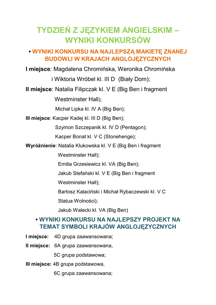 TYDZIEŃ Z JĘZYKIEM ANGIELSKIM – WYNIKI KONKURSÓW • WYNIKI KONKURSU NA NAJLEPSZĄ MAKIETĘ ZNANEJ BUDOWLI W KRAJACH ANGLOJĘZYCZNYCH I miejsce: Magdalena Chromińska, Weronika Chromińska i Wiktoria Wróbel kl. III D (Biały Dom); II miejsce: Natalia Filipczak kl. V E (Big Ben i fragment Westminster Hall); Michał Lipka kl. IV A (Big Ben); III miejsce: Kacper Kadej kl. III D (Big Ben); Szymon Szczepanik kl. IV D (Pentagon); Kacper Bonat kl. V C (Stonehenge); Wyróżnienie: Natalia Klukowska kl. V E (Big Ben i fragment Westminster Hall); Emilia Grzesiewicz kl. VA (Big Ben); Jakub Stefański kl. V E (Big Ben i fragment Westminster Hall); Bartosz Kalaciński i Michał Rybaczewski kl. V C Statua Wolności); Jakub Walecki kl. VA (Big Ben) • WYNIKI KONKURSU NA NAJLEPSZY PROJEKT NA TEMAT SYMBOLI KRAJÓW ANGLOJĘZYCZNYCH I miejsce: 4D grupa zaawansowana; II miejsce: 6A grupa zaawansowana, 5C grupa podstawowa; III miejsce: 4B grupa podstawowa, 6C grupa zaawansowana; Wyróżnienie: 4E, 5C grupa zaawansowana, 4A grupa podstawowa, 6E grupa podstawowa, 6F grupa zaawansowana, 6B grupa zaawansowana, 6F grupa podstawowa, 5E grupa podstawowa. • WYNIKI KONKURSU NA NAJZABAWNIEJSZĄ MINISCENKĘ W JĘZYKU ANGIELSKIM I miejsce kl. VIa: Wiktoria Branowska Zuzanna Pietrasik Ewa Stecewicz Marta Kowalczyk II miejsce kl. Ve: Wiktoria Krasuska Dominik Antoniak III miejsce kl. Ve: Łukasz Skiba Mateusz Czapski Szymon Cylwik Kacper Krupa wyróżnienie kl. VIe: Ługowski Eryk Ługowski Natalia Swinarska Emilia Misiak • WYNIKI KONKURSU PIOSENKI ANGLOJĘZYCZNEJ „BUGS WORLD” I MIEJSCE: ALEKSANDRA RUDZIŃSKA I ZUZANNA MROCZKOWSKA IIIA II MIEJSCE: AMADEUSZ TYMOSZUK IIC III MIEJSCE: EMILIA HULEWSKA IIIA HUBERT WÓJCIK IID EMILIA BARYCKA IA WYRÓŻNIENIE: URSZULA CHOJECKA IE WIKTORIA WYSOKIŃSKA IA DOBROMIR DRAGUN IIIC ALEKSANDRA KORNACKA I DAGMARA ZALEWSKA IIE NATALIA ADAMIAK, OLIWIA MIŚKIEWICZ, DOMINIKA DMOWSKA IIB • WYNIKI KONKURSU RECYTACJI LIMERYKÓW I miejsce: Milena Tur 3A II miejsce: Szymon Szczepanik IVD III miejsce: Filip Lisowski IVD wyróżnienie: Kacper Wysocki IVD Wojciech Górczyński IVD Wiktor Mazur IVB • WYNIKI KONKURSU PIOSENKI ANGLOJĘZYCZNEJ „I CAN SING” I miejsce: Karolina Mikołajuk VD II miejsce: Wiktoria Krasuska VE III miejsce: (duet) Aleksandra Krasuska i Weronika Borkowska VD WYNIKI Z KONKURSU INTERPRETACJI PROZY ANGLOJĘZYCZNEJ I miejsce: - Krzymowski Marcin VC II miejsce: - Bartosiak Natalia VA III miejsce: - Branowska Wiktoria VIA wyróżnienie: Michałowski Damian VIC, Irzykiewicz Joanna VIF Wyniki Konkursu Wiedzy o Kulturze i Historii Krajów Anglojęzycznych I miejsce: - Branowska Wiktoria VIA II miejsce: - Szostek Michalina VIE III miejsce: - Wiktoria Borkowska VIA GRATULUJEMY!