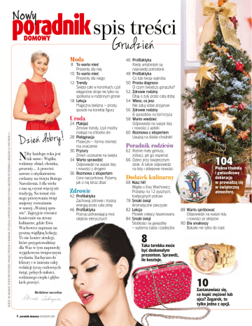 Nowy spis treści "(2 Moda 8 To warto mieć Prezenty dla niej 10 To warto mieć Prezenty dla niego 12 Trendy Święta całe w koronkach, czyli eleganckie stroje nie tylko na spotkania w rodzinnym gronie 18 Lekcja Magiczna bielizna – prosty sposób na korektę figury Uroda ZDJĘCIE NA OKŁADCE: STUDIO PRO PICTURES. MAKIJAŻ I FRYZURA: P. NOWACKA. STYLIZACJA: A.MIETELSKA: SUKIENKA TK MAXX, BIŻUTERIA: BY DZIUBEKA; A.ROGALSKI (3), MAK MEDIA (1) Dz " 0i N iby każdego roku jest tak samo : Wigilia, rodzinny obiad, choinka, prezenty… A przecież zawsze z utęsknieniem czekamy na święta Bożego Narodzenia. I dla wielu z nas są czymś więcej niż tradycją. Na temat różnego przeżywania świąt snujemy rozważania w naszej „Ważnej sprawie”. Zajrzyjcie również koniecznie na strony kulinarne, gdzie Ewa Wachowicz zaprasza na pyszną wigilijną kolację. To nie koniec atrakcji, które przygotowaliśmy dla Was w tym naprawdę wyjątkowym świątecznym wydaniu. Zachęcam do lektury i w imieniu całej redakcji życzę cudownych świąt, pełnych miłości, rodzinnego ciepła i głębokich przeżyć. Redaktor naczelna 4 poradnik domowy GRUDZIEŃ 2013 24 Makijaż Zimowe trendy, czyli modny makijaż na chłodne dni 28 Pielęgnacja Maseczki – forma również ma znaczenie 30 Fryzury Zmień uczesanie na święta 34 Warto sprawdzić Odpowiedzi na wasze listy i nowości z drogerii 36 Rozmowa z ekspertem Cera naczynkowa. Pytamy, jak o nią teraz dbać Zdrowie 42 Profilaktyka Zachowaj zdrowie i tryskaj energią przez cała zimę 46 Profilaktyka Poznaj uzdrawiającą moc olejków eterycznych 46 Profilaktyka Kiedy antybiotyki są naprawdę potrzebne 48 Profilaktyka Co lubi twoja wątroba 50 Prosta diagnoza O czym świadczy gorączka? 52 Zdrowie rodziny Dbaj o żyły przez całą dobę 54 Wiesz, co jesz Nie żałuj sobie przypraw 56 Zdrowie rodziny 6 sposobów na ból krzyża 58 Warto wiedzieć Odpowiedzi na wasze listy i nowości z apteki 60 Rozmowa z ekspertem Uważaj na śliskie chodniki! Poradnik rodziców 62 Rośnie mały geniusz, zobacz, jak go wspierać 66 Dzieci przy świątecznym stole. A także odpowiedzi na listy i sklepowe nowości Dodatek kulinarny 68 Nasz hit! Wigilia u Ewy Wachowicz. Przepisy na 12 pysznych, tradycyjnych potraw 78 Smaki świąt Aromatyczne pieczyste 82 Lekcja Mostek cielęcy faszerowany 84 Smaki świąt Słodkości na gwiazdkę – wyborna ciasta i ciasteczka 104 Piękna choinka i gwiazdkowe dekoracje w prowadzą cię w świąteczną atmosferę. 88 Warto spróbować Odpowiedzi na wasze listy i nowości ze sklepów 90 Dla smakoszy Bakalie nie tylko do ciast 8 Taka torebka może być doskonałym prezentem. Sprawdź, ile kosztuje. 10 Zastanawiasz się, co kupić mężowi lub ojcu? Zegarek, to tylko jedna z opcji. DODATEK KULINARNY 84 Przepisy na Boże Narodzenie. Te dania po prostu muszą się udać! 68 Na wigilijną wieczerzę zaprasza Ewa Wachowicz. 120 Teneryfa – poczuj słoneczne promienie w środku zimy. 12 Koronkowe 112 Co włożyć lub kreacje. W nich olśnisz wszystkich gości. wsypać do karmnika? Ważna sprawa 92 Bóg się rodzi, czas świętować! To tylko tradycja, wolne dni, czy potrzeba wynikająca z wiary? Sprawdź, co myślą o tym nasi eksperci. Psychologia 96 Między nami Wybacz i zapomnij, a będziesz szczęśliwsza. Psycholog podpowiada, jak uporać się z krzywdami, których doznaliśmy 100 Jestem ważna Test... asertywności 102 Rozmowa z ekspertem Konwersacje przy świątecznym stole Dom i ogród 104 Inspiracje Kochamy święta! Niech dekoracje wprowadzą nas w ich klimat 108 Zakupy Gładko lub w kant. Bierzemy pod lupę żelazka 110 Lekcja Pakujemy prezenty 112 Zwierzęta Pomóż ptakom zimą! 114 Warto wiedzieć Odpowiedzi na wasze listy i nowości ze sklepu Bliskie spotkania 22 Wywiad z Pauliną Sykut-Jeżyną: Bez bliskich nie ma świąt! 38 Reportaż Wigilijny cud Mikołaja. Za jego sprawą opłatkiem podzieliło się… 600 gości! Prawo i finanse 116 Cywilne Mikołaj pożycza pieniądze. Radzimy, jak wybrać najkorzystniejszy kredyt GRUDNIOWY „PORADNIK DOMOWY” KUPISZ TAKŻE Z… …kalendarzem kulinarnym na 2014 rok. Na powitanie każdego miesiąca znajdziesz w nim sprawdzony przepis na danie słodkie lub wytrawne. Po prostu palce lizać! Czas relaksu 120 Podróże Zwiedzamy Teneryfę! 124 Kultura Najlepsze książki, filmy, muzyka, wydarzenia 126 Krzyżówki 128 Horoskop 130 Za miesiąc KALENDARZ KULINARNY 2014 WYDANIE SPECJALNE Nr 3 listopad 2013 1_1_okladka_PORDS_3 _2013_736597.indd 1 9/27/13 2:54 PM Polecamy jeden z najpopularniejszych portali kulinarnych w Polsce! * * na podstawie badania Megapanel PBI/Gemius, XII 2012, grupa: wszyscy 7+ GRUDZIEŃ 2013 poradnik domowy 5