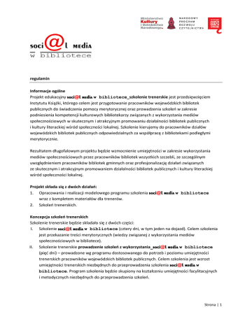 regulamin Informacje ogólne Projekt edukacyjny soci@l media w bibliotece_szkolenie trenerskie jest przedsięwzięciem Instytutu Książki, którego celem jest przygotowanie pracowników wojewódzkich bibliotek publicznych do świadczenia pomocy merytorycznej oraz prowadzenia szkoleń w zakresie podniesienia kompetencji kulturowych bibliotekarzy związanych z wykorzystania mediów społecznościowych w skutecznym i atrakcyjnym promowaniu działalności bibliotek publicznych i kultury literackiej wśród społeczności lokalnej. Szkolenie kierujemy do pracowników działów wojewódzkich bibliotek publicznych odpowiedzialnych za współpracę z bibliotekami podległymi merytorycznie. Rezultatem długofalowym projektu będzie wzmocnienie umiejętności w zakresie wykorzystania mediów społecznościowych przez pracowników bibliotek wszystkich szczebli, ze szczególnym uwzględnieniem pracowników bibliotek gminnych oraz profesjonalizację działań związanych ze skutecznym i atrakcyjnym promowaniem działalności bibliotek publicznych i kultury literackiej wśród społeczności lokalnej. Projekt składa się z dwóch działań: 1. Opracowania i realizacji modelowego programu szkolenia soci@l media w bibliotece wraz z kompletem materiałów dla trenerów. 2. Szkoleń trenerskich. Koncepcja szkoleń trenerskich Szkolenie trenerskie będzie składało się z dwóch części: I. Szkolenie soci@l media w bibliotece (cztery dni, w tym jeden na dojazd). Celem szkolenia jest przekazanie treści merytorycznych (wiedzy związanej z wykorzystania mediów społecznościowych w bibliotece). II. Szkolenie trenerskie prowadzenie szkoleń z wykorzystania_soci@l media w bibliotece (pięć dni) – prowadzone wg programu dostosowanego do potrzeb i poziomu umiejętności trenerskich pracowników wojewódzkich bibliotek publicznych. Celem szkolenia jest wzrost umiejętności trenerskich niezbędnych do przeprowadzenia szkolenia soci@l media w bibliotece. Program szkolenia będzie skupiony na kształceniu umiejętności facylitacyjnych i metodycznych niezbędnych do przeprowadzenia szkoleń. Strona | 1 Uczestnictwo w szkoleniach Do uczestniczenia w szkoleniach mają prawo osoby – pracownicy wojewódzkich bibliotek publicznych, które przesłały wypełniony formularz zgłoszeniowy wraz z oświadczeniem oraz otrzymały potwierdzenie uczestnictwa. Zobowiązania osób uczestniczących Osoby uczestniczące w szkoleniach zobligowane są do: 1. Obecności na całości zajęć w terminach: a. 21-24 października 2014 roku (21 października 2014 – dzień przyjazdu uczestników, 22-24 października 2014 - zajęcia). 2. 3. b. 24-28 listopada 2014 roku. Przygotowania i realizacji zadań pomiędzy szkoleniami – wg informacji otrzymanych na szkoleniu. Udzielania pomocy – po zakończeniu całego cyklu szkoleniowego – pracownikom bibliotek podległych merytorycznie w zakresie wdrażania mediów społecznościowych w ich bibliotekach. Ukończenie projektu i dokumenty Każdy uczestnik otrzyma zaświadczenie o ukończeniu szkolenia trenerskiego. Zaświadczenie otrzymają osoby, które wypełnią wszystkie zobowiązania wymienione w części „Zobowiązania osób uczestniczących”. Finansowanie Udział w szkoleniu jest finansowany w całości ze środków Instytutu Książki. Szkolenia będą realizowane w Warszawie. Organizatorzy zapewniają: noclegi w pokojach 2-osobowych trzy noclegi w trakcie szkolenia z zarządzania projektem kulturalnym oraz cztery noclegi w trakcie szkolenia trenerskiego; całodzienne wyżywienie; salę szkoleniową z niezbędnym wyposażeniem; komplet materiałów dla osób uczestniczących. Uwagi końcowe 1. Szczegółowe zasady współpracy zostaną sformułowane i spisane podczas pierwszego szkolenia. 2. Zapoznanie się z treścią regulaminu potwierdza się poprzez złożenie formularza zgłoszeniowego. 3. Organizator zastrzega sobie prawo do niewielkich zmian w programie oraz zmiany terminów spotkań po wcześniejszym zawiadomieniu osób uczestniczących. Strona | 2