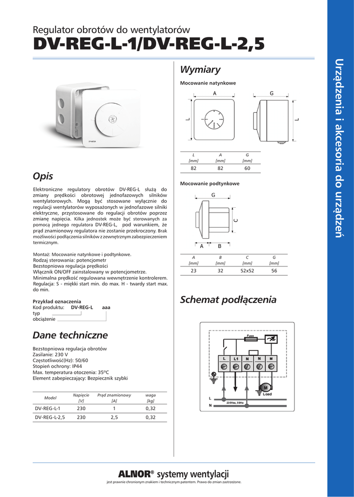 Regulator obrotów do wentylatorów DV-REG-L-1/DV-REG-L-2,5 Urządzenia i akcesoria do urządzeń Wymiary Mocowanie natynkowe Opis Elektroniczne regulatory obrotów DV-REG-L służą do zmiany prędkości obrotowej jednofazowych silników wentylatorowych. Mogą być stosowane wyłącznie do regulacji wentylatorów wyposażonych w jednofazowe silniki elektryczne, przystosowane do regulacji obrotów poprzez zmianę napięcia. Kilka jednostek może być sterowanych za pomocą jednego regulatora DV-REG-L, pod warunkiem, że prąd znamionowy regulatora nie zostanie przekroczony. Brak L [mm] A [mm] G [mm] 82 82 60 Mocowanie podtynkowe możliwości podłączenia silników z zewnętrznym zabezpieczeniem termicznym. Montaż: Mocowanie natynkowe i podtynkowe. Rodzaj sterowania: potencjometr Bezstopniowa regulacja prędkości Włącznik ON/OFF zainstalowany w potencjometrze. Minimalna prędkość regulowana wewnętrzenie kontrolerem. Regulacja: S - miękki start min. do max. H - twardy start max. do min. A [mm] B [mm] C [mm] G [mm] 23 32 52x52 56 Schemat podłączenia Przykład oznaczenia Kod produktu: DV-REG-L aaa typ obciążenie Dane techniczne Bezstopniowa regulacja obrotów Zasilanie: 230 V Częstotliwość(Hz): 50/60 Stopień ochrony: IP44 Max. temperatura otoczenia: 35ºC Element zabepieczający: Bezpiecznik szybki Napięcie [V] Prąd znamionowy [A] waga [kg] DV-REG-L-1 230 1 0,32 DV-REG-L-2,5 230 2,5 0,32 Model ALNOR® systemy wentylacji jest prawnie chronionym znakiem i technicznym patentem. Prawo do zmian zastrzeżone.