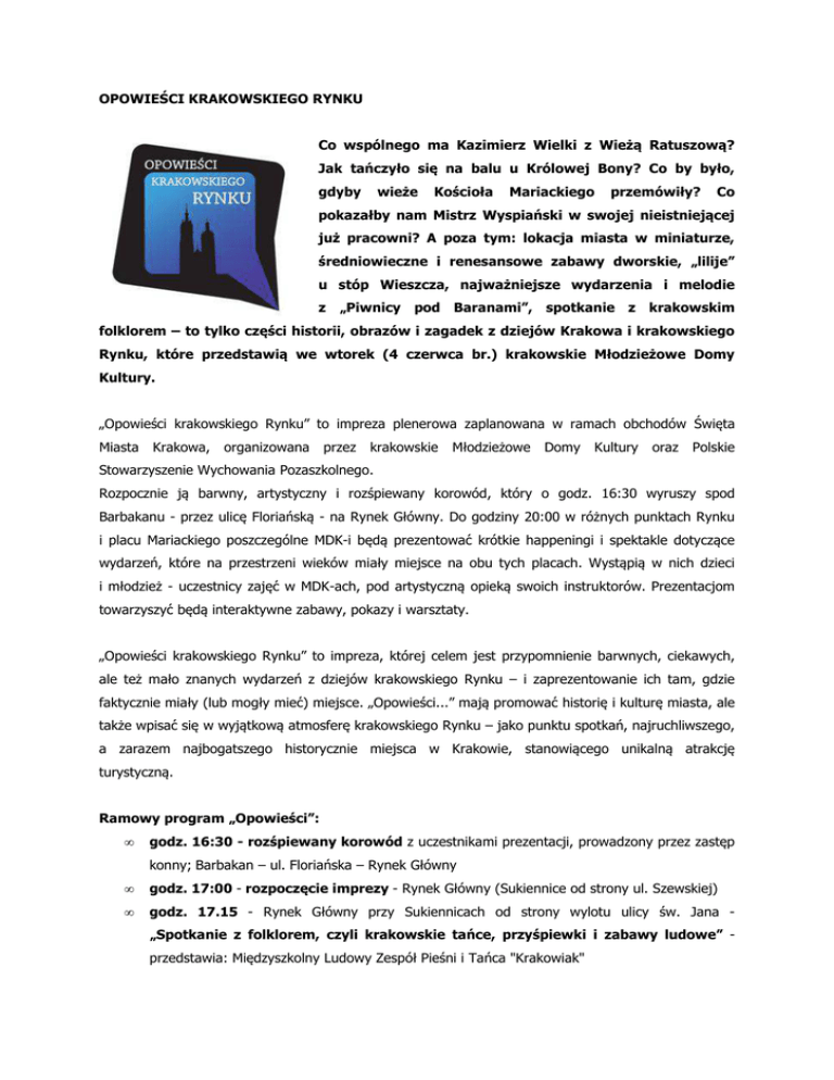OPOWIEŚCI KRAKOWSKIEGO RYNKU Co wspólnego ma Kazimierz Wielki z Wieżą Ratuszową? Jak tańczyło się na balu u Królowej Bony? Co by było, gdyby wieże Kościoła Mariackiego przemówiły? Co pokazałby nam Mistrz Wyspiański w swojej nieistniejącej już pracowni? A poza tym: lokacja miasta w miniaturze, średniowieczne i renesansowe zabawy dworskie, „lilije” u stóp Wieszcza, najważniejsze wydarzenia i melodie z „Piwnicy pod Baranami”, spotkanie z krakowskim folklorem – to tylko części historii, obrazów i zagadek z dziejów Krakowa i krakowskiego Rynku, które przedstawią we wtorek (4 czerwca br.) krakowskie Młodzieżowe Domy Kultury. „Opowieści krakowskiego Rynku” to impreza plenerowa zaplanowana w ramach obchodów Święta Miasta Krakowa, organizowana przez krakowskie Młodzieżowe Domy Kultury oraz Polskie Stowarzyszenie Wychowania Pozaszkolnego. Rozpocznie ją barwny, artystyczny i rozśpiewany korowód, który o godz. 16:30 wyruszy spod Barbakanu - przez ulicę Floriańską - na Rynek Główny. Do godziny 20:00 w różnych punktach Rynku i placu Mariackiego poszczególne MDK-i będą prezentować krótkie happeningi i spektakle dotyczące wydarzeń, które na przestrzeni wieków miały miejsce na obu tych placach. Wystąpią w nich dzieci i młodzież - uczestnicy zajęć w MDK-ach, pod artystyczną opieką swoich instruktorów. Prezentacjom towarzyszyć będą interaktywne zabawy, pokazy i warsztaty. „Opowieści krakowskiego Rynku” to impreza, której celem jest przypomnienie barwnych, ciekawych, ale też mało znanych wydarzeń z dziejów krakowskiego Rynku – i zaprezentowanie ich tam, gdzie faktycznie miały (lub mogły mieć) miejsce. „Opowieści...” mają promować historię i kulturę miasta, ale także wpisać się w wyjątkową atmosferę krakowskiego Rynku – jako punktu spotkań, najruchliwszego, a zarazem najbogatszego historycznie miejsca w Krakowie, stanowiącego unikalną atrakcję turystyczną. Ramowy program „Opowieści”: • godz. 16:30 - rozśpiewany korowód z uczestnikami prezentacji, prowadzony przez zastęp konny; Barbakan – ul. Floriańska – Rynek Główny • godz. 17:00 - rozpoczęcie imprezy - Rynek Główny (Sukiennice od strony ul. Szewskiej) • godz. 17.15 - Rynek Główny przy Sukiennicach od strony wylotu ulicy św. Jana „Spotkanie z folklorem, czyli krakowskie tańce, przyśpiewki i zabawy ludowe” przedstawia: Międzyszkolny Ludowy Zespół Pieśni i Tańca "Krakowiak" • godz. 17:30 - narożnik Rynku Głównego u wylotu ulic Szczepańskiej i Sławkowskiej – „Kartonowe zabytki Krakowa” - przedstawia: MDK „Dom Harcerza” ul. Reymonta • godz. 17.45 - Rynek Główny przy Sukiennicach od strony ulicy Brackiej - „Hołd Pruski” przedstawia: MDK im. K. I. Gałczyńskiego • godz. 18.00 - plac Mariacki od strony ulicy Floriańskiej – „Gdyby przemówiły wieże” przedstawia: MDK al. 29 Listopada • godz. 18.15 - Rynek Główny przy Wieży Ratuszowej od strony pomnika autorstwa I. Mitoraja - „Opowieści na tle Piwnicy pod Baranami” - przedstawia: MDK im. J. Korczaka • godz. 18.30 - Rynek Główny, okolice pomnika A. Mickiewicza - „LILIJE u stóp Wieszcza, w 115. rocznicę odsłonięcia pomnika” - przedstawia: MDK im. A. Bursy • godz. 18.45 – Rynek Główny przy Sukiennicach, okolice fontanny - „Bal w Sukiennicach” oraz „Opowieść o zaczarowanych gołębiach” - przedstawia: MDK Fort 49 „Krzesławice” • godz. 19.00 - Rynek Główny przed wejściem do Wieży Ratuszowej - „Rekonstrukcje średniowiecznych epizodów na krakowskim rynku” - przedstawia: MDK „Dom Harcerza” ul. Lotnicza • godz. 19.15 - Rynek Główny przed wejściem do Empiku – „Zatrzymani w młodopolskim czasie” – przedstawia: Staromiejskie Centrum Kultury Młodzieży • godz. 19.30 - plac Mariacki od strony wejścia do Kościoła Mariackiego – „Wyspiański – duchy pracowni” - przedstawia: Centrum Młodzieży im. dr. H. Jordana • godz. 19.45 - Rynek Główny przy kościele św. Wojciecha od strony pomnika A. Mickiewicza „Artyści Krakowskiego Rynku” - przedstawia: MDK ul. Grunwaldzka Organizatorzy „Opowieści Krakowskiego Rynku”: Młodzieżowy Dom Kultury al. 29 Listopada 102 Młodzieżowy Dom Kultury im. Andrzeja Bursy Młodzieżowy Dom Kultury „Dom Harcerza" ul. Reymonta Młodzieżowy Dom Kultury im. K. I. Gałczyńskiego Młodzieżowy Dom Kultury przy ul. Grunwaldzkiej 5 Centrum Młodzieży im. dr. Henryka Jordana w Krakowie Młodzieżowy Dom Kultury "Dom Harcerza" im. prof. A. Kamińskiego ul. Lotnicza Młodzieżowy Dom Kultury im. J. Korczaka Międzyszkolny Ludowy Zespół Pieśni i Tańca "Krakowiak" Młodzieżowy Dom Kultury Fort 49 „Krzesławice” Staromiejskie Centrum Kultury Młodzieży Polskie Stowarzyszenie Wychowania Pozaszkolnego im. Aleksandra Kamińskiego „Opowieści Krakowskiego Rynku” (4 czerwca, Rynek Główny i plac Mariacki) Szczegółowy program: Godz. 16:30 - Barbakan – ul. Floriańska – Rynek Główny – rozśpiewany korowód z uczestnikami prezentacji, prowadzony przez zastęp konny. Godz. 17:00 - Rynek Główny (Sukiennice od strony ul. Szewskiej) - rozpoczęcie imprezy, przywitanie publiczności. Godz. 17.15 - Rynek Główny przy Sukiennicach od strony wylotu ulicy św. Jana „Spotkanie z folklorem, czyli krakowskie tańce, przyśpiewki i zabawy ludowe” przedstawia: Międzyszkolny Ludowy Zespół Pieśni i Tańca "Krakowiak" Tradycja folklorystyczna Małopolski, wspaniałe układy choreograficzne i interpretacje wokalne, barwne stroje i rzemiosło, ludowe tańce i pieśni charakterystyczne dla regionu krakowskiego. Widzowie zobaczą polkę, szewczyka i sztajerka (czyli taniec krakowskich kwiaciarek), usłyszą krakowskie pieśni ludowe - „Płynie Wisła” i „Hej, na krakowskim Rynku”, a na koniec poznają „Woźnicę” i „Krakowiaka z lajkonikiem”. Dodatkową atrakcją będą zaś zabawy ludowe i warsztaty 