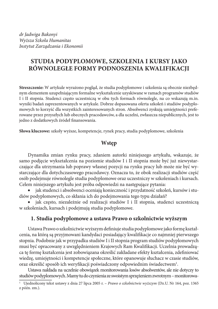 dr Jadwiga Bakonyi Wyższa Szkoła Humanitas Instytut Zarządzania i Ekonomii STUDIA PODYPLOMOWE, SZKOLENIA I KURSY JAKO RÓWNOLEGŁE FORMY PODNOSZENIA KWALIFIKACJI Streszczenie: W artykule wyrażono pogląd, że studia podyplomowe i szkolenia są obecnie niezbędnym elementem uzupełniającym formalne wykształcenie uzyskiwane w ramach programów studiów I i II stopnia. Studenci często uczestniczą w obu tych formach równolegle, na co wskazują m.in. wyniki badań zaprezentowanych w artykule. Dobrze dopasowana oferta szkoleń i studiów podyplomowych to korzyść dla wszystkich zainteresowanych stron. Absolwenci zyskują umiejętności preferowane przez przyszłych lub obecnych pracodawców, a dla uczelni, zwłaszcza niepublicznych, jest to jedno z dodatkowych źródeł finansowania. Słowa kluczowe: szkoły wyższe, kompetencje, rynek pracy, studia podyplomowe, szkolenia Wstęp Dynamika zmian rynku pracy, zdaniem autorki niniejszego artykułu, wskazuje, że samo podjęcie wykształcenia na poziomie studiów I i II stopnia może być już niewystarczające dla utrzymania lub poprawy własnej pozycji na rynku pracy lub może nie być wystarczające dla dotychczasowego pracodawcy. Oznacza to, że obok realizacji studiów część osób podejmuje równolegle studia podyplomowe oraz uczestniczy w szkoleniach i kursach. Celem niniejszego artykułu jest próba odpowiedzi na następujące pytania: x jak studenci i absolwenci oceniają konieczność i przydatność szkoleń, kursów i studiów podyplomowych, co skłania ich do podejmowania tego typu działań? x jak często, niezależnie od realizacji studiów I i II stopnia, studenci uczestniczą w szkoleniach, kursach i podejmują studia podyplomowe. 1. Studia podyplomowe a ustawa Prawo o szkolnictwie wyższym Ustawa Prawo o szkolnictwie wyższym definiuje studia podyplomowe jako formę kształcenia, na którą są przyjmowani kandydaci posiadający kwalifikacje co najmniej pierwszego stopnia. Podobnie jak w przypadku studiów I i II stopnia program studiów podyplomowych musi być opracowany z uwzględnieniem Krajowych Ram Kwalifikacji. Uczelnia prowadząca tę formę kształcenia jest zobowiązana określić zakładane efekty kształcenia, zdefiniować wiedzę, umiejętności i kompetencje społeczne, które opanowuje słuchacz w czasie studiów, oraz określić sposób ich weryfikacji poświadczony odpowiednim świadectwem1. Ustawa nakłada na uczelnie obowiązek monitorowania losów absolwentów, ale nie dotyczy to studiów podyplomowych. Mamy tu do czynienia ze swoistym sprzężeniem zwrotnym – monitorowa1 Ujednolicony tekst ustawy z dnia 27 lipca 2005 r. – Prawo o szkolnictwie wyższym (Dz.U. Nr 164, poz. 1365 z późn. zm.). 92 Zeszyty Naukowe Wyższej Szkoły Humanitas. Zarządzanie nie losów absolwentów I i II stopnia studiów pozwala na stworzenie lepszej oferty szkoleń uzupełniających kwalifikacje, bardziej dopasowanej do wymagań rynku pracy. Wprowadzenie monitorowania losów uczestników studiów podyplomowych pozwoliłoby na ocenę tych studiów, ich przydatności, a tym samym miałoby wpływ na propozycje tematyczne nowych studiów podyplomowych. 2. Rola studiów podyplomowych i szkoleń Decydującą rolą systemu kształcenia jest przygotowanie absolwenta do funkcjonowania na zmiennym rynku pracy, wyposażenie go w specjalistyczną wiedzę, zawodowe umiejętności, ale także konieczne kompetencje społeczne. Student, absolwent, pracownik w każdej z tych ról buduje swoją wartość na rynku pracy. Ważne jest, w które elementy wiedzy, umiejętności oraz kompetencji powinien być wyposażony absolwent studiów I i II stopnia, a które mogą być rozwijane w ramach studiów podyplomowych i których nie da się nauczyć w czasie studiów i dlatego inne formy kształcenia są elementem niezbędnym. Obecnie znacząca część studentów podejmuje zatrudnienie, a ich kompetencje są weryfikowane na stanowiskach pracy oraz podczas podejmowania i prowadzenia z sukcesem samodzielnej działalności gospodarczej. Problem kompetencji i kwalifikacji pracowniczych jest szeroko opisywany w literaturze przedmiotu. Najogólniej przyjmuje się, że mają one związek z cechami i właściwościami ludzi, bądź są kojarzone z właściwościami stanowisk pracy. Ponieważ pojęcia te często są stosowane wymiennie, można przyjąć, że2: x kwalifikacje to udokumentowana zdolność do wykonywania określonej pracy (np. dyplom, certyfikat, dorobek naukowy); x kompetencje to również formalne potwierdzenie zdolności do wykonywania pracy, ale poparte praktyczną umiejętnością wykonywania zadań. W literaturze wiele miejsca poświęca się również problematyce rozwoju, doskonalenia pracowników. R.W. Griffin definiuje doskonalenie, rozwój pracowników jako „uczenie menedżerów i pracowników fachowych umiejętności (kwalifikacji) niezbędnych na ich obecnym i przyszłym stanowisku”3. Rozwój ten może być realizowany poprzez różne formy kształcenia. Ponieważ samo pojęcie kształcenia przez wielu autorów definiowane jest odmiennie, można przyjąć za H. Królem, że kształcenie to procesy realizowane w zorganizowanej formie szkolnej. W przypadku kształcenia wyższego obejmują I i II stopień studiów, studia doktoranckie oraz studia podyplomowe. Szkolenia to przedsięwzięcia organizowane zazwyczaj w formie pozaszkolnej4. Rynek pracy wymusza na studentach i absolwentach konieczność elastyczności posiadanych kompetencji wobec zmieniających się warunków na rynku pracy. Elastyczność tę można zapewnić m.in. poprzez studia podyplomowe, ale także przez szkolenia i kursy (tab. 1). Uczestników szkoleń i studiów podyplomowych można podzielić na dwie grupy5: x osoby, które chcą uzupełnić wiedzę z innej dziedziny niż ta, którą studiowały (czasem takie osoby wybierają studia licencjackie z innej dziedziny), oraz osoby, które chcą „odświeżyć” swoją wiedzę. 2 M. Jabłoński, Kompetencje