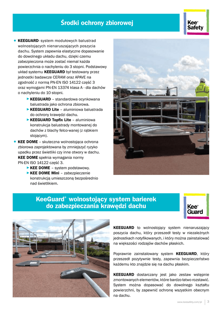 Środki ochrony zbiorowej • KEEGUARD- system modułowych balustrad wolnostojących nienaruszających poszycia dachu. System zapewnia elastyczne dopasowanie do dowolnego układu dachu, dzięki czemu zabezpieczona może zostać niemal każda powierzchnia o nachyleniu do 3 stopni. Podstawowy układ systemu KEEGUARD był testowany przez jednostki badawcze CERAM oraz APAVE na zgodność z normą PN-EN ISO 14122 część 3 oraz wymogami PN-EN 13374 klasa A - dla dachów o nachyleniu do 10 stopni. – standardowa ocynkowana balustrada jako ochrona zbiorowa. ► KEEGUARD Lite – aluminiowa balustrada do ochrony krawędzi dachu. ► KEEGUARD Topfix Lite – aluminiowa konstrukcja balustrady montowanej do dachów z blachy felco-wanej (z rąbkiem stojącym). ► KEEGUARD • KEE DOME – skuteczna wolnostojąca ochrona zbiorowa zaprojektowana by zmniejszyć ryzyko upadku przez świetliki czy inne otwory w dachu. KEE DOME spełnia wymagania normy PN-EN ISO 14122 część 3. ► KEE DOME – system podstawowy. ► KEE DOME Mini – zabezpieczenie konstrukcją umieszczoną bezpośrednio nad świetlikiem. KeeGuard® wolnostojący system barierek do zabezpieczania krawędzi dachu KEEGUARD to wolnostojący system nienaruszający poszycia dachu, który przeszedł testy w niezależnych jednostkach notyfikowanych, i który można zainstalować na większości rodzajów dachów płaskich. Poprawnie zainstalowany system KEEGUARD, który przeszedł pozytywnie testy, zapewnia bezpieczeństwo każdemu kto znajdzie się na dachu płaskim. KEEGUARD dostarczany jest jako zestaw wstępnie zmontowanych elementów, które bardzo łatwo rozstawić. System można dopasować do dowolnego kształtu powierzchni, by zapewnić ochronę wszystkim obecnym na dachu. www.keesafety.com/pl 3 Trwałość i Prostota • Wysoka odporność na korozję. Wszystkie złącza ocynkowane są zgodnie z PN-EN ISO 1461. • Złącza ze śrubami z utwardzonej stali oraz ochroną gwintu KEE KOAT. Bezpieczeństwo i Wszechstronność • System działa na sprawdzonej zasadzie przeciwwag. • System można montować na dachach bitumicznych, betonowych, asfaltowych oraz na membranie PCW. • Niewielka ilość elementów zapewnia łatwy montaż. • Dostępne dla większości dachów płaskich o dowolnym kształcie i spadku do 30 • Modułowe rozwiązanie umożliwia w razie potrzeby łatwą przebudowę systemu na miejscu. • Zintegrowany system do montażu bortnicy (deski krawężnikowej). • Istnieje możliwość dodawania lub demontowania fragmentów balustrady do użytku w kolejnym • Zestawy wyposażone w podkładki antypoślizgowe. miejscu. • Unikalne otwarte złącza umożliwiają bardzo szybki montaż poręczy. • Dostępne trzy typu słupków (strona 6). • Bez penetracji mambrany. • Bez spawania, gwintowania czy nitowania. • Możliwość malowania balustrady na dowolny kolor RAL. • System może być indywidualnie dopasowany do istniejącej na dachu infrastruktury, np: drabin, włazów. Spełniane normy Prawidłowo zaprojektowany i zainstalowany system KEEGUARD spełnia następujące normy bezpieczeństwa: • PN-EN ISO 14122 część 3 • PN-EN 13374 klasa A • HSG-33 ‘Bezpieczeństwo pracy przy robotach dachowych’ * • HSE INDG 284 ‘Praca na dachach’ * • BS 6399: Part 2 1995 ‘Obciążenie wiatrem’ * *Wymagania angielskie 4 www.keesafety.com/pl • Projektowana wytrzymałość: 300 N/m przyłożone poziomo wzdłóż górnej poręczy. • Poręcz i słupki wykonane z rur o średnicy zewnętrznej 48.3mm zgodnie z PN-EN 39. • Kolorowe nakładki zwiększające widoczność i minimalizujące ryzyko potknięcia. Typowa konfiguracja systemu KeeGuard® na dachu z możliwością oparcia* Wolnostojący system KEEGUARD do zabezpieczania krawędzi dachu, spełnia wymagania normy PN-EN ISO 14122-3 dzięki zastosowaniu przeciwwag ograniczających przesunięcie balustrady. Jeżeli budynek posiada ściankę attykową (o wysokości min. 150mm), która pomaga przejąć część obciążenia, można zastosować poniższą konfigurację. Na schemacie znajduje się przykład typowej balustrady z rozstawem słupków co 220 cm oraz wolnymi zakończeniami, dla których wymagane są po dwie przeciwwagi. Jeżeli ostatnie przęsło zostanie skrócone do 150 cm, można zastosować tylko jedną przeciwwagę na każdy wolny koniec. CB2P CB1P * Oparciem może być ścianka attykowa zwana także parapetem czy murkiem o wysokości nie mniejszej niż wymagana w przepisach. Typowa konfiguracja KeeGuard® bez podparcia* Typowy układ balustrady wolnostojącej z maksymalnym rozstawem słupków 2.0 metry oraz niezbędną ilością obciążników. CB1P CB4P www.keesafety.com/pl 5 Podstawowe złącza Kee Klamp® stosowane przy budowie systemów KeeGuard® 14-8 19-8 15-8 Złącze 14-8 stosowane jest do łączenia rur poręczy. Złącze 15-8, kolano 900, stosowane jest przy zakończeniach typu D oraz w narożnikach. 61-8 77-8 Złącze typ 19-8 służy Złącze 61-8 – kołnierz do budowy narożników do mocowania poręczy o dowolnym kącie lub do ściany. w celu niwelowania nachylenia. Złącze typ 77-8 to plastikowa zaślepka na rurę. Łatwe do przenoszenia przeciwwagi PCW Przeciwwagi systemu KEEGUARD wykonane z PCW pochodzącego z recyklingu zapewniają łatwy i szybki montaż dzięki czemu oszczędzamy czas i pieniądze. • • • • • • • Waga 13,5kg. Wymiary: 460 x 500 x 85mm. Uchwyty do wygodnego przenoszenia. Dostępne w kolorze czarnym. Inne kolory dostępne są za dopłatą. Powierzchnia antypoślizgowa. Opcjonalne nakładki zmniejszające ryzyko potknięcia. Wykonane w 100% w UE i z materiałów pochodzących z recyklingu. Dostępne słupki systemu KeeGuard® 314 Prosty KGU35 Wygięty KGUR 470 odstęp między poręczami 1100 do wierzchu poręczy R 1550 6 www.keesafety.com/pl 1133 do wierzchu poręczy Ukośny KGU35 11.0° 1100 do wierzchu poręczy Montaż systemu KeeGuard® Układ typowy Szczegół narożny B A 15-8 lub BC53-8