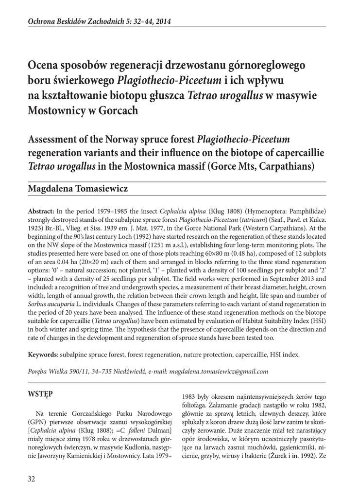 Ochrona Beskidów Zachodnich 5: 32–44, 2014 Ocena sposobów regeneracji drzewostanu górnoreglowego boru świerkowego Plagiothecio-Piceetum i ich wpływu na kształtowanie biotopu głuszca Tetrao urogallus w masywie Mostownicy w Gorcach Assessment of the Norway spruce forest Plagiothecio-Piceetum regeneration variants and their influence on the biotope of capercaillie Tetrao urogallus in the Mostownica massif (Gorce Mts, Carpathians) Magdalena Tomasiewicz Abstract: In the period 1979–1985 the insect Cephalcia alpina (Klug 1808) (Hymenoptera: Pamphilidae) strongly destroyed stands of the subalpine spruce forest Plagiothecio-Piceetum (tatricum) (Szaf., Pawł. et Kulcz. 1923) Br.-Bl., Vlieg. et Siss. 1939 em. J. Mat. 1977, in the Gorce National Park (Western Carpathians). At the beginning of the 90’s last century Loch (1992) have started research on the regeneration of these stands located on the NW slope of the Mostownica massif (1251 m a.s.l.), establishing four long-term monitoring plots. The studies presented here were based on one of those plots reaching 60×80 m (0.48 ha), composed of 12 subplots of an area 0.04 ha (20×20 m) each of them and arranged in blocks referring to the three stand regeneration options: ‘0’ – natural succession; not planted, ‘1’ – planted with a density of 100 seedlings per subplot and ‘2’ – planted with a density of 25 seedlings per subplot. The field works were performed in September 2013 and included: a recognition of tree and undergrowth species, a measurement of their breast diameter, height, crown width, length of annual growth, the relation between their crown length and height, life span and number of Sorbus aucuparia L. individuals. Changes of these parameters referring to each variant of stand regeneration in the period of 20 years have been analysed. The influence of these stand regeneration methods on the biotope suitable for capercaillie (Tetrao urogallus) have been estimated by evaluation of Habitat Suitability Index (HSI) in both winter and spring time. The hypothesis that the presence of capercaillie depends on the direction and rate of changes in the development and regeneration of spruce stands have been tested too. Keywords: subalpine spruce forest, forest regeneration, nature protection, capercaillie, HSI index. Poręba Wielka 590/11, 34–735 Niedźwiedź, e-mail: [email protected] WSTĘP Na terenie Gorczańskiego Parku Narodowego (GPN) pierwsze obserwacje zasnui wysokogórskiej [Cephalcia alpina (Klug 1808); =C. falleni Dalman] miały miejsce zimą 1978 roku w drzewostanach górnoreglowych świerczyn, w masywie Kudłonia, następnie Jaworzyny Kamienickiej i Mostownicy. Lata 1979– 32 1983 były okresem najintensywniejszych żerów tego foliofaga. Załamanie gradacji nastąpiło w roku 1982, głównie za sprawą letnich, ulewnych deszczy, które spłukały z koron drzew dużą ilość larw zanim te skończyły żerowanie. Duże znaczenie miał też narastający opór środowiska, w którym uczestniczyły pasożytujące na larwach zasnui muchówki, gąsieniczniki, nicienie, grzyby, wirusy i bakterie (Żurek i in. 1992). Ze Magdalena Tomasiewicz Ocena sposobów regeneracji drzewostanu górnoreglowego... względu na park narodowy, na powierzchni uszkodzonych drzewostanów nie stosowano ochrony środkami chemicznymi. W następnych latach osłabione przez zasnuję świerczyny zostały zaatakowane przez kornika drukarza i owady mu towarzyszące, którym dodatkowo sprzyjały pojawiające się co kilka lat huraganowe wiatry (np. w 1986 r.) i letnie susze. Wydawać by się mogło, że skutki rozpadu górnoreglowych świerczyn dotkną też związanego z tym środowiskiem głuszca i wyrażą się zmniejszeniem liczebności populacji tego chronionego gatunku. Działanie wszystkich wspomnianych wyżej czynników biotycznych i abiotycznych oraz zmiany postaci lasu doprowadziły jednak do aktywizacji jego gorczańskiej populacji. W silnie zwartym i ciemnym borze górnoreglowym po rozpadzie pojawiły się otwarte i nasłonecznione luki, na powierzchni których roślinność zielna stanowiąca pokarm głuszców (zwłaszcza borówka czarna) odnajdywała dogodne warunki do bujnego wzrostu. Ważnym czynnikiem była też duża ilość, spłukiwanych przez letnie ulewy, larw foliofagów będących łatwo dostępnym pokarmem białkowym dla młodych kuraków (Żurek i in. 2014). Pomimo, że już przed II wojną światową pojawiły się doniesienia o obecności głuszca w Gorcach (Żurek i in. 2014), pierwszą analizę jego stanu liczebnego na terenie GPN przedstawił dopiero Bonczar (1998) w Operacie ochrony fauny Planu Ochrony GPN. Stwierdzono wówczas 50 obserwacji bytowania tego gatunku. Kolejne badania, prowadzone w ramach projektu „Ochrona głuszca i cietrzewia oraz ich biotopów w Karpatach Zachodnich”, zainicjowano w GPN dopiero w 2005 roku, lecz te, realizowane w ramach kolejnych projektów i zadań własnych Parku mają już charakter ciągły. Ich celem jest poznanie stanu liczebnego populacji głuszca bytującej w Gorcach poprzez lokalizacje stwierdzeń osobników lub śladów ich obecności oraz monitoring genetyczny. W 2009 roku na terenie Gorców stwierdzono 41 genotypów (Rutkowski 2010, 2012), w okresie zimowym 2009/2010 – 54, natomiast w 2012 roku – 42 (Żurek, Armatys 2013). Obserwacje przeprowadzane przez pracowników GPN w ciągu ostatnich 8 lat pokazują, że głuszec najliczniej bytował w starodrzewiach silnie uszkodzonych przez zasnuję i korniki, z kępowymi fragmentami odnowienia (Żurek, Armatys 2013). Pomimo wielkiej liczby danych zebranych dotychczas w toku badań nad głuszcem na terenie Gorców, nie wykonywano dokładnych analiz właściwości śro- dowisk, w których najczęściej ptak bytuje. W roku 2002 prof. Ilse Stroch z Uniwersytetu we Freiburgu opracował HSI (Habitat Suitable Index), który pozwala dokonać takiej oceny, tj. waloryzacji biotopu kuraka. Metoda identyfikuje kluczowe elementy 