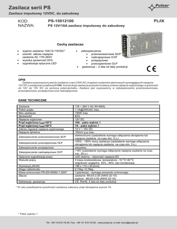 Pulsar Zasilacz serii PS Zasilacz impulsowy 12VDC, do zabudowy PS-15012100 KOD: NAZWA: PS 12V/10A zasilacz impulsowy do zabudowy PL/IX Cechy zasilacza: · · · · wyjście zasilania 10A/12÷15VDC* szeroki zakres napięcia zasilania AC 176÷264V wysoka sprawność 83% sygnalizacja optyczna LED zabezpieczenia: · przeciwzwarciowe SCP · nadnapięciowe OVP · przepięciowe · przeciążeniowe OLP · gwarancja – 2 lata od daty produkcji · OPIS Zasilacz przeznaczony jest do zasilania z sieci 230V AC urządzeń systemów alarmowych wymagających napięcia 12V DC o wydajności prądowej I=10A. Konstrukcja zasilacza pozwala na łatwą zmianę napięcia wyjściowego w granicach od 12V do 15V DC za pomocą potencjometru. Zasilacz jest wyposażony w zabezpieczenie przeciwzwarciowe, przeciążeniowe, przepięciowe oraz nadnapięciowe. DANE TECHNICZNE Zasilanie Pobór prądu Moc zasilacza Sprawność Napięcie wyjściowe Prąd wyjściowy tAMB<30°C Prąd wyjściowy tAMB=40°C Zakres regulacji napięcia wyjściowego Napięcie tętnienia Zabezpieczenie przeciwzwarciowe SCP Zabezpieczenie przeciążeniowe OLP Zabezpieczenie przepięciowe Zabezpieczenie nadnapięciowe OVP Optyczna sygnalizacja pracy Warunki pracy Wymiary(LxWxH) Waga netto/brutto Klasa ochronności PN-EN 60950-1:2007 Złącza Deklaracje, gwarancja 176 ÷ 264 V AC 50÷60Hz 1,1A@230VAC max. 150W max. 83% 12V DC 10A - patrz wykres 1 7A - patrz wykres 1 12 V ÷ 15V DC 100mV p-p max. elektroniczne (zadziałanie wymaga odłączenia obciążenia lub napięcia zasilania na czas min. 5 s.) 105% - 150% mocy zasilacza (zadziałanie wymaga odłączenia obciążenia lub napięcia zasilania na czas min. 5 s.) warystory >16V (zadziałanie wymaga odłączenia napięcia zasilania na czas min. 20 s.) LED zielona – obecność napięcia DC o o II klasa środowiskowa, temperatura: -10 C÷40 C wilgotność względna 20%...90%, bez kondensacji 199 x 110 x 50 [mm] 0,73kg / 0,78kg I (pierwsza) - wymaga przewodu ochronnego zasilanie: Φ0,63-2,50 (AWG 22-10) wyjścia : Φ0,63-2,50 (AWG 22-10) CE, RoHS, 2 lata od daty produkcji * W celu przedłużenia żywotności zasilacza zalecany prąd obciążenia wynosi 7A. * Patrz wykres 1 wyjście TAMPER : przewody 30cm Tel. +48 14-610-19-40, Fax. +48 14- 610-19-50, www.pulsar.pl, e-mail: [email protected] ® Pulsar Zasilacz serii PS Zasilacz impulsowy 12VDC, do zabudowy Charakterystyka temperaturowa Wykres 1. Dopuszczalny prąd wyjściowy zasilacza w zależności od temperatury otoczenia (obciążenie chwilowe). Wymiarowanie i mocowanie zasilacza PS-15012100 wyjście TAMPER : przewody 30cm Tel. +48 14-610-19-40, Fax. +48 14- 610-19-50, www.pulsar.pl, e-mail: [email protected] ®