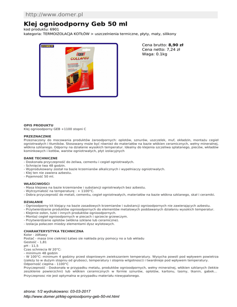 http://www.domer.pl Klej ognioodporny Geb 50 ml kod produktu: 6901 kategoria: TERMOIZOLACJA KOTŁÓW > uszczelnienia termiczne, płyty, maty, silikony Cena brutto: 8,90 zł Cena netto: 7,24 zł Waga: 0.1kg OPIS PRODUKTU Klej ognioodporny GEB +1100 stopni C PRZEZNACZNIE Przeznaczony do mocowania produktów żaroodpornych: oplotów, sznurów, uszczelek, muf, okładzin, montażu cegieł ogniotrwałych i tłumików. Stosowany może być również do materiałów na bazie włókien ceramicznych, wełny mineralnej, włókna szklanego. Odporny na działanie wysokich temperatur. Idealny do klejenia szczeliwa splatanego, pieców, wkładów kominkowych i kotłów, warstw ogniotrwałych, płyt izolacyjnych DANE TECHNICZNE - Doskonała przyczepność do żeliwa, cementu i cegieł ogniotrwałych. - Schnięcie twa 48 godzin. - Wyprodukowany został na bazie krzemianów alkalicznych i wypełniaczy ogniotrwałych. - Klej ten nie zawiera azbestu. - Pojemność 50 ml. WŁAŚCIWOŚCI - Masa klejowa na bazie krzemianów i substancji ogniotrwałych bez azbestu. - Wytrzymałość na temperaturę : + 1100°C. - Dobra przyczepność do metali, cementu, cegieł ogniotrwałych, materiałów na bazie włókna szklanego, skał i ceramiki. DZIAŁANIE - Ognioodporny kit klejący na bazie zasadowych krzemianów i substancji ognioodpornych nie zawierających azbestu. - Przytwierdzanie produktów ognioodpornych do elementów metalowych poddawanych działaniu wysokich temperatur. - Klejenie osłon, tulei i innych produktów ognioodpornych. - Montaż cegieł ognioodpornych w piecach i sprzecie grzewczym. - Przytwierdzanie oplotów (włókna szklane lub ceramiczne). - Izolacja połaczen miedzy elementami dysz wylotowych. CHARAKTERYSTYKA TECHNICZNA Kolor - żółtawy Postać - masa (nie cieknie) Łatwo sie nakłada przy pomocy no a lub wkładu Gestość - 1,81 pH - 11,5 Czas schniecia W 20°C: - minimum 48 godzin - W 100°C: minimum 4 godziny przed stopniowym zwiekszaniem temperatury. Wysycha powoli pod wpływem powietrza (zależy to w dużym stopniu od grubosci, temperatury i stopnia wilgotnosci) i twardnieje pod wpływem temperatury. Odporność cieplna - 1100°C Przyczepność - Doskonała w przypadku metalu, produktów ognioodpornych, wełny mineralnej, włókien szklanych (lekkie zeszklenie powierzchni) lub włókien ceramicznych w formie sznurów, oplotów, kartonu, tasmy, tkanin, gabek… Przyczepnosc nie jest optymalna w przypadku materiału niewypalonego. strona: 1/2 wydrukowano: 03-03-2017 http://www.domer.pl/klej-ognioodporny-geb-50-ml.html