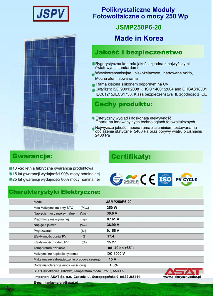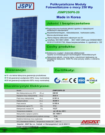 Polikrystaliczne Modu³y Fotowoltaiczne o mocy 250 Wp JSMP250P620 Made in Korea Jakoæ i bezpieczeñstwo Rygorystyczna kontrola jakoci zgodna z najwy¿szymi wiatowymi standardami Wysokotransmisyjne , nisko¿elazowe , hartowane szk³o, Mocna aluminiowa rama Rama klejona silikonem odpornym na UV Certyfikaty: ISO 9001:2008 、ISO 14001:2004 and OHSAS18001 IEC61215,IEC61730, Klasa bezpieczeñstwa II, zgodnoæ z CE Cechy produktu: Estetyczny wygl¹d i doskona³a efektywnoæ Oparta na innowacyjnych technologiach fotowoltaicznych Najwy¿sza jakoæ, mocna rama z aluminium testowana na obci¹¿enie statyczne 5400 Pa oraz porywy wiatru o cinieniu 2400 Pa Gwarancje: Certifikaty: 10 cio letnia fabryczna gwarancja produktowa 15 lat gwarancji wydajnoci 90% mocy nominalnej 25 lat gwarancji wydajnoci 80% mocy nominalnej Charakterystyki Elektryczne: Model: JSMP250P620 Moc Maksymalna przy STC (Pmax) 250 W Napiêcie mocy maksymalnej (Vmp) 30.6 V Pr¹d mocy maksymalnej (Imp) 8.161 A Napiêcie ja³owe (Voc) 36.90 V Pr¹d zwarcia (Isc) 9.155 A Efektywnoæ ogniw PV (%) 17.4 Efektywnoæ modu³u PV (%) 15.27 Temperatura dzia³ania od 40 do +85 Maksymalne napiêcie systemu DC 1000 V Maksymalne zabezpieczenie pr¹dowe szeregu 15 A Dodatnia tolerancja mocy wyjciowej + 3% STC:Owietlenie1000W/㎡, Temperatura modu³u 25℃, AM=1.5 Importer: ASAT Sp. o.o. Czelad ul. Staropogoñska 9 tel.32 2654111 www.elektrycznysolar.pl Email: [email protected] Rysunki Techniczne: 2 Ⅱ Otwory odwodnienia Model Number (Pmax) Rated Maximum Power Output Tolerance (Imp) Current at Pmax (Vmp) V oltage at Pmax (Isc) Short Circ ui t Curre nt (Voc) OpenCircuit Voltage Nominal Operating Cell Temp Weight Domension Maximum System Voltage Maxmum series Fuse Rating Cell Technology Applicati on Class A All technical data at standard test co ndition AM=1.5 2 E=1000W/m Tc=25 Ⅰ 8-9*14 Ⅰ Otwory monta¿owe BACK VIEW 2 4 Otwory instalacyjne uziemienia Ⅱ A A Sekcja A-A Charakterystyki Mechaniczne Krzywe Pr¹dowoNapiêciowe Pr d-Napi cie i Moc-Napi cie krzywa modu u o mocy 240 Wp 9 1000W/㎡ 250 800W/㎡ 200 600W/㎡ 150 Polikrystaliczna 156*156 mm Liczba fotoogniw w module 60 (6×10) Wymiary 1650 mm*992 mm*40 mm Ciê¿ar 18 kg Szyba przednia 3.2 mm szk³o hatrowane Rama Anodyzowane aluminium Puszka przy³¹czeniowa PVYH0906 7 Pr d (A) Budowa fotoogniwa 6 5 4 400W/㎡ Moc (W) 8 100 3 200W/㎡ 2 50 1 0 0 0 5 10 15 20 25 30 35 40 Napi cie (V) Wspó³czynniki Temperaturowe Z³¹cza elektryczne Wtyk i gniazdo kompatybilne z MC4 Kable wyjciowe PV 4.0 mm², 0.9 m Informacja o wprowadzaj¹cym do obrotu: ASAT Sp. z o.o. ul. Staropogoñska 9 41253 Czelad tel. 322654111; [email protected] Temperatura normalnej pracy ogniwa (NOCT) 47℃+/2℃ Wspó³czynnik Temperaturowy Mocy Max. Pmax 0.47%/K Wspó³czynnik Temperaturowy VOC 0.351%/K Wspó³czynnik Temperaturowy ISC +0.035%/K Modu³y fotowoltaiczne firmy JSPV spe³niaj¹ wszelkie wymagania P.P. NFOiGW Prosument Wiêcej informacji oraz instrukcja monta¿u i u¿ytkowania na stronie importera: www.elektrycznysolar.pl