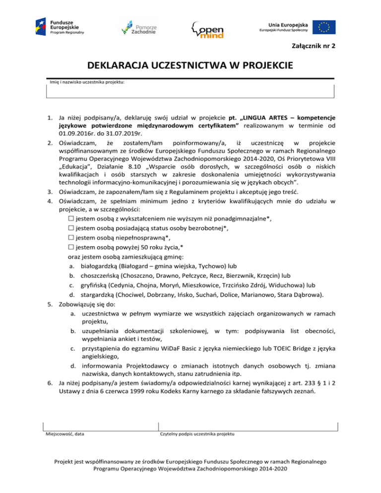 Załącznik nr 2 DEKLARACJA UCZESTNICTWA W PROJEKCIE Imię i nazwisko uczestnika projektu: 1. Ja niżej podpisany/a, deklaruję swój udział w projekcie pt. „LINGUA ARTES – kompetencje językowe potwierdzone międzynarodowym certyfikatem” realizowanym w terminie od 01.09.2016r. do 31.07.2019r. 2. Oświadczam, że zostałem/łam poinformowany/a, iż uczestniczę w projekcie współfinansowanym ze środków Europejskiego Funduszu Społecznego w ramach Regionalnego Programu Operacyjnego Województwa Zachodniopomorskiego 2014-2020, Oś Priorytetowa VIII „Edukacja”, Działanie 8.10 „Wsparcie osób dorosłych, w szczególności osób o niskich kwalifikacjach i osób starszych w zakresie doskonalenia umiejętności wykorzystywania technologii informacyjno-komunikacyjnej i porozumiewania się w językach obcych”. 3. Oświadczam, że zapoznałem/łam się z Regulaminem projektu i akceptuję jego treść. 4. Oświadczam, że spełniam minimum jedno z kryteriów kwalifikujących mnie do udziału w projekcie, a w szczególności: jestem osobą z wykształceniem nie wyższym niż ponadgimnazjalne*, jestem osobą posiadającą status osoby bezrobotnej*, jestem osobą niepełnosprawną*, jestem osobą powyżej 50 roku życia,* oraz jestem osobą zamieszkującą gminę: a. białogardzką (Białogard – gmina wiejska, Tychowo) lub b. choszczeńską (Choszczno, Drawno, Pełczyce, Recz, Bierzwnik, Krzęcin) lub c. gryfińską (Cedynia, Chojna, Moryń, Mieszkowice, Trzcińsko Zdrój, Widuchowa) lub d. stargardzką (Chociwel, Dobrzany, Ińsko, Suchań, Dolice, Marianowo, Stara Dąbrowa). 5. Zobowiązuję się do: a. uczestnictwa w pełnym wymiarze we wszystkich zajęciach organizowanych w ramach projektu, b. uzupełniania dokumentacji szkoleniowej, w tym: podpisywania list obecności, wypełniania ankiet i testów, c. przystąpienia do egzaminu WiDaF Basic z języka niemieckiego lub TOEIC Bridge z języka angielskiego, d. informowania Projektodawcy o zmianach istotnych danych osobowych tj. zmiana nazwiska, danych kontaktowych, stanu zatrudnienia itp. 6. Ja niżej podpisany/a jestem świadomy/a odpowiedzialności karnej wynikającej z art. 233 § 1 i 2 Ustawy z dnia 6 czerwca 1999 roku Kodeks Karny karnego za składanie fałszywych zeznań. Miejscowość, data Czytelny podpis uczestnika projektu Projekt jest współfinansowany ze środków Europejskiego Funduszu Społecznego w ramach Regionalnego Programu Operacyjnego Województwa Zachodniopomorskiego 2014-2020