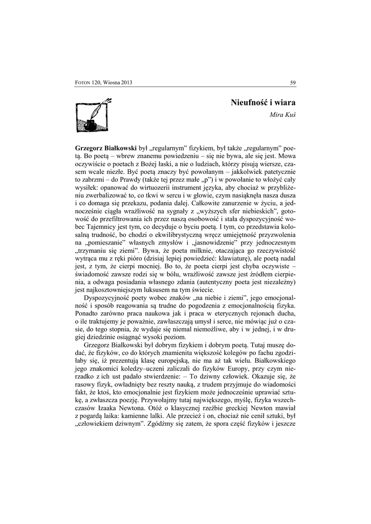 FOTON 120, Wiosna 2013 59 Nieufność i wiara Mira Kuś Grzegorz Białkowski był „regularnym” fizykiem, był także „regularnym” poetą. Bo poetą – wbrew znanemu powiedzeniu – się nie bywa, ale się jest. Mowa oczywiście o poetach z Bożej łaski, a nie o ludziach, którzy pisują wiersze, czasem wcale niezłe. Być poetą znaczy być powołanym – jakkolwiek patetycznie to zabrzmi – do Prawdy (także tej przez małe „p”) i w powołanie to włożyć cały wysiłek: opanować do wirtuozerii instrument języka, aby chociaż w przybliżeniu zwerbalizować to, co tkwi w sercu i w głowie, czym nasiąknęła nasza dusza i co domaga się przekazu, podania dalej. Całkowite zanurzenie w życiu, a jednocześnie ciągła wrażliwość na sygnały z „wyższych sfer niebieskich”, gotowość do przefiltrowania ich przez naszą osobowość i stała dyspozycyjność wobec Tajemnicy jest tym, co decyduje o byciu poetą. I tym, co przedstawia kolosalną trudność, bo chodzi o ekwilibrystyczną wręcz umiejętność przyzwolenia na „pomieszanie” własnych zmysłów i „jasnowidzenie” przy jednoczesnym „trzymaniu się ziemi”. Bywa, że poeta milknie, otaczająca go rzeczywistość wytrąca mu z ręki pióro (dzisiaj lepiej powiedzieć: klawiaturę), ale poetą nadal jest, z tym, że cierpi mocniej. Bo to, że poeta cierpi jest chyba oczywiste – świadomość zawsze rodzi się w bólu, wrażliwość zawsze jest źródłem cierpienia, a odwaga posiadania własnego zdania (autentyczny poeta jest niezależny) jest najkosztowniejszym luksusem na tym świecie. Dyspozycyjność poety wobec znaków „na niebie i ziemi”, jego emocjonalność i sposób reagowania są trudne do pogodzenia z emocjonalnością fizyka. Ponadto zarówno praca naukowa jak i praca w eterycznych rejonach ducha, o ile traktujemy je poważnie, zawłaszczają umysł i serce, nie mówiąc już o czasie, do tego stopnia, że wydaje się niemal niemożliwe, aby i w jednej, i w drugiej dziedzinie osiągnąć wysoki poziom. Grzegorz Białkowski był dobrym fizykiem i dobrym poetą. Tutaj muszę dodać, że fizyków, co do których znamienita większość kolegów po fachu zgodziłaby się, iż prezentują klasę europejską, nie ma aż tak wielu. Białkowskiego jego znakomici koledzy–uczeni zaliczali do fizyków Europy, przy czym nierzadko z ich ust padało stwierdzenie: – To dziwny człowiek. Okazuje się, że rasowy fizyk, owładnięty bez reszty nauką, z trudem przyjmuje do wiadomości fakt, że ktoś, kto emocjonalnie jest fizykiem może jednocześnie uprawiać sztukę, a zwłaszcza poezję. Przywołajmy tutaj największego, myślę, fizyka wszechczasów Izaaka Newtona. Otóż o klasycznej rzeźbie greckiej Newton mawiał z pogardą laika: kamienne lalki. Ale przecież i on, chociaż nie cenił sztuki, był „człowiekiem dziwnym”. Zgódźmy się zatem, że spora część fizyków i jeszcze 60 FOTON 120, Wiosna 2013 większy odsetek poetów to ludzie „dziwni”, jakkolwiek zarówno ci dziwni, jak i ci normalni (?) zapewne nie zaprzeczą, że chociaż reżim pracy jest w obu dziedzinach odmienny, to i fizyka, i poezja jest sposobem poznania świata. Ponadto każdy dobry fizyk po przekroczeniu pewnej granicy zaawansowania bezwzględnie uruchamia wyobraźnię i swoistą intuicję ukształtowaną ścisłym myśleniem. Że wyobraźnia i intuicja to podstawowe walory poety, mówić nie trzeba, z tą jednak uwagą, że kształcenie tych zalet u poety przebiega inaczej; ale już skonstruowanie wiersza, jako spójnej całości, wymaga jeśli nie zawsze ścisłego myślenia, to jednak w końcowej fazie trzeźwego osądu. Wróćmy do zdania: [Jak] …ktoś, kto emocjonalnie jest fizykiem, może jednocześnie uprawiać sztukę, a zwłaszcza poezję? Dlaczego „zwłaszcza poezję”? Otóż cechą dobrej poezji jest m.in. to, że jej słowa niosą ze sobą wiele znaczeń i że w ostateczności jej sensy i emocje są filtrowane, czasem wzbogacane, przez umysł i uczuciowość czytelnika. Dobry artykuł naukowy natomiast czy dobry wykład wygłoszony przez fizyka charakteryzuje się m.in. tym, że wypowiedzi i użyte słowa są jednoznaczne. Czasem do tego stopnia, że niektórzy fizycy zawsze wiedzą, co w uprawianej przez nich dziedzinie nauki jest piękne, a co nie… Z tej sprzeczności interesów poety i fizyka, a leżącej w sposobie porozumiewania się z czytelnikiem czy słuchaczem powstała, przypuszczam, siła motoryczna poezji Grzegorza Białkowskiego. W wierszu XVI z tomu Przemienienie znajduję takie oto wyznanie: „jest pożądanie/ oglądu słów”. I kiedy czytam Białkowskiego poetę przez cały czas, gdzieś na granicy świadomości i nieświadomości, mam obraz mężczyzny siedzącego przy biurku i oglądającego pod mikroskopem… słowo. Zmieniającego przy tym długość fali świetlnej, rząd powiększenia; oglądającego słowo na przemian: to wypreparowane z języka, to znowu w próbce języka. Z kontrastem i bez kontrastu. „Zanim się spostrzegłem nastąpiła noc// rzekłem słowo/i/ stała się ciemność// nie rozumiem go: jest/ międzybytem/ jest rozbijaniem namiotu/ między mną/ a gwiazdami atomów/...” Poeta patrzy w przestrzeń, orientuje się, że, mówiąc umownie, za jego plecami stała się noc. Ale dla jego umysłu staje się ona dopiero wtedy, gdy ją nazwie. I tu następuje momentalna zmiana perspektywy: z gwiezdnej na mikrokosmiczną, skok z Kosmosu świata do atomu słowa. Istnieje bowiem „pożądanie” dokładnego przyjrzenia się stwórczemu słowu. Te skoki perspektywy są dla poezji Białkowskiego charakterystyczne – jest to m.in. chęć uchwycenia słowa na „gorącym stwarzaniu się”, słowa, które poeta nazywa „międzybytem”. I „międzybytu”, który poeta chce zrozumieć, przydając mu słowo. Stąd z nagłych zmian perspektywy podczas lektury tej poezji niejednokrotnie bierze się uczucie, że oto znajdujemy się w środku ruchu. W