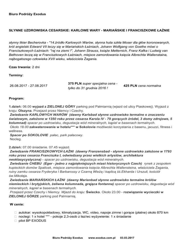 Biuro Podróży Exodus SŁYNNE UZDROWISKA CESARSKIE: KARLOWE WARY - MARIAŃSKIE I FRANCISZKOWE ŁAŹNIE słynny likier Becherovka - "14.źródło Karlowych Warów, słynna huta szkła Moser dla głów koronowanych, król angielski Edward VII leczy się w Mariańskich Łaźniach, Johann Wolfgang von Goethe mówi o Franciszkowych Łaźniach: "raj na ziemi !", Johann Strauss, książe Metternich, Franz Kafka i Ludwig van Bethoven leczą się w Franciszkowych Łaźniach, miejsce zamordowania księcia Albrechta Wallenstaina, najbogatszego człowieka XVII wieku, właściciela Żagania. Czas trwania: 2 dni Terminy: 26.08.2017 - 27.08.2017 375 PLN super specjalna cena tylko do 31 grudnia 2016 ! 425 PLN cena normalna Program: 1.dzień: 06.00 wyjazd z ZIELONEJ GÓRY parking pod Palmiarnią (wjazd od ulicy Piaskowej). Wyjazd z kraju: Olszyna. Przejazd przez Niemcy i Czechy. Zwiedzanie KARLOWYCH WARÓW (dawny Karlsbad słynne uzdrowisko termalne o znaczeniu światowym, założone w 1350 roku przez cesarza Karola IV - 79 gorących źródeł, 3 domy zdrojowe, 5 kolumnad) spacer po uzdrowisku, degustacja wód mineralnych, kąpiel w basenach termalnych. Około 18.00 zakwaterowanie w hotelu*** w Sokolovie możliwość korzystania z basenu, jacuzzi, fitness i wellness. Spacer po SOKOLOVIE pałac, park pałacowy. Nocleg. 2.dzień: 07.00 śniadanie. 07.45 wyjazd. Zwiedzanie FRANCISZKOWYCH ŁAŹNI (dawny Franzensbad - słynne uzdrowisko założone w 1793 roku przez cesarza Franciszka I, odwiedzany przez wielkich artystów, architektura neoklasycystyczna) - spacer po uzdrowisku, degustacja wód mineralnych. Zwiedzanie CHEBU (Eger - jedno z najpiękniejszych miast historycznych Czech) rynek z zespołem kupieckich domów Spalicek, miejsce zamordowania księcia Albrechta Wallensteina, właściciela Żagania, ruiny zamku cesarza Fryderyka I Barbarossy z Czarną Wieżą i kaplicą śś.Ekharda i Urszuli, kościół św.Mikołaja. Zwiedzanie MARIAŃSKICH ŁAŹNI (dawny Marienbad słynne uzdrowisko termalne królów niemieckich i brytyjskich, żeliwna kolumnada, grająca fontanna) spacer po uzdrowisku, degustacja wód mineralnych, kąpiel w basenach termalnych. Przejazd przez Czechy i Niemcy. Wjazd do kraju: Świecko. Około 23.00 - rozwiązanie wycieczki w ZIELONEJ GÓRZE parking pod Palmiarnią. W cenie: autokar: wysokopokładowy, klimatyzacja, WC, video, napoje zimne i gorące (płatne) około 870 km noclegi: 1 x hotel *** - pokoje 2,3-osob z łaz/wc wyżywienie: 1 x śniadanie pilot BP EXODUS Biuro Podróży Exodus www.exodus.com.pl 03.03.2017 ubezpieczenie NW, KL, bagaż podatek VAT Dodatkowe opłaty: wejściówki do obiektów turystycznych - około obiadokolacja około Uwaga: Uwaga: przy długich przejazdach autokar zatrzymuje się na 15-minutowe postoje każdorazowo po około 4-godzinnej jeździe. Nie bierzemy odpowiedzialności za punkty programu niezrealizowane z przyczyn od nas niezależnych. Biuro Podróży Exodus www.exodus.com.pl 03.03.2017