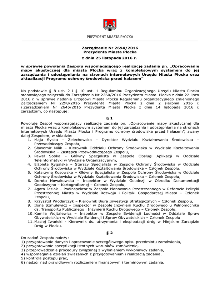 Zarządzenie Nr 2694/2016 Prezydenta Miasta Płocka z dnia 25 listopada 2016 r. w sprawie powołania Zespołu wspomagającego realizację zadania pn. „Opracowanie mapy akustycznej dla miasta Płocka wraz z kompleksowym systemem do jej zarządzania i udostępniania na stronach internetowych Urzędu Miasta Płocka oraz aktualizacji Programu ochrony środowiska przed hałasem” Na podstawie § 8 ust. 2 i § 10 ust. 1 Regulaminu Organizacyjnego Urzędu Miasta Płocka stanowiącego załącznik do Zarządzenia Nr 2260/2016 Prezydenta Miasta Płocka z dnia 22 lipca 2016 r. w sprawie nadania Urzędowi Miasta Płocka Regulaminu organizacyjnego zmienionego Zarządzeniem Nr 2298/2016 Prezydenta Miasta Płocka z dnia 2 sierpnia 2016 r. i Zarządzeniem Nr 2645/2016 Prezydenta Miasta Płocka z dnia 14 listopada 2016 r. zarządzam, co następuje: §1 Powołuję Zespół wspomagający realizację zadania pn. „Opracowanie mapy akustycznej dla miasta Płocka wraz z kompleksowym systemem do jej zarządzania i udostępniania na stronach internetowych Urzędu Miasta Płocka i Programu ochrony środowiska przed hałasem”, zwany dalej Zespołem, w składzie: 1. Maja Syska – Żelechowska – Dyrektor Wydziału Kształtowania Środowiska – Przewodniczący Zespołu, 2. Sławomir Milik – Kierownik Oddziału Ochrony Środowiska w Wydziale Kształtowania Środowiska – Zastępca Przewodniczącego Zespołu, 3. Paweł Sobka – Główny Specjalista w Zespole Obsługi Aplikacji w Oddziale Teleinformatyki w Wydziale Organizacyjnym, 4. Elżbieta Rygalska – Starszy Specjalista w Zespole Ochrony Środowiska w Oddziale Ochrony Środowiska w Wydziale Kształtowania Środowiska – Członek Zespołu, 5. Katarzyna Kosowska – Główny Specjalista w Zespole Ochrony Środowiska w Oddziale Ochrony Środowiska w Wydziale Kształtowania Środowiska – Członek Zespołu, 6. Dorota Nowakowska – Inspektor w Wydziale Geodezji w Ośrodku Dokumentacji Geodezyjno – Kartograficznej – Członek Zespołu, 7. Agata Jeziak – Podinspektor w Zespole Planowania Przestrzennego w Referacie Polityki Przestrzennej Miasta w Wydziale Rozwoju i Polityki Gospodarczej Miasta – Członek Zespołu, 8. Krzysztof Włodarczyk – Kierownik Biura Inwestycji Strategicznych – Członek Zespołu, 9. Ilona Szmulewicz – Inspektor w Zespole Inżynierii Ruchu Drogowego u Pełnomocnika ds. Transportu Publicznego i Inżynierii Ruchu Drogowego – Członek Zespołu, 10. Kamila Wojtalewicz – Inspektor w Zespole Ewidencji Ludności w Oddziale Spraw Obywatelskich w Wydziale Ewidencji i Spraw Obywatelskich – Członek Zespołu 11. Maciej Iwański - Kierownik ds. utrzymania i eksploatacji dróg w Miejskim Zarządzie Dróg w Płocku. §2 Do zadań Zespołu należy: 1) przygotowanie danych i opracowanie szczegółowego opisu przedmiotu zamówienia, 2) przygotowanie specyfikacji istotnych warunków zamówienia, 3) przeprowadzenie procedury związanej z wyłonieniem wykonawcy zadania, 4) wspomaganie działań związanych z przygotowaniem i realizacją zadania, 5) kontrola postępu prac, 6) nadzór nad prawidłowym rozliczeniem finansowym i terminowym zadania, 7) przeciwdziałanie nieprawidłowościom podczas realizacji zadania, 8) opiniowanie poszczególnych etapów inwestycji, 9) odbiór końcowy opracowania wraz z rozliczeniem finansowym, 10)przygotowanie projektu uchwały do zatwierdzenia programu przez Radę Miasta Płocka. §3 Zasady i tryb działania Zespołu określa się w Regulaminie Pracy Zespołu, stanowiącym załącznik do niniejszego Zarządzenia. §4 Zarządzenie wchodzi w życie z dniem podpisania i obowiązuje do dnia podjęcia przez Radę Miasta Płocka uchwały w sprawie aktualizacji Programu ochrony środowiska przed hałasem dla miasta Płocka. Prezydent Miasta Płocka /-/ Andrzej Nowakowski Załącznik do Zarządzenia Nr 2694/2016 Prezydenta Miasta Płocka z dnia 25 listopada 2016r. Regulamin Pracy Zespołu wspomagającego realizację zadania pn. „Opracowanie mapy akustycznej dla miasta Płocka wraz z kompleksowym systemem do jej zarządzania i udostępniania na stronach internetowych Urzędu Miasta Płocka oraz programu ochrony środowiska przed hałasem”. §1 1. Pracami Zespołu kieruje Przewodniczący Zespołu. 2. Zwoływanie posiedzeń Zespołu odbywa się w formie pisemnej, za pośrednictwem poczty elektronicznej, najpóźniej 3 dni przed terminem posiedzenia. 3. Posiedzenia Zespołu odbywają się w miarę potrzeb. §2 Przewodniczący organizuje pracę Zespołu, jest odpowiedzialny za jego działania oraz prowadzi posiedzenia Zespołu. W sytuacjach szczególnych Przewodniczący może upoważnić do przewodniczenia posiedzeniu swojego Zastępcę lub innego Członka Zespołu. §3 W zależności od potrzeb, na zaproszenie Przewodniczącego Zespołu, w pracach Zespołu uczestniczą również inni pracownicy Urzędu Miasta Płocka, jednostek organizacyjnych Gminy Miasto Płock oraz osoby spoza struktur Urzędu Miasta Płocka. §4 Z posiedzenia Zespołu sporządza się protokół, który podpisują, w sposób umożliwiający identyfikację, Członkowie Zespołu biorący udział w posiedzeniu. §5 Na posiedzeniach Zespołu omawiany jest aktualny stan realizacji zadania, postępy w pracy, problemy oraz nieprawidłowości oraz uzgadniany jest zakres i sposób dalszego działania. §6 Obsługą administracyjną oraz przechowywaniem dokumentacji Zespołu zajmuje się Wydział Kształtowania Środowiska Urzędu Miasta Płocka.