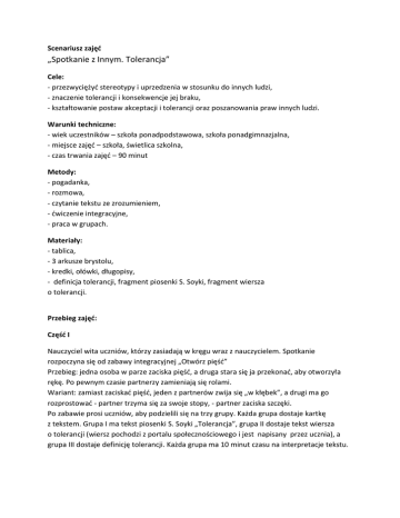 Scenariusz zajęć „Spotkanie z Innym. Tolerancja” Cele: - przezwyciężyć stereotypy i uprzedzenia w stosunku do innych ludzi, - znaczenie tolerancji i konsekwencje jej braku, - kształtowanie postaw akceptacji i tolerancji oraz poszanowania praw innych ludzi. Warunki techniczne: - wiek uczestników – szkoła ponadpodstawowa, szkoła ponadgimnazjalna, - miejsce zajęć – szkoła, świetlica szkolna, - czas trwania zajęć – 90 minut Metody: - pogadanka, - rozmowa, - czytanie tekstu ze zrozumieniem, - ćwiczenie integracyjne, - praca w grupach. Materiały: - tablica, - 3 arkusze brystolu, - kredki, ołówki, długopisy, - definicja tolerancji, fragment piosenki S. Soyki, fragment wiersza o tolerancji. Przebieg zajęć: Część I Nauczyciel wita uczniów, którzy zasiadają w kręgu wraz z nauczycielem. Spotkanie rozpoczyna się od zabawy integracyjnej „Otwórz pięść” Przebieg: jedna osoba w parze zaciska pięść, a druga stara się ja przekonać, aby otworzyła rękę. Po pewnym czasie partnerzy zamieniają się rolami. Wariant: zamiast zaciskać pięść, jeden z partnerów zwija się „w kłębek”, a drugi ma go rozprostować - partner trzyma się za swoje stopy, - partner zaciska szczęki. Po zabawie prosi uczniów, aby podzielili się na trzy grupy. Każda grupa dostaje kartkę z tekstem. Grupa I ma tekst piosenki S. Soyki „Tolerancja”, grupa II dostaje tekst wiersza o tolerancji (wiersz pochodzi z portalu społecznościowego i jest napisany przez ucznia), a grupa III dostaje definicję tolerancji. Każda grupa ma 10 minut czasu na interpretacje tekstu. Po upływie 10 minut przedstawiciel grupy relacjonuje treść przeczytanego tekstu. Nauczyciel wysłuchuje uczniów, następnie prosi o podanie definicji dotyczącej tolerancji. Definicja tolerancji: „Poszanowanie czyichś poglądów, wierzeń, upodobań, czyjegoś postępowania różniących się od własnych. Tolerancja polityczna, religijna. Tolerancja wobec nowych prądów, kierunków. Okazywać daleko idącą tolerancję dla dysydentów, innowierców, wobec dysydentów, innowierców a względem dysydentów, innowierców.” Nauczyciel pyta: - jakie są źródła pojęcia tolerancja? (Wielka Rewolucja Francuska, Oświecenie i Powszechna Deklaracja Praw Człowieka). Nauczyciel na tablicy rysuje diagram, mapę myślową związaną z pojęciem tolerancja, diagram tworzy się w toku dyskusji z uczniami, nauczyciel zadaje pytania naprowadzające: - Co nas drażni w drugim człowieku ( w koledze z ławki), przeszkadza? - Dlaczego na co dzień trudno nam zaakceptować drugiego człowieka, wystarczy, że ma rude włosy (pada odpowiedź, bo rudy to nie kolor a charakter) czyli pojawiają się stereotypy, które powtarzamy, a nie zastanawiamy się nad sensem. - Czy tolerancja jest nam zawsze dana, czy raczej jest związana z konkretnym przykładem? - Jakie są skutki tolerancji a jakie są skutki braku tolerancji? - Czy własne przeżycia mogą zmieniać nasz stosunek do drugiego człowieka? - Czy tolerancja jest pojęciem pozytywnym? - Jakie są granice tolerancji? - Które grupy społeczne są narażone na brak akceptacji i nietolerancji? TOLERANCJA WOLNOŚĆ, RÓWNOŚĆ , BRATERSTWO, POSZANOWANIE POGLĄDÓW, WIERZEŃ, UPODOBAŃ, POSTĘPOWANIA, WYROZUMIAŁOŚĆ, BRAK AGRESJI, EMPATIA, WSPÓŁCZUCIE, ETYKA. NIETOLERANCJA AGRESJA, BRAK ZROZUMIENIA, BRAK KOMUNIKACJI, WROGOŚĆ, PRZEKONANIE O WŁASNEJ WYŻSZOŚCI, LĘK O WŁASNE WARTOŚCI, OBCOŚĆ, POCZUCIE BYCIA ZAGROŻONYM. Pojęcia wpisywane do diagramu są zależne od odpowiedzi uczniów. Część II Nauczyciel jeszcze raz wraca do definicji i prosi uczniów o sporządzenie dekalogu tolerancji. Przykładowe punkty dekalogu: • Respektowanie cudzych praw i cudzej własności, • Uznanie i akceptacja różnic indywidualnych, • Umiejętność słuchania, komunikowania się i rozumienia innych, • Docenianie rozmaitości kultur, • Otwarcie na cudze myśli i filozofię, • Ciekawość i nieodrzucanie nieznanego, • Uznanie, że nikt nie ma monopolu na prawdę. Część III W Deklaracji UNESCO państwa członkowskie podkreślają nie tylko konieczność walki z nietolerancją i rasizmem, lecz również znaczenie różnorodności kulturowej. Nauczyciel nawiązuje do dalszej rozmowy: jeśli państwa dążą do współpracy międzynarodowej to znaczy między innymi, że należy akceptować inność, odmienne kultury, wyznania, a także wspierać ludzi niepełnosprawnych fizycznie i intelektualnie. Nauczyciel zadaje pytanie: - Czy zgadzasz się, aby twoim sąsiadem był Rom? Kto się zgadza, stanie po prawej stronie, a kto myśli inaczej stanie po lewej stronie. Utworzyły się 3 grupy. Jedni są w grupie tolerancyjnych, drudzy w grupie, w której brak akceptacji dla Roma jako sąsiada, i paru uczniów pozostało w środku (nie są pewni swojej tolerancji). Grupy są poproszone o wyjaśnienie swoich decyzji. Są ogromne emocje, jest oburzenie, osoby z grupy tolerancyjnej nie akceptują pozostałych. Nauczyciel uświadamia uczniom, jak łatwo jest budować konflikt kiedy pojawia się jakakolwiek różnica. Czy to, że się różnimy jest złe? Jak radzić sobie z różnicami na co dzień. Podstawą wszystkiego jest komunikacja, rozmowa, poznanie innej kultury, oswojenie z obcością. Nauczyciel zadaje kolejne pytania: - Jak zareagujesz, kiedy widzisz osobę leżącą na chodniku? Myślisz: jest pijany! A to znaczy, że jest gorszy od nas, mamy go zostawić? Może zemdlał! Nigdy się nie dowiemy, jeśli nie pomożemy. - A co myślisz o osobach niepełnosprawnych? Czy oni jak my nie pragną miłości, przyjaźni? Po tych pytaniach niektórzy uczniowie zmieniają swoje grupy, nietolerancyjni przechodzą do grupy tolerancyjnych, a ci którzy uważali się za tolerancyjnych muszą popracować nad swoim charakterem, patrzeniem na drugich. Każda grupa ma polecenie. Musi narysować TOLERANCJĘ Grupa I - uczę się tolerancji wobec osób uzależnionych. Grupa II – u