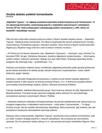 Groźne dziecko polskich komandosów 2013-04-26 „Afgańskie Tygrysy” – to najlepiej wyszkolona jednostka antyterrorystyczna pod Hindukuszem. To oni zatrzymują terrorystów, przechwytują ładunki z materiałami wybuchowymi i narkotykami, chronią VIP-ów. Swój profesjonalizm zawdzięczają polskim komandosom z JWK, którzy ich wyszkolili i wszystkiego nauczyli. Kilka dni temu jednostka antyterrorystyczna policji z Ghazni dostała oficjalną nazwę – „Afgańskie Tygrysy”. Nadali ją polscy komandosi. Oni także przygotowali dla swoich podopiecznych oznakę rozpoznawczą. Przedstawia tygrysa z otwartym pyskiem, który trzyma w łapach symbol jednostki. Afgańczycy oficjalnie mogą nosić ten znak na lewym ramieniu munduru. – W Polsce już od dawna nazywamy was „Afgańskimi Tygrysami” – mówił gen. bryg. Andrzej Tuz, dowódca PKW, do gen. Zahidema Zarawara, dowódcy afgańskich antyterrorystów. – Informujemy polskie media o waszych sukcesach, dlatego zna was cała Polska. Gratuluję wspaniałej służby i osiągnięć dla własnego kraju – podkreślił gen. Tuz. Podczas uroczystości nadania nazwy i emblematu afgańskiej jednostce polski generał podarował jej też bardzo potrzebny do służby sprzęt: plecaki medyczne z wyposażeniem, nosze, latarki taktyczne, gogle i laptopy. Żołnierze z Jednostki Wojskowej Komandosów z Lublińca od lat szkolili oddziały afgańskich antyterrorystów w kilku bazach na terenie prowincji Ghazni, m.in. w Warriorze (została oddana pod kuratelę amerykańskiego wojska), Ghazni, Sharanie (prowincja Paktika). Trenują niewielkie, zaledwie kilkuosobowe grupy. Dziś można je zaliczyć do elity Afgańskich Sił Bezpieczeństwa. Formacje te jako pierwsze osiągnęły status zdolnych do samodzielnego prowadzenia operacji w prowincjach Ghazni i Paktika. – Szkolenie lokalnych oddziałów sił bezpieczeństwa nie jest tak spektakularne jak zatrzymania czy przejęcia magazynów z materiałami wybuchowymi – mówi jeden z komandosów. – To długi i żmudny proces, ale ten wysiłek rekompensuje satysfakcja, która przychodzi, gdy widzimy, jak nasi podopieczni skutecznie samodzielnie wykonują zadania. Operacji, które przeprowadziły „Afgańskie Tygrysy” wyszkolone przez polskich komandosów, było już wiele. Czasem działają wspólnie z naszymi specjalsami, ale prowadzą też samodzielne operacje. Do ich sukcesów należy zaliczyć m.in. zatrzymanie terrorysty Asadullaha Higrana, który Autor: MKS Strona: 1 znajdował się na liście priorytetowych celów ISAF. Wsławili się też likwidacją ogromnego składu materiałów wybuchowych, który miał posłużyć do produkcji IED (Improvised Explosive Device). Autor: MKS Strona: 2