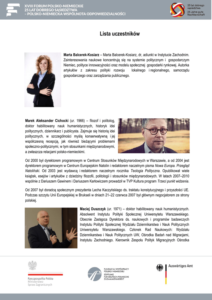 Lista uczestników Marta Balcerek-Kosiarz – Marta Balcerek-Kosiarz, dr, adiunkt w Instytucie Zachodnim. Zainteresowania naukowe koncentrują się na systemie politycznym i gospodarczym Niemiec, polityce innowacyjności oraz modelu społecznej gospodarki rynkowej. Autorka artykułów z zakresu polityki rozwoju lokalnego i regionalnego, samorządu gospodarczego oraz zarządzania publicznego. Marek Aleksander Cichocki (ur. 1966) – filozof i politolog, doktor habilitowany nauk humanistycznych, historyk idei politycznych, dziennikarz i publicysta. Zajmuje się historią idei politycznych, w szczególności myślą konserwatywną i jej współczesną recepcją, jak również bieżącymi problemami społeczno-politycznymi, w tym stosunkami międzynarodowymi, a zwłaszcza relacjami polsko-niemieckimi. Od 2000 był dyrektorem programowym w Centrum Stosunków Międzynarodowych w Warszawie, a od 2004 jest dyrektorem programowym w Centrum Europejskim Natolin i redaktorem naczelnym pisma Nowa Europa. Przegląd Natoliński. Od 2003 jest wydawcą i redaktorem naczelnym rocznika Teologia Polityczna. Opublikował wiele książek, esejów i artykułów z dziedziny filozofii, politologii i stosunków międzynarodowych. W latach 2007–2010 wspólnie z Dariuszem Gawinem i Dariuszem Karłowiczem prowadził w TVP Kultura program Trzeci punkt widzenia. Od 2007 był doradcą społecznym prezydenta Lecha Kaczyńskiego ds. traktatu konstytucyjnego i przyszłości UE. Podczas szczytu Unii Europejskiej w Brukseli w dniach 21–22 czerwca 2007 był głównym negocjatorem ze strony polskiej. Maciej Duszczyk (ur. 1971) – doktor habilitowany nauk humanistycznych. Absolwent Instytutu Polityki Społecznej Uniwersytetu Warszawskiego. Obecnie Zastępca Dyrektora ds. naukowych i programów badawczych Instytutu Polityki Społecznej Wydziału Dziennikarstwa i Nauk Politycznych Uniwersytetu Warszawskiego. Członek Rad Naukowych: Wydziału Dziennikarstwa i Nauk Politycznych UW, Ośrodka Badań nad Migracjami, Instytutu Zachodniego. Kierownik Zespołu Polityk Migracyjnych Ośrodka Badań nad Migracjami. Profesor Uniwersytetu Halle-Wittenberg oraz Uniwersytetu w Jenie. W latach 1999 - 2007 pracował w Urzędzie Komitetu Integracji Europejskiej m.in. jako Zastępca Dyrektora Departamentu Analiz i Strategii. W okresie negocjacji o członkostwo Polski w Unii Europejskiej doradzał Zespołowi Negocjacyjnemu w zakresie polityki społecznej Unii Europejskiej oraz Swobodnego Przepływu Osób. W latach 2008-2011 Członek Zespołu Doradców Strategicznych Prezesa Rady Ministrów Donalda Tuska. Współpracownik Programu Narodów Zjednoczonych ds. Rozwoju, Międzynarodowej Organizacji Pracy, Międzynarodowej Organizacji ds. Migracji, Komisji Europejskiej, Komitetu Regionów, Członek Rady Naukowej Ośrodka Badań nad Migracjami Uniwersytetu Warszawskiego. Ekspert Biura Pomocy Technicznej i Wymiany Informacji (TAIEX). Justyna Gotkowska jest obecnie analityczką ds. polityki bezpieczeństwa i obrony RFN, państw nordyckich i bałtyckich w Zespole Niemiec i Europy Północnej OSW oraz Głównym Specjalistą w projekcie Bezpieczeństwo i obronność w Europie Północnej. Do 2012 roku była koordynatorką projektu badawczego OSW nt. możliwości i ograniczeń współpracy wojskowej państw obszaru od Morza Bałtyckiego do Morza Czarnego, w latach 2008 – 2012 była analityczką ds. polityki zagranicznej i bezpieczeństwa RFN w Zespole Niemieckim OSW. Jerzy Haszczyński (ur. 1966) – dziennikarz, reporter, szef działu zagranicznego „Rzeczpospolitej”. Ukończył filozofię na Uniwersytecie Warszawskim. W swojej karierze związany był z tygodnikiem mniejszości polskiej na Litwie „Słowo Wileńskie” i dziennikiem „Rzeczpospolita”, w którym pracuje od 1991, a od 2000 kieruje działem zagranicznym. Był korespondentem „Rzeczpospolitej” w Niemczech. W 2003 wydał zbiór reportaży „Nie tylko pani Steinbach”, w którym przedstawił m.in. historię życia Eriki Steinbach. Łukasz Jasina (ur. 1980) – absolwent prawa, historii i dziennikarstwa na KUL oraz Collegium Invisibile, doktor nauk humanistycznych w zakresie filmoznawstwa w Instytucie Sztuki Polskiej Akademii Nauk. Stypendysta: Harvard Ukrainian Research Institute, Fundacji Kościuszkowskiej, Fundacji z Brzezia Lanckorońskich i Petro Jacyk Centre w Toronto. Pobyty naukowe miedzy innymi w: Harvard University i Brandeis University. Autor kilku pozycji monograficznych i kilkuset artykułów i tekstów naukowych. Członek redakcji "Kultury Liberalnej" i zespołu "Res Publiki Nowej", komentator prasowy, telewizyjny i radiowy, analityk i publicysta. Michał Tadeusz Kołodziejczyk – prawnik, absolwent Uniwersytetu Warszawskiego, długoletni dziennikarz, m.in. kierownik działu zagranicznego i zastępca redaktora naczelnego „Słowa – Dziennika Katolickiego”, członek kolegium ”Tygodnika AWS”, liczne pobyty studyjne i stypendia w Niemczech m.in. w Fundacjach im. Friedricha Eberta, Konrada Adenauera i Hansa Seidla. Wieloletni działacz Towarzystwa Polsko Niemieckiego w Warszawie, sekretarz Zarządu Krajowego Związku Towarzystw Niemiecko Polskich i redaktor naczelny miesięcznika „Pomosty”. Od 1998 r. doradca ministra – przewodniczącego Komitetu Integracji Europejskiej ds. obszaru niemieckojęzycznego i współpracy transgranicznej, sekretarz zespołu ekspertów przy przewodniczącym KIE. 2000/2001 konsul w Konsulacie Generalnym RP w Monachium. Od 2003 r. w Urzędzie M. st. Warszawy m. in. jako naczelnik Wydziału Rozwoju Gospodarczego i z-ca dyrektora Biura Obsługi Inwestorów. W latach 2008-2010 prowadził własną firma doradczą. Długoletni przewodniczący Rady Nadzorczej „Akwawit S.A” w Lesznie oraz członek władz statutowych warszawskich spółek deweloperskich z ramienia M. st. Warszawy. Piotr Włodzimierz Madajczyk (ur. 1959) – historyk, profesor nauk humanistycznych, wykładowca akademicki. Studiował historię na Uniwersytecie im. Adama