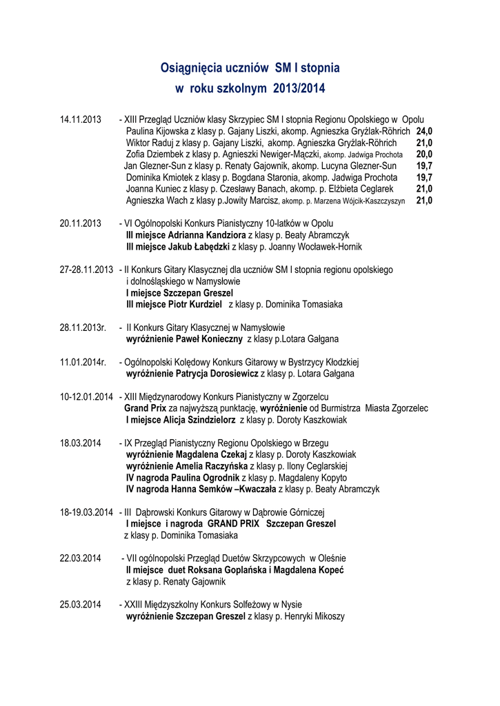 Osiągnięcia uczniów SM I stopnia w roku szkolnym 2013/2014 14.11.2013 - XIII Przegląd Uczniów klasy Skrzypiec SM I stopnia Regionu Opolskiego w Opolu Paulina Kijowska z klasy p. Gajany Liszki, akomp. Agnieszka Gryźlak-Röhrich 24,0 Wiktor Raduj z klasy p. Gajany Liszki, akomp. Agnieszka Gryźlak-Röhrich 21,0 Zofia Dziembek z klasy p. Agnieszki Newiger-Mączki, akomp. Jadwiga Prochota 20,0 Jan Glezner-Sun z klasy p. Renaty Gajownik, akomp. Lucyna Glezner-Sun 19,7 Dominika Kmiotek z klasy p. Bogdana Staronia, akomp. Jadwiga Prochota 19,7 Joanna Kuniec z klasy p. Czesławy Banach, akomp. p. Elżbieta Ceglarek 21,0 Agnieszka Wach z klasy p.Jowity Marcisz, akomp. p. Marzena Wójcik-Kaszczyszyn 21,0 20.11.2013 - VI Ogólnopolski Konkurs Pianistyczny 10-latków w Opolu III miejsce Adrianna Kandziora z klasy p. Beaty Abramczyk III miejsce Jakub Łabędzki z klasy p. Joanny Wocławek-Hornik 27-28.11.2013 - II Konkurs Gitary Klasycznej dla uczniów SM I stopnia regionu opolskiego i dolnośląskiego w Namysłowie I miejsce Szczepan Greszel III miejsce Piotr Kurdziel z klasy p. Dominika Tomasiaka 28.11.2013r. - II Konkurs Gitary Klasycznej w Namysłowie wyróżnienie Paweł Konieczny z klasy p.Lotara Gałgana 11.01.2014r. - Ogólnopolski Kolędowy Konkurs Gitarowy w Bystrzycy Kłodzkiej wyróżnienie Patrycja Dorosiewicz z klasy p. Lotara Gałgana 10-12.01.2014 - XIII Międzynarodowy Konkurs Pianistyczny w Zgorzelcu Grand Prix za najwyższą punktację, wyróżnienie od Burmistrza Miasta Zgorzelec I miejsce Alicja Szindzielorz z klasy p. Doroty Kaszkowiak 18.03.2014 - IX Przegląd Pianistyczny Regionu Opolskiego w Brzegu wyróżnienie Magdalena Czekaj z klasy p. Doroty Kaszkowiak wyróżnienie Amelia Raczyńska z klasy p. Ilony Ceglarskiej IV nagroda Paulina Ogrodnik z klasy p. Magdaleny Kopyto IV nagroda Hanna Semków –Kwaczała z klasy p. Beaty Abramczyk 18-19.03.2014 - III Dąbrowski Konkurs Gitarowy w Dąbrowie Górniczej I miejsce i nagroda GRAND PRIX Szczepan Greszel z klasy p. Dominika Tomasiaka 22.03.2014 - VII ogólnopolski Przegląd Duetów Skrzypcowych w Oleśnie II miejsce duet Roksana Goplańska i Magdalena Kopeć z klasy p. Renaty Gajownik 25.03.2014 - XXIII Międzyszkolny Konkurs Solfeżowy w Nysie wyróżnienie Szczepan Greszel z klasy p. Henryki Mikoszy 1-3.04.2014 - XII Ogólnopolski Konkurs Skrzypcowy im. Grażyny Bacewicz SM I stopnia we Wrocławiu II miejsce i Nagroda Prezydenta Wrocławia Roksana Goplańska z klasy p. Renaty Gajownik, akomp. Elżbieta Gorączko-Krawiec wyróżnienie Magdalena Kopeć z klasy p. Renaty Gajownik, akomp. Elżbieta Gorączko-Krawiec 2-3.04.2014 - VI Konkurs Gitarowy Gitara na Kresach w Chełmie I miejsce Szczepan Greszel z klasy p. D. Tomasiaka 9.04.2014 - VI Turniej Młodych Akordeonistów w Oleśnicy II miejsce Natalia Raczkowska z klasy p. Olgi Strelc wyróżnienie Piotr Topola z klasy p. Stanisławy Kruk 10-12.04.2014 - Międzynarodowy Konkurs Akordeonowy w Ostravie III miejsce Lukas Gogol z klasy p. Dariusza Kownackiego 10-12.04.2014 - X Ogólnopolskie Forum Młodych Instrumentalistów im. Karola i Antoniego Szafranków – Rybnik 2014 wyróżnienie Roksana Goplańska z klasy skrzypiec p. Renaty Gajownik akomp. Elżbieta Gorączko-Krawiec 11.04.2014r. - III Szkolny Konkurs Interpretacji Utworów Skrzypcowych dla kl.II,III C/6 i I,II C/4 Filia PSM – Opole wyróżnienie Matylda Krawczyk z klasy p. Judyty Niedźwiedzkiej- Mykity akomp. p. Elżbieta Ceglarek wyróżnienie Agnieszka Wach z klasy p. Jowity Marcisz akomp.p. Marzena Wójcik-Kaszczyszyn 11.04.2014r. - III Szkolny Konkurs Interpretacji Utworów Skrzypcowych dla kl.II,III C/6 i I,II C/4 Filia PSM – Opole wyróżnienie gr I Hanna Sobek z klasy p. Bogdana Staronia akomp. p. Jadwiga Prochota wyróżnienie gr I Paweł Glensk z klasy p. Gajany Liszki akomp. Agnieszka Gryźlak-Röhrich nagroda gr. II za najlepszą interpretację utworów skrzypcowych Paulina Kijowska z klasy p. Gajany Liszki, akomp. Agnieszka Gryźlak-Röhrich wyróżnienie gr II Dominika Kmiotek z klasy p. Bogdana Staronia akomp. p. Jadwiga Prochota wyróżnienie gr II Zofia Dziembek z klasy p. Agnieszki Newiger-Mączki akomp. p. Jadwiga Prochota 14.04.2014 - III Międzyszkolny Konkurs Pisania Dyktand dla klas III SM I stopnia Regionu Opolskiego w Opolu III nagroda Amelia Raczyńska z klasy p. Anity Grabowski wyróżnienie II st. Maciej Waloszczyk z klasy p. Anity Grabowski 14.04.2014r. III Międzyszkolny Konkurs Pisania Dyktand dla klas III SM I stopnia Regionu Opolskiego w Opolu wyróżnienie I stopnia Joanna Kuniec z klasy p. Doroty Kurek-Piesoczyńskiej wyróżnienie I stopnia Agnieszka Wach z klasy p. Doroty Kurek-Piesoczyńskiej 20.04.2014 - XXV Międzynarodowy Konkurs FLAME 2014 Jeunes Pianistes w Paryżu /Francja/ I miejsce kat. A gr.1 Alicja Szindzielorz z klasy p. Doroty Kaszkowiak 23.04-26.04.2014- XVII Festiwal „Gitariada 2014” w Kłodzku Grand Prix Szczepan Greszel z klasy p. Dominika Tomasiaka 25.04.2014 - XXI Regionalny Przegląd Pieśni im. prof. Adolfa Dygacza Śląskie Śpiewanie w Łubnianach II miejsce Chór Dziecięcy OPUSowcy pod kier. p. Ludmiły Zawadzkiej 25-26.04.2014r. - VII Ogólnopolski Konkurs Pianistyczny Szkół Muzycznych I stopnia „Mistrz klawiatury” w Warszawie wyróżnienie Siófra Zuzanna Cassidy z klasy p. Anny Sokołowskiej 26-28.04.2014 - III Ogólnopolski Festiwal Skrzypcowy dla uczniów SM I i II stopnia w Kielcach I miejsce Roksana Goplańska z klasy p. Renaty Gajownik, akomp. Elżbieta Gorączko-Krawiec III miejsce Miriam Powrósło z klasy p. Janusza Gajownika akomp. Elżbieta Gorączko-Krawiec III miejsce Magdalena Kopeć z klasy p. Renaty Gajownik akomp. Elżbieta Gorączko-Krawiec 15-16.05.2014 - XXI Muzyczne Prezentacje Młodych Skrzypków SM I stopnia w Bystrzycy Kłodzkiej II miejsce Miriam Powrósło z klasy p. Janusza Gajownika akomp. Agnieszka Gryźlak-Röhrich III miejsce Paulina Kijowska z klasy p. Gajany Liszki akomp. Agnieszka Gryźlak-Röhrich 17.0