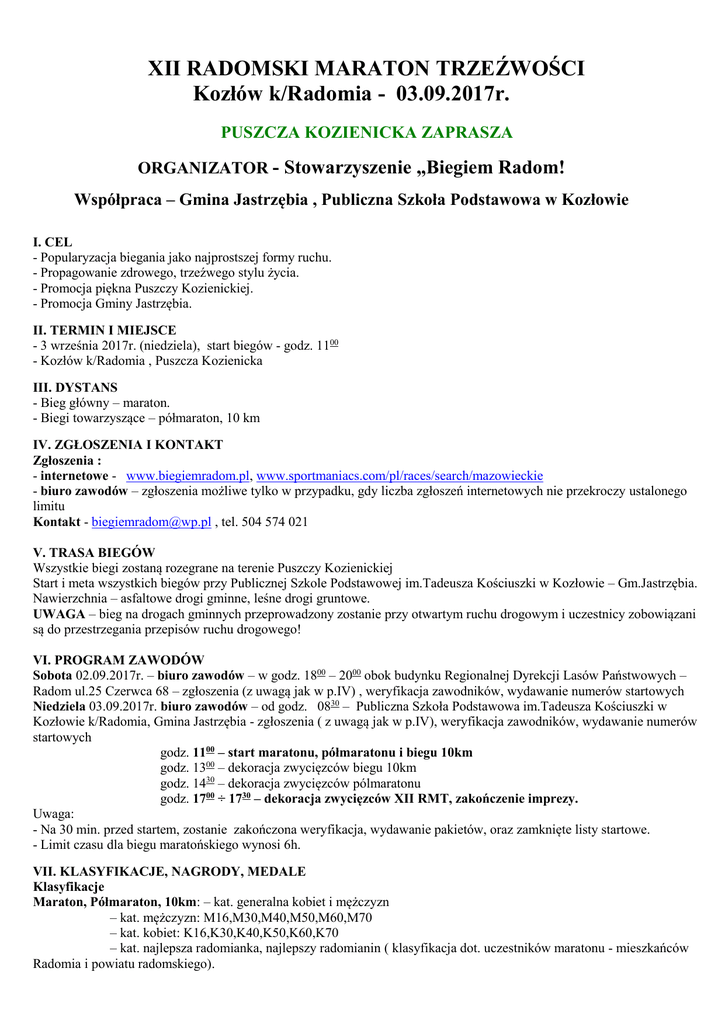 XII RADOMSKI MARATON TRZEŹWOŚCI Kozłów k/Radomia - 03.09.2017r. PUSZCZA KOZIENICKA ZAPRASZA ORGANIZATOR - Stowarzyszenie „Biegiem Radom! Współpraca – Gmina Jastrzębia , Publiczna Szkoła Podstawowa w Kozłowie I. CEL - Popularyzacja biegania jako najprostszej formy ruchu. - Propagowanie zdrowego, trzeźwego stylu życia. - Promocja piękna Puszczy Kozienickiej. - Promocja Gminy Jastrzębia. II. TERMIN I MIEJSCE - 3 września 2017r. (niedziela), start biegów - godz. 1100 - Kozłów k/Radomia , Puszcza Kozienicka III. DYSTANS - Bieg główny – maraton. - Biegi towarzyszące – półmaraton, 10 km IV. ZGŁOSZENIA I KONTAKT Zgłoszenia : - internetowe - www.biegiemradom.pl, www.sportmaniacs.com/pl/races/search/mazowieckie - biuro zawodów – zgłoszenia możliwe tylko w przypadku, gdy liczba zgłoszeń internetowych nie przekroczy ustalonego limitu Kontakt - [email protected] , tel. 504 574 021 V. TRASA BIEGÓW Wszystkie biegi zostaną rozegrane na terenie Puszczy Kozienickiej Start i meta wszystkich biegów przy Publicznej Szkole Podstawowej im.Tadeusza Kościuszki w Kozłowie – Gm.Jastrzębia. Nawierzchnia – asfaltowe drogi gminne, leśne drogi gruntowe. UWAGA – bieg na drogach gminnych przeprowadzony zostanie przy otwartym ruchu drogowym i uczestnicy zobowiązani są do przestrzegania przepisów ruchu drogowego! VI. PROGRAM ZAWODÓW Sobota 02.09.2017r. – biuro zawodów – w godz. 1800 – 2000 obok budynku Regionalnej Dyrekcji Lasów Państwowych – Radom ul.25 Czerwca 68 – zgłoszenia (z uwagą jak w p.IV) , weryfikacja zawodników, wydawanie numerów startowych Niedziela 03.09.2017r. biuro zawodów – od godz. 0830 – Publiczna Szkoła Podstawowa im.Tadeusza Kościuszki w Kozłowie k/Radomia, Gmina Jastrzębia - zgłoszenia ( z uwagą jak w p.IV), weryfikacja zawodników, wydawanie numerów startowych godz. 1100 – start maratonu, półmaratonu i biegu 10km godz. 1300 – dekoracja zwycięzców biegu 10km godz. 1430 – dekoracja zwycięzców pólmaratonu godz. 1700 ÷ 1730 – dekoracja zwycięzców XII RMT, zakończenie imprezy. Uwaga: - Na 30 min. przed startem, zostanie zakończona weryfikacja, wydawanie pakietów, oraz zamknięte listy startowe. - Limit czasu dla biegu maratońskiego wynosi 6h. VII. KLASYFIKACJE, NAGRODY, MEDALE Klasyfikacje Maraton, Półmaraton, 10km: – kat. generalna kobiet i mężczyzn – kat. mężczyzn: M16,M30,M40,M50,M60,M70 – kat. kobiet: K16,K30,K40,K50,K60,K70 – kat. najlepsza radomianka, najlepszy radomianin ( klasyfikacja dot. uczestników maratonu - mieszkańców Radomia i powiatu radomskiego). Nagrody Maraton 1- 5 miejsce w kat. generalnej – puchary , nagrody finansowe – 600; 400; 300; 200; 100 zł 1- 3 miejsce w kat. wiekowych - puchary 1- miejsce w kat. najlepszy radomianin i najlepsza radomianka – puchary Półmaraton 1- 3 miejsce w kat. generalnej – puchary, nagrody finansowe – 300, 200, 100 zł 1 miejsce w kat. wiekowych - puchary 10km – 1-3 miejsce w kat. generalnej – puchary , nagrody finansowe – 300, 200, 100 zł 1 miejsce w kat. wiekowych - puchary Zawodnicy nagradzani w kat. generalnej nie będą uwzględniani przy nagradzaniu w kat. wiekowych. Medale okolicznościowe – wszyscy zawodnicy, którzy ukończą maraton, półmaraton, lub bieg na dyst. 10km. VIII. UCZESTNICTWO - Do startu w maratonie dopuszczeni zostaną zawodnicy którzy ukończyli 18-sty rok życia, posiadają aktualne badania lekarskie lub po podpisaniu oświadczenia o stanie zdrowia. - W półmaratonie i biegu na dystansie 10km mogą startować osoby które ukończyły 16-ty rok życia- zawodnicy niepełnoletni muszą posiadać pisemną zgodę rodziców na uczestnictwo w biegu. UWAGA ! – ustala się limit uczestników – 500 zawodników (łącznie dla wszystkich biegów). Z chwilą zgłoszenia 500 zawodnika, listy zgłoszeniowe zostaną zamknięte. Za zgłoszenie kompletne, przyjmuje się poprawnie wypełniony i przesłany formularz zgłoszeniowy, oraz terminowe dokonanie opłaty startowej. IX. OPŁATY Terminy i wysokości opłat startowych 1. termin – do 31.05.2017r. - Maraton : 40,00 zł. , Półmaraton ,10km : 30,00 zł. 2. termin - 01.06 – 31.08.2017r. – Maraton : 60,00 zł., Półmaraton ,10km : 45,00 zł. 3. termin – biuro zawodów – Maraton : 80,00 zł., Półmaraton ,10km : 60,00 zł. Z opłaty startowej zwolnieni są zawodnicy i zawodniczki powyżej 65 roku życia, którzy dokonają zgłoszenia w 1. terminie (do 31.05.2017r.). Opłata startowa członków Stowarzyszenia „Biegiem Radom!”, którzy dokonają zgłoszenia i opłaty startowej w 1. terminie (do 31.05.2017r.) - maraton – 30,00zł.,półmaraton i 10km – 20,00 zł. Okolicznościowe koszulki techniczne – dodatkowa opłata - 15,00 zł. X. WYŻYWIENIE, NOCLEGI, TRANSPORT - Organizator zapewnia wszystkim zawodnikom posiłek po biegu. - Na trasie biegu zlokalizowane będą punkty odświeżania i odżywcze oznaczone na mapce biegów. - Organizator zapewnia bezpłatny nocleg w sali Publicznej Szkoły Podstawowej w Kozłowie(własny śpiwor i materac). - Zorganizowany dojazd z Radomia do Kozłowa ( nie dotyczy zaw. z Radomia i powiatu radomskiego) – sobota 02.09, godz. 20.00 - odjazd z biura zawodów (ul.25 Czerwca 68) , niedziela 03.09 godz. 09.00 – odjazd z parkingu przed dworcem PKP, - Organizator nie przewiduje zbiorowego transportu z Kozłowa do Radomia po zakończeniu imprezy. XI. POSTANOWIENIA KOŃCOWE - Organizatorzy nie odpowiadają za rzeczy zagubione, a nie oddane do depozytu. - Biegi z elektronicznym pomiarem czasu. - Zawodnicy, którzy ukończą bieg otrzymają wiadomość SMS z uzyskanym wynikiem, a także będą mogli pobrać ze strony internetowej swój imienny dyplom. - Uczestnicy biegów biorą udział w zawodach na własną odpowiedzialność i wskazane jest ubezpieczenie na własny koszt od następstw nieszczęśliwych wypadków. - Pobranie numeru startowego przez zawodnika jest równoznaczne z akceptacją regulaminu 