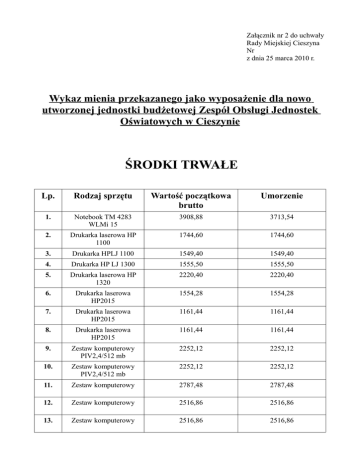 Załącznik nr 2 do uchwały Rady Miejskiej Cieszyna Nr z dnia 25 marca 2010 r. Wykaz mienia przekazanego jako wyposażenie dla nowo utworzonej jednostki budżetowej Zespół Obsługi Jednostek Oświatowych w Cieszynie ŚRODKI TRWAŁE Lp. Rodzaj sprzętu Wartość początkowa brutto Umorzenie 1. Notebook TM 4283 WLMi 15 3908,88 3713,54 2. Drukarka laserowa HP 1100 1744,60 1744,60 3. Drukarka HPLJ 1100 1549,40 1549,40 4. Drukarka HP LJ 1300 1555,50 1555,50 5. Drukarka laserowa HP 1320 2220,40 2220,40 6. Drukarka laserowa HP2015 1554,28 1554,28 7. Drukarka laserowa HP2015 1161,44 1161,44 8. Drukarka laserowa HP2015 1161,44 1161,44 9. Zestaw komputerowy PIV2,4/512 mb 2252,12 2252,12 10. Zestaw komputerowy PIV2,4/512 mb 2252,12 2252,12 11. Zestaw komputerowy 2787,48 2787,48 12. Zestaw komputerowy 2516,86 2516,86 13. Zestaw komputerowy 2516,86 2516,86 14. Zestaw komputerowy Asus Barebone 1484,74 1484,74 15. Zestaw komputerowy Asus Barebone 1484,74 1484,74 16. Zestaw komputerowy Asus Barebone 1484,74 1484,74 17. Zestaw komputerowy Asus Barebone 1484,74 1484,74 18. Zestaw komputerowy Asus Barebone 1484,74 1484,74 19. Zestaw komputerowy Infologic Pundit E 7400 2609,02 2609,02 20. Laptop Fujitsu Siemens EspM 2865,78 2865,78 21. Laptop Fujitsu Siemens EM 2865,78 2865,78 22. Niszczarka Intymus 402 2186,93 2186,93 23. Niszczarka GBC CC 185 1281,00 1281,00 24. Fax Panasonic KXF 110 2620,80 2620,80 WYKAZ ŚRODKÓW NISKOCENNYCH Lp. Rodzaj sprzętu Ilość 1. Drukarka atramentowa 815 c 1 2. Drukarka laserowa 2 3. Biurko 21 4. Biurko z nadstwaką 3 5. Biurko – narożnik 3 6. Biurko – pomocnik 4 7. Kontener 19 8. Stół 7 9. Stolik TV 2 10. Szafa z nadstawką 2 11. Szafa 27 12. Szafka metalowa 1 13. Szafka 2 14. Szafka kartotekowa 1 15. Szafka wisząca 3 16. Szafka kuchenna 5 17. Ławka 1 18. Krzesła obrotowe 14 19. Krzesło 30 20. Krzesło – taboret 3 21. Regały 6 22. Tablica magnetyczna 1 23. Tablica ogłoszeń 1 24. Kwietnik 1 25. Wieszaki 5 26. 2 Drabinki biurowe 27. Gilotyna 1 28. Czajnik 3 29. Lampa biurowa 3 30. Apteczka 1 31. Lustro 4 32. Wentylator 5 33. Suszarka elektryczna do rąk 2 34. Grzejnik elektryczny 1 35. Gaśnice 2 36. Telefony 11 37. Kalkurator 11 38. Kalkulator z taśmą 3