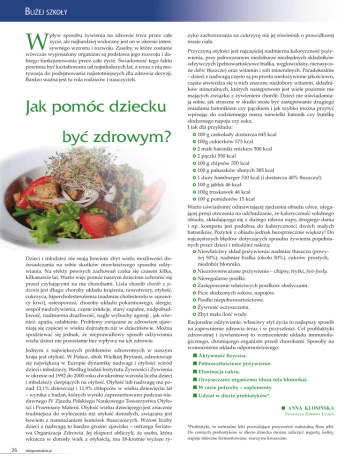 Bliżej szkoły W pływ sposobu żywienia na zdrowie trwa przez całe życie, ale najbardziej widoczny jest on w okresie intensywnego wzrostu i rozwoju. Zasoby, w które zostanie wówczas wyposażony organizm są podstawa jego rozwoju i dobrego funkcjonowania przez całe życie. Świadomość tego faktu powinna być kształtowana od najmłodszych lat, a wraz z nią motywacja do podejmowania najistotniejszych dla zdrowia decyzji. Bardzo ważna jest tu rola rodziców i nauczycieli. Jak pomóc dziecku być zdrowym? Dzieci i młodzież nie mają bowiem zbyt wielu możliwości doświadczania na sobie skutków niewłaściwego sposobu odżywiania. Na efekty pewnych zachowań czeka się czasem kilka, kilkanaście lat. Warto więc pomóc naszym dzieciom uchronić się przed czyhającymi na nie chorobami. Lista chorób chorób z jedzenia jest długa: choroby układu krążenia, nowotwory, otyłość, cukrzyca, hipercholesterolemia (nadmiar cholesterolu w surowicy krwi), osteoporoza, choroby układu pokarmowego, alergie, zespół niedożywienia, częste infekcje, stany zapalne, nadpobudliwość, nadmierna drażliwość, nagłe wybuchy agresji , jak również: apatia, osłabienie. Problemy związane ze zdrowiem ujawniają się częściej w wieku dojrzałym niż w dzieciństwie. Można spodziewać się jednak, że nieprawidłowy sposób odżywiania wielu dzieci nie pozostanie bez wpływu na ich zdrowie. Jednym z największych problemów zdrowotnych w naszym kraju jest otyłość. W Polsce, obok Wielkiej Brytanii, odnotowuje się największą w Europie dynamikę nadwagi i otyłości wśród dzieci i młodzieży. Według badań Instytutu Żywności i Żywienia w okresie od 1992 do 2000 roku dwukrotnie wzrosła liczba dzieci i młodzieży cierpiących na otyłość. Otyłość lub nadwagę ma ponad 13,1% dziewcząt i 11,9% chłopców w wieku dziewięciu lat – wynika z badań, których wyniki zaprezentowano podczas niedawnego IV Zjazdu Polskiego Naukowego Towarzystwa Otyłości i Przemiany Materii. Otyłość wieku dziecięcego jest znacznie trudniejsza do wyleczenia niż otyłość dorosłych, związana jest bowiem z namnażaniem komórek tłuszczowych. Wzrost liczby dzieci z nadwagą to bardzo groźne zjawisko – ostrzega Światowa Organizacja Zdrowia. Jej eksperci obliczyli, że osoba, która wkracza w dorosły wiek z otyłością, ma 18-krotnie wyższe ry- 26 blizejprzedszkola.pl zyko zachorowania na cukrzycę niż jej rówieśnik o prawidłowej masie ciała. Przyczyną otyłości jest najczęściej nadmierna kaloryczność pożywienia, przy jednoczesnym niedoborze niezbędnych składników odżywczych (pełnowartościowe białka, węglowodany, nienasycone dobre tłuszcze) oraz witamin i soli mineralnych. Paradoksalnie – dzieci z nadwagą często są po prostu niedożywione jakościowo, często stwierdza się u nich znaczne niedobory witamin, składników mineralnych, których następstwem jest wiele pozornie nie mających związku z żywieniem chorób. Dzieci nie uświadamiają sobie, jak straszne w skutki może być zastępowanie drugiego śniadania batonikiem czy pączkiem i jak szybko można przytyć wpisując do codziennego menu niewielki batonik czy butelkę słodzonego napoju czy soku. I tak dla przykładu: o 100 g czekolady dostarcza 645 kcal o 100g cukierków 575 kcal o 2 małe batoniki snickers 500 kcal o 2 pączki 550 kcal o 100 g chipsów 550 kcal o 100 g paluszków słonych 385 kcal o 1 duży hamburger 510 kcal (i dostarcza 48% tłuszczu!) o 100 g jabłek 46 kcal o 100g truskawek 46 kcal o 100 g pomidorów 15 kcal Warto uświadomić odmawiającej zjedzenia obiadu córce, ulegającej presji otoczenia na odchudzanie, że kaloryczność solidnego obiadu, składającego się z dużego talerza zupy, drugiego dania i np. kompotu jest podobna do kaloryczności dwóch małych batoników. Pożytek z obiadu jednak bezsprzecznie większy! Do najczęstszych błędów dotyczących sposobu żywienia popełnianych przez dzieci i młodzież należą: o Niewłaściwy skład pożywienia: nadmiar tłuszczu (powyżej 50%), nadmiar białka (około 50%), cukrów prostych, niedobór błonnika. o Niezrównoważone pożywienie – chipsy, frytki, fast-foody. o Nieregularne posiłki. o Zastępowanie właściwych posiłków słodyczami. o Picie słodzonych soków, napojów. o Posiłki niepełnowartościowe. o Żywność oczyszczona. o Zbyt mała ilość wody. Racjonalne odżywianie, własciwy styl życia to najlepszy sposób na zapewnienie zdrowia teraz i w przyszłości. Cel profilaktyki zdrowotnej i żywieniowej to wzmocnienie układu immunologicznego, chroniącego organizm przed chorobami. Sposoby na wzmocnienie układu odpornościowego: Aktywność fizyczna. Pełnowartościowe pożywienie. Eliminacja cukru. Oczyszczanie organizmu (duża rola błonnika). W razie potrzeby – suplementy. Udział w diecie probiotyków*. ■ Anna Kłosińska Fundacja Zdrowy Uczeń *Probiotyki, to naturalne leki pozwalające przywrócić naturalną florę jelit. Do cennych probiotyków w diecie dziecka można zaliczyć: jogurty, kefiry, napoje mleczne fermentowane, warzywa kwaszone.
