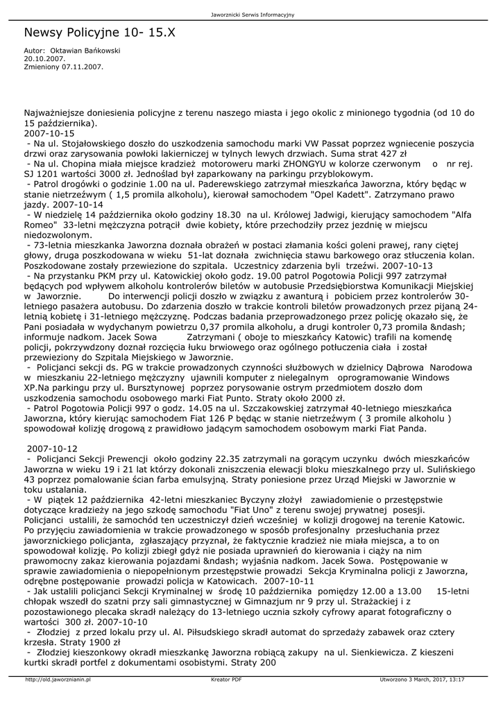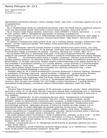 Jaworznicki Serwis Informacyjny Newsy Policyjne 10- 15.X Autor: Oktawian Bańkowski 20.10.2007. Zmieniony 07.11.2007. Najważniejsze doniesienia policyjne z terenu naszego miasta i jego okolic z minionego tygodnia (od 10 do 15 października). 2007-10-15 - Na ul. Stojałowskiego doszło do uszkodzenia samochodu marki VW Passat poprzez wgniecenie poszycia drzwi oraz zarysowania powłoki lakierniczej w tylnych lewych drzwiach. Suma strat 427 zł - Na ul. Chopina miała miejsce kradzież motoroweru marki ZHONGYU w kolorze czerwonym o nr rej. SJ 1201 wartości 3000 zł. Jednoślad był zaparkowany na parkingu przyblokowym. - Patrol drogówki o godzinie 1.00 na ul. Paderewskiego zatrzymał mieszkańca Jaworzna, który będąc w stanie nietrzeźwym ( 1,5 promila alkoholu), kierował samochodem "Opel Kadett". Zatrzymano prawo jazdy. 2007-10-14 - W niedzielę 14 października około godziny 18.30 na ul. Królowej Jadwigi, kierujący samochodem "Alfa Romeo" 33-letni mężczyzna potrącił dwie kobiety, które przechodziły przez jezdnię w miejscu niedozwolonym. - 73-letnia mieszkanka Jaworzna doznała obrażeń w postaci złamania kości goleni prawej, rany ciętej głowy, druga poszkodowana w wieku 51-lat doznała zwichnięcia stawu barkowego oraz stłuczenia kolan. Poszkodowane zostały przewiezione do szpitala. Uczestnicy zdarzenia byli trzeźwi. 2007-10-13 - Na przystanku PKM przy ul. Katowickiej około godz. 19.00 patrol Pogotowia Policji 997 zatrzymał będących pod wpływem alkoholu kontrolerów biletów w autobusie Przedsiębiorstwa Komunikacji Miejskiej w Jaworznie. Do interwencji policji doszło w związku z awanturą i pobiciem przez kontrolerów 30letniego pasażera autobusu. Do zdarzenia doszło w trakcie kontroli biletów prowadzonych przez pijaną 24letnią kobietę i 31-letniego mężczyznę. Podczas badania przeprowadzonego przez policję okazało się, że Pani posiadała w wydychanym powietrzu 0,37 promila alkoholu, a drugi kontroler 0,73 promila – informuje nadkom. Jacek Sowa Zatrzymani ( oboje to mieszkańcy Katowic) trafili na komendę policji, pokrzywdzony doznał rozcięcia łuku brwiowego oraz ogólnego potłuczenia ciała i został przewieziony do Szpitala Miejskiego w Jaworznie. - Policjanci sekcji ds. PG w trakcie prowadzonych czynności służbowych w dzielnicy Dąbrowa Narodowa w mieszkaniu 22-letniego mężczyzny ujawnili komputer z nielegalnym oprogramowanie Windows XP.Na parkingu przy ul. Bursztynowej poprzez porysowanie ostrym przedmiotem doszło dom uszkodzenia samochodu osobowego marki Fiat Punto. Straty około 2000 zł. - Patrol Pogotowia Policji 997 o godz. 14.05 na ul. Szczakowskiej zatrzymał 40-letniego mieszkańca Jaworzna, który kierując samochodem Fiat 126 P będąc w stanie nietrzeźwym ( 3 promile alkoholu ) spowodował kolizję drogową z prawidłowo jadącym samochodem osobowym marki Fiat Panda. 2007-10-12 - Policjanci Sekcji Prewencji około godziny 22.35 zatrzymali na gorącym uczynku dwóch mieszkańców Jaworzna w wieku 19 i 21 lat którzy dokonali zniszczenia elewacji bloku mieszkalnego przy ul. Sulińskiego 43 poprzez pomalowanie ścian farba emulsyjną. Straty poniesione przez Urząd Miejski w Jaworznie w toku ustalania. - W piątek 12 października 42-letni mieszkaniec Byczyny złożył zawiadomienie o przestępstwie dotyczące kradzieży na jego szkodę samochodu "Fiat Uno" z terenu swojej prywatnej posesji. Policjanci ustalili, że samochód ten uczestniczył dzień wcześniej w kolizji drogowej na terenie Katowic. Po przyjęciu zawiadomienia w trakcie prowadzonego w sposób profesjonalny przesłuchania przez jaworznickiego policjanta, zgłaszający przyznał, że faktycznie kradzież nie miała miejsca, a to on spowodował kolizję. Po kolizji zbiegł gdyż nie posiada uprawnień do kierowania i ciąży na nim prawomocny zakaz kierowania pojazdami – wyjaśnia nadkom. Jacek Sowa. Postępowanie w sprawie zawiadomienia o niepopełnionym przestępstwie prowadzi Sekcja Kryminalna policji z Jaworzna, odrębne postępowanie prowadzi policja w Katowicach. 2007-10-11 - Jak ustalili policjanci Sekcji Kryminalnej w środę 10 października pomiędzy 12.00 a 13.00 15-letni chłopak wszedł do szatni przy sali gimnastycznej w Gimnazjum nr 9 przy ul. Strażackiej i z pozostawionego plecaka skradł należący do 13-letniego ucznia szkoły cyfrowy aparat fotograficzny o wartości 300 zł. 2007-10-10 - Złodziej z przed lokalu przy ul. Al. Piłsudskiego skradł automat do sprzedaży zabawek oraz cztery krzesła. Straty 1900 zł - Złodziej kieszonkowy okradł mieszkankę Jaworzna robiącą zakupy na ul. Sienkiewicza. Z kieszeni kurtki skradł portfel z dokumentami osobistymi. Straty 200 http://old.jaworznianin.pl Kreator PDF Utworzono 3 March, 2017, 13:17