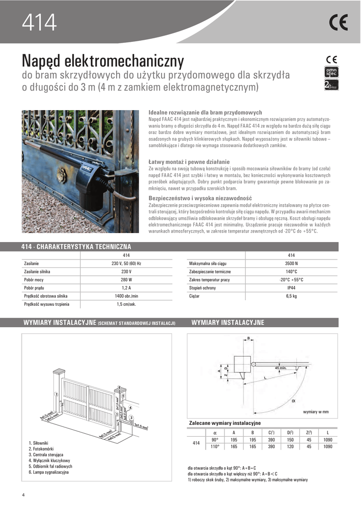 414 Napúd elektromechaniczny do bram skrzydwowych do uĚytku przydomowego dla skrzydwa o dwugoĆci do 3 m (4 m z zamkiem elektromagnetycznym) Idealne rozwiØzanie dla bram przydomowych Napúd FAAC 414 jest najbardziej praktycznym i ekonomicznym rozwiæzaniem przy automatyzowaniu bramy o dđugoħci skrzydđa do 4 m. Napúd FAAC 414 ze wzglúdu na bardzo duľæ siđú ciægu oraz bardzo dobre wymiary montaľowe, jest idealnym rozwiæzaniem do automatyzacji bram osadzonych na grubych klinkierowych sđupkach. Napúd wyposaľony jest w siđowniki tubowe – samoblokujæce i dlatego nie wymaga stosowania dodatkowych zamków. vatwy montaĚ i pewne dziawanie Ze wzglúdu na swojæ tubowæ konstrukcjú i sposób mocowania siđowników do bramy (od czođa) napúd FAAC 414 jest szybki i đatwy w montaľu, bez koniecznoħci wykonywania kosztownych przeróbek adaptujæcych. Dobry punkt podparcia bramy gwarantuje pewne blokowanie po zamkniúciu, nawet w przypadku szerokich bram. Bezpieczeöstwo i wysoka niezawodnoĆÚ Zabezpieczenie przeciwzgnieceniowe zapewnia moduđ elektroniczny instalowany na pđytce centrali sterujæcej, który bezpoħrednio kontroluje siđú ciægu napúdu. W przypadku awarii mechanizm odblokowujæcy umoľliwia odblokowanie skrzydeđ bramy i obsđugú rúcznæ. Koszt obsđugi napúdu elektromechanicznego FAAC 414 jest minimalny. Urzædzenie pracuje niezawodnie w kaľdych warunkach atmosferycznych, w zakresie temperatur zewnútrznych od -20°C do +55°C. 414 - CHARAKTERYSTYKA TECHNICZNA 414 Zasilanie 230 V, 50 (60) Hz 414 Maksymalna siđa ciægu 3500 N Zasilanie silnika 230 V Zabezpieczanie termiczne 140°C Pobór mocy 280 W Zakres temperatur pracy -20°C +55°C Pobór prædu 1,2 A Stopieē ochrony IP44 Ciúľar 6,5 kg Prúdkoħè obrotowa silnika 1400 obr./min Prúdkoħè wysuwu trzpienia 1,5 cm/sek. WYMIARY INSTALACYJNE (SCHEMAT STANDARDOWEJ INSTALACJI) WYMIARY INSTALACYJNE wymiary w mm Zalecane wymiary instalacyjne Siłowniki Fotokomórki Centrala sterująca 1. Siđowniki Wyłącznik kluczykowy 2. Fotokomórki Odbiornik fal radiowych Lampa sygnalizacyjna 3. Centrala sterujæca 4. Wyđæcznik kluczykowy 5. Odbiornik fal radiowych 6. Lampa sygnalizacyjna 4 414 A B C(1) D(2) Z(3) L 90° 110° 195 165 195 165 390 390 150 120 45 45 1090 1090 dla otwarcia skrzydđa o kæt 90°: A+B=C dla otwarcia skrzydđa o kæt wiúkszy niľ 90°: A+B<C 1) roboczy skok ħruby, 2) maksymalne wymiary, 3) maksymalne wymiary 414 - WyposaĚenie i cennik Model Maks. dđugoħè skrzydđa (m) 414 (prawy/lewy) Zastosowanie Czústotliwoħè uľytkowania (cykle/godz.) 4 20 WyposaĚenie dodatkowe do modelu 414 Pđyta montaľowa (do wmurowania) Klucz odblokowujæcy Czujnik wykrywania przeszkody - Safecoder* Centrala sterujæca 455D Centrala sterujæca E 045 Obudowa do centrali sterujæcej - model E Urzædzenia zdalnego sterowania, bezpieczeēstwa i sygnalizacji Kod artykuđu Cena netto (zđ) Cena brutto (zđ) 6171013/12 660,00 811,80 Kod artykuđu Cena netto (zđ) Cena brutto (zđ) 737604 713009 404041 790917 790005 720119 48,00 13,00 189,00 600,00 600,00 67,00 patrz strony od 79 do 83 59,04 15,99 232,47 738,00 738,00 82,41 Cena netto (zđ) Cena brutto (zđ) 1.999,00 2.458,77 Cena netto (zđ) Cena brutto (zđ) 1.999,00 2.458,77 Cena netto (zđ) Cena brutto (zđ) 2.299,00 2.827,77 Gotowy zestaw 414 - do bram dwuskrzydwowych o dw. do 6 m (455 D) Iloħè Opis wyposaľenia Kod artykuđu 2 1 1 Siđowniki 414 z elementami mocujæcymi Centrala sterujæca 455 D Obudowa do centrali 455 mod. E 6171013/12 790917 720119 1 Odbiornik radiowy RP2 LC 433 MHz, 2-kanađowy 1 Pilot 4-przyciskowy XT4 433 RC/XT4 433 RCBE, z kodem dynamicznie zmiennym 1 Fotokomórka SAFEBEAM o zasiúgu 20 m 787742 787452/797454 785165 Gotowy zestaw 414 - do bram dwuskrzydwowych o dw. do 6 m (E 045) Iloħè Opis wyposaľenia Kod artykuđu 2 1 1 Siđowniki 414 z elementami mocujæcymi Centrala sterujæca E 045 Obudowa do centrali 455 mod. E 6171013/12 790005 720119 1 Moduđ radiowy XF 433 1 Pilot 4-przyciskowy XT4 433 RC/XT4 433 RCBE, z kodem dynamicznie zmiennym 1 Fotokomórka XP 15B 319006 787452/797454 785149 Iloħè Opis wyposaľenia Kod artykuđu 2 1 1 Siđowniki 414 z elementami mocujæcymi Centrala sterujæca E 045 Obudowa do centrali 455 mod. E 6171013/12 790917 720119 1 Moduđ radiowy XF 433 1 Pilot 4-przyciskowy XT4 433 RC/XT4 433 RCBE, z kodem dynamicznie zmiennym 319006 1 Fotokomórka XP 15B 785149 2 Czujnik wykrywania przeszkody - Safecoder 404041 787452/797454 Uwagi W przypadku wystúpowania dodatkowych zakđóceē fal radiowych moľe byè konieczne zastosowanie anteny zewnútrznej do odbiornika radiowego, zwiúkszajæcej zasiúg pilotów. * Do zastosowania z centralæ E 045 AKCESORIA WywØcznik kluczykowy str. 84 Elektrozamek str. 85 Fotokomórka Safebeam str. 83 Antena str. 79 Lampa FAACLIGHT str. 82 Pilot XT4 433 RC Pilot XT4 433 RCBE str. 78 5 Napãdy do bram skrzydwowych Gotowy zestaw 414 - do bram dwuskrzydwowych o dw. do 6 m (E 045)