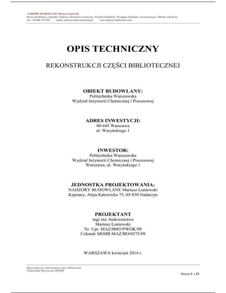 NADZORY BUDOWLANE Mariusz Łuniewski Kierownik Budowy, Inspektor Nadzoru, Doradztwo techniczne, Projekty budynków, Przeglądy budynków, Inwentaryzacje, Obiekty zabytkowe tel.:+48 696 770 109 email: [email protected] www.nadzory-budowlane.com OPIS TECHNICZNY REKONSTRUKCJI CZĘŚCI BIBLIOTECZNEJ OBIEKT BUDOWLANY: Politechnika Warszawska Wydział Inżynierii Chemicznej i Procesowej ADRES INWESTYCJI: 00-645 Warszawa ul. Waryńskiego 1 INWESTOR: Politechnika Warszawska Wydział Inżynierii Chemicznej i Procesowej Warszawa, ul. Waryńskiego 1 JEDNOSTKA PROJEKTOWANIA: NADZORY BUDOWLANE Mariusz Łuniewski Kajetany, Aleja Katowicka 75, 05-830 Nadarzyn PROJEKTANT mgr inż. budownictwa Mariusz Łuniewski Nr. Upr. MAZ/0085/PWOK/09 Członek MOIIB MAZ/BO/0575/09 WARSZAWA kwiecień 2014 r. Opis techniczny, rekonstrukcja części bibliotecznej, Politechnika Warszawska WICHiP Strona 1 z 13 NADZORY BUDOWLANE Mariusz Łuniewski Kierownik Budowy, Inspektor Nadzoru, Doradztwo techniczne, Projekty budynków, Przeglądy budynków, Inwentaryzacje, Obiekty zabytkowe tel.:+48 696 770 109 email: [email protected] www.nadzory-budowlane.com SPIS ZAWARTOŚCI OPRACOWANIA: 1. ZAŁĄCZNIKI FORMALNO PRAWNE: - kopia uprawnień projektanta - kopia zaświadczenia o przynależności do Izby Inżynierów Budownictwa - oświadczenie projektanta 2. OPIS TECHNICZNY 3. CZĘŚĆ RYSUNKOWA Opis techniczny, rekonstrukcja części bibliotecznej, Politechnika Warszawska WICHiP Strona 2 z 13 NADZORY BUDOWLANE Mariusz Łuniewski Kierownik Budowy, Inspektor Nadzoru, Doradztwo techniczne, Projekty budynków, Przeglądy budynków, Inwentaryzacje, Obiekty zabytkowe tel.:+48 696 770 109 email: [email protected] www.nadzory-budowlane.com 1. Załączniki formalno-prawne Opis techniczny, rekonstrukcja części bibliotecznej, Politechnika Warszawska WICHiP Strona 3 z 13 NADZORY BUDOWLANE Mariusz Łuniewski Kierownik Budowy, Inspektor Nadzoru, Doradztwo techniczne, Projekty budynków, Przeglądy budynków, Inwentaryzacje, Obiekty zabytkowe tel.:+48 696 770 109 email: [email protected] www.nadzory-budowlane.com NINIEJSZYM OŚWIADCZA SIĘ, ŻE PROJEKT REKONSTRUKCJI CZĘŚCI BIBLIOTECZNEJ W WARSZAWIE PRZY ul. WARYŃSKIEGO 1, BUDYNEK POLITECHNIKI WARSZAWSKIEJ PROCESOWEJ WYKONANY WYDZIAŁU ZOSTAŁ INŻYNIERII ZGODNIE Z CHEMICZNEJ I OBOWIĄZUJĄCYMI PRZEPISAMI ORAZ ZASADAMI WIEDZY TECHNICZNEJ. Opis techniczny, rekonstrukcja części bibliotecznej, Politechnika Warszawska WICHiP Strona 4 z 13 NADZORY BUDOWLANE Mariusz Łuniewski Kierownik Budowy, Inspektor Nadzoru, Doradztwo techniczne, Projekty budynków, Przeglądy budynków, Inwentaryzacje, Obiekty zabytkowe tel.:+48 696 770 109 email: [email protected] www.nadzory-budowlane.com 2. Opis techniczny 1. Podstawa opracowania - Zlecenie Wydziału Inżynierii Chemicznej i Procesowej Politechniki Warszawskiej - Oględziny obiektu dokonane we wrześniu 2013 roku oraz w lutym 2014 roku - Dokumentacja stanu istniejącego budynku - Opinia Techniczna ustalenia dopuszczalnego obciążenia stropu z Oceną wpływu na statykę budynku - Informacje uzyskane od zleceniodawcy - Publikacje książkowe, normy, instrukcje i akty prawne - Przedmiar na wykonanie prac budowlanych 2. Przedmiot, zakres i cel oceny Przedmiotem opracowania jest opis techniczny rekonstrukcji części bibliotecznej (pomieszczenie Nr 604) w budynku Wydziału Inżynierii Chemicznej i Procesowej Politechniki Warszawskiej. 3. Lokalizacja budynku Przedmiotowy budynek zlokalizowany jest przy ulicy Waryńskiego 1 w Warszawie. Działka posiada dostęp do drogi publicznej. Budynek nie leży też w strefie eksploatacji górniczej. 4. Charakterystyka budynku Zespół budynków, mieszczących Wydział Inżynierii Chemicznej i Procesowej Politechniki Warszawskiej, został zlokalizowany na terenie wolnym od zabudowy przy ul. Waryńskiego 1 w odległości kilkudziesięciu metrów od ulicy. Płaski teren, na którym znajdują się budynki jest uzbrojony we wszystkie instalacje miejskie z dojazdami o nawierzchniach typu utwardzonego. Budynek części wysokiej jest o konstrukcji żelbetowej, prefabrykowanej, stanowi w przekroju poprzecznym ramę 8-kondygnacyjną dwusłupową z wspornikami i ze sztywnymi węzłami. Słupy i ramy są zamocowane w monolitycznych stopach fundamentowych. Budynek zaprojektowano z prefabrykowanych ram o kształcę „H”, z wspornikami wysuniętymi na zewnątrz. Obciążenia poziome poprzeczne, przenoszone są na układ ramowy przez sztywne tarcze stropowe. W kierunku Opis techniczny, rekonstrukcja części bibliotecznej, Politechnika Warszawska WICHiP Strona 5 z 13 NADZORY BUDOWLANE Mariusz Łuniewski Kierownik Budowy, Inspektor Nadzoru, Doradztwo techniczne, Projekty budynków, Przeglądy budynków, Inwentaryzacje, Obiekty zabytkowe tel.:+48 696 770 109 email: [email protected] www.nadzory-budowlane.com podłużnym obciążenie od wiatru przenoszone jest przez wielopiętrowe ramy jednoprzęsłowe. Stropy opierające się na ryglach ram zaprojektowano z płyt typu „ŻERAŃ”. 5. Opis prac Opis stanu istniejącego Część biblioteczna obecnie składa się z dwóch pomieszczeń Nr. 605 oraz Nr. 604. Pomieszczenia są zlokalizowane na szóstym piętrze budynku Wydziału Inżynierii Chemicznej i Procesowej Politechniki Warszawskiej. Ściany wewnętrzne wykonane, jako murowane z cegły, tynkowane tynkiem cementowo-wapiennym malowane farbą emulsyjną. Brak jest odspojeń oraz złuszczeń tynku. Miejscowo są widoczne rysy, drobne pęknięcia tynku. Widoczne jest pęknięcie tynku na suficie w miejscu łączenia płyt stropowych oraz w miejscu gdzie płyta stropowa łączy się z nadprożem okiennym. Na ścianach widoczne są typowe ślady użytkowania pomieszczenia (lekkie otarcia, zarysowania, miejscowo niewielkie ubytki tynku). Na podłodze ułożone są płytki z tworzywa sztucznego. Miejscowo widoczne są pęknięcia płytek oraz odspojenia. Parapety wykonane z lastryko, miejscami widoczne nierówności głównie na łączeniu posz